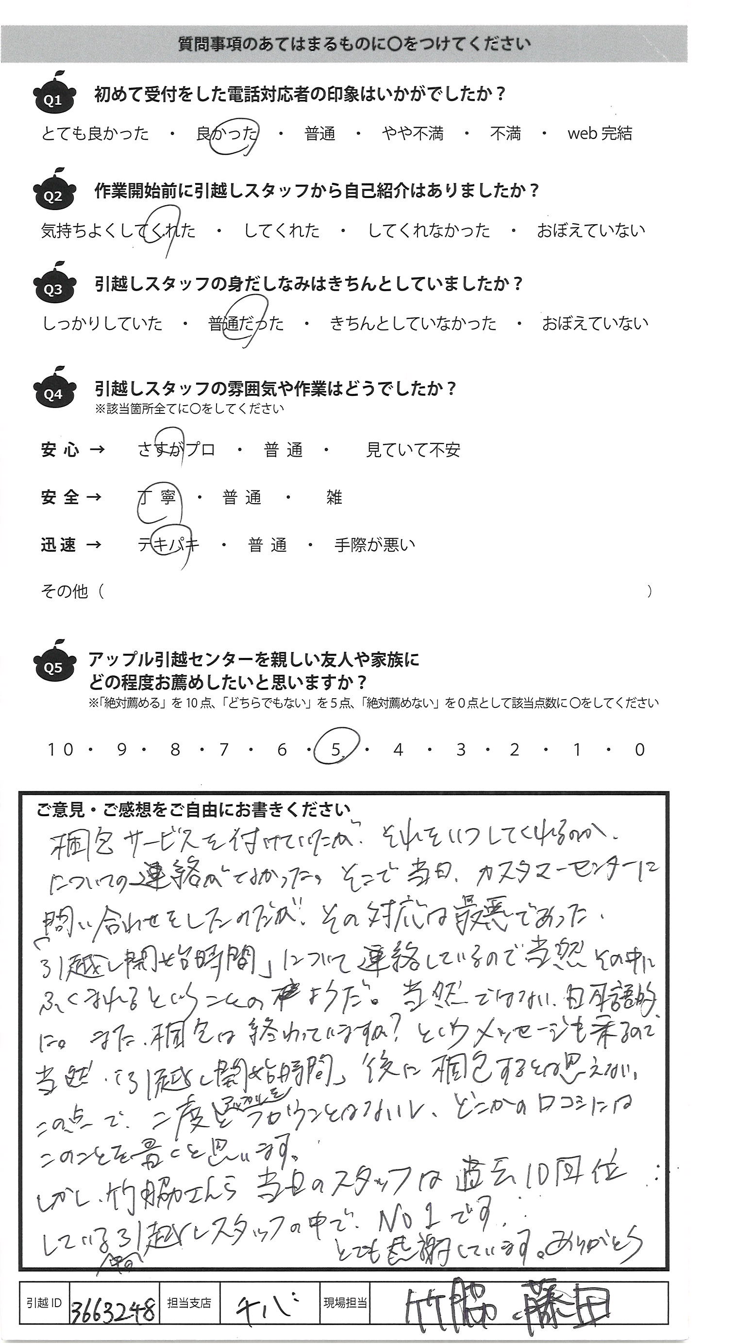 A.梱包サービスを付けていたが、それをいつしてくれるのか についての連絡がなかった。そこで当日、カスタマーセンターに 問い合わせをしたのだが、その対応は最悪であった 「引越し開始時間」について連絡しているので当然その中に ふくまれるということのようだ。当然ではない日本語的 に。また梱包は終わっていますか?というメッセージも来るので 当然「引越し開始時間」後に梱包するとは思えない。 この点で二度とアップルをつかうことはないし、どこかの口コミには このことを書くと思います。 しかし、竹脇さんら当日のスタッフは過去10回位 している中の引越しスタッフの中で、No1です。 とても感謝しています。ありがとう