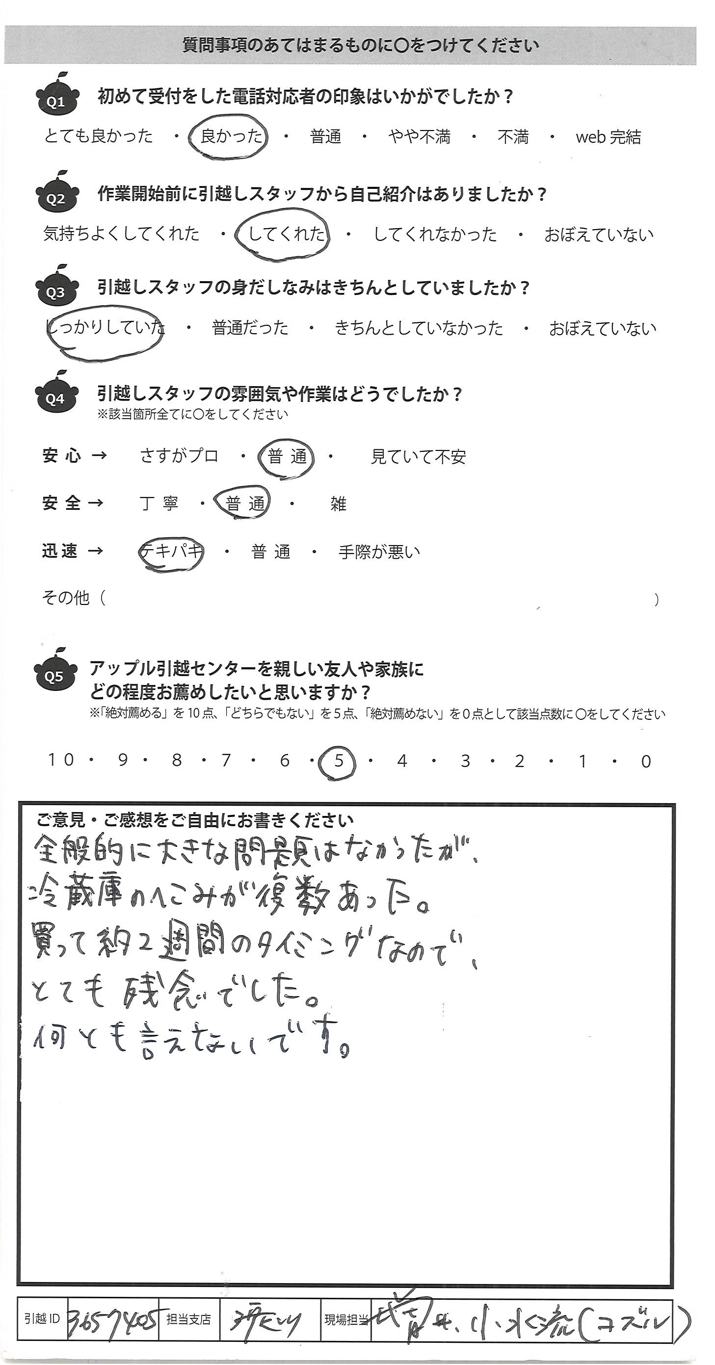 A.いただいたご意見のハガキにはリーダーの方の対応が良かったと記載させていただき、その通りで間違いないです。 でも、今後に役立つことを願い記載させていただきます。 来られたのが日曜日の9時前なのに隣のチャイムを鳴らしてしまわれ、他引っ越し業者さんのサービス「ご近所様へ引っ越し業者さんから挨拶と粗品」などのサービスだと思われたようで、申し訳ないのと恥ずかしい気持ちになりました。 しかもしばらく隣の家前にトラックを止めて作業し始められ、車を出すのに困惑されました。 洗濯機がドラム式洗濯機でした。 転居先では嵩上げをしないと設置できず、購入した大手電化製品店で来ていただきました。 どこの引っ越し業者でしょうか、と尋ねられました。 理由としては、水抜きされていない、排水ホースにゴミが詰まったまま、排水溝のゴミ避けも元の家に置きっぱなし、背部のネジがちゃんとできていない、このままだと故障の原因でした、など指摘をいただきました。 金属製の洋服掛けを階段から落とされ、これから売却の自宅であるのにもかかわらず床に新しい凹みができていました。 持ち出す物も、聞いていない物がある、新居の部屋番号も聞いていない、と仰られていました。あれだけの量を2人というスタッフさんの人数にも驚きました。 サブの方も、経験が浅いイメージでリーダーさんが全て声掛けでロスを感じました。段ボールがあれだけの量があるのにも関わらず2名というのは、こちらにも余裕がないのが伝わり、あまり良い気持ちになれない部分が多々見受けられました。リーダーの方は、頑張って動いてらっしゃるので常に汗だくで床や階段に汗がこぼれ落ちていました。頑張ってくれてますが汗が落ちた床を不快に思わないわけがないのはご理解していただきたいです。 小さいことですが、普通に使ってガムテープは全然足りませんでした。 料金で考え妥協できる部分と、そうではないでしょう、と思ってしまう部分があります。 どうか、今後にお役立てていただければ幸いです。この度はお世話になりました。ありがとうございました。