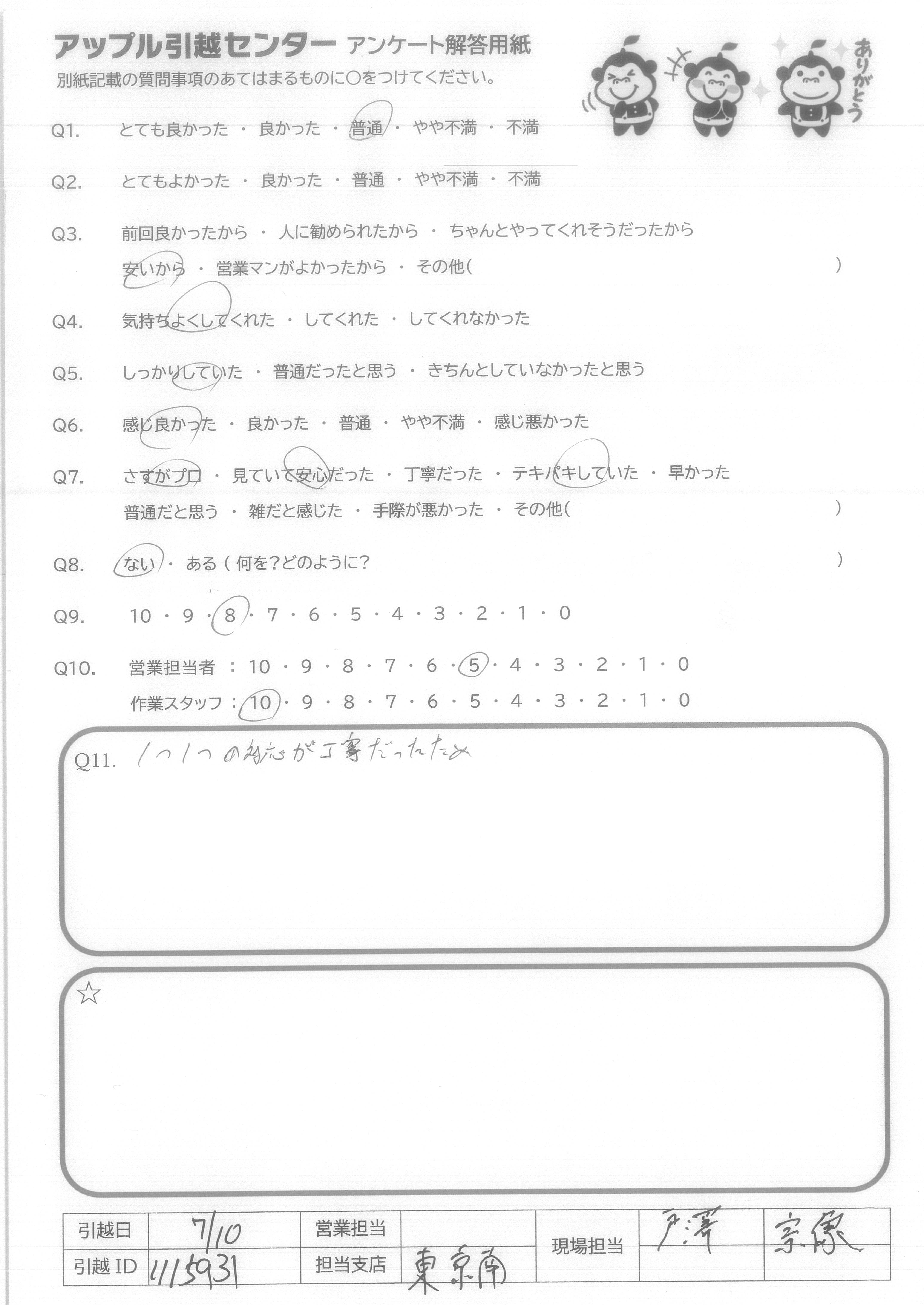 A.リーダーの戸澤さんには気の利いた柔軟な対応をして頂いて気持ちよく引越しできました.ありがとうございました.