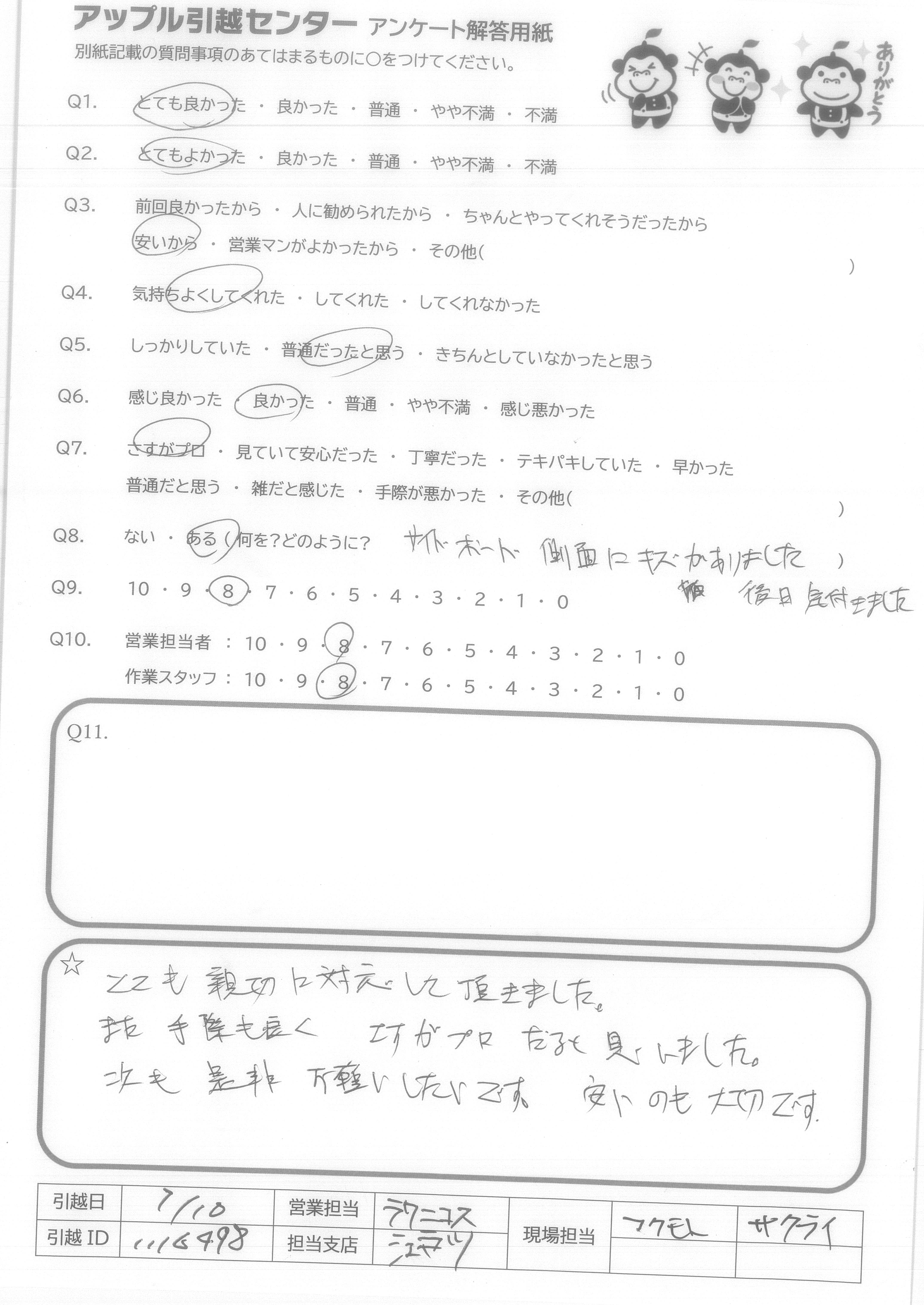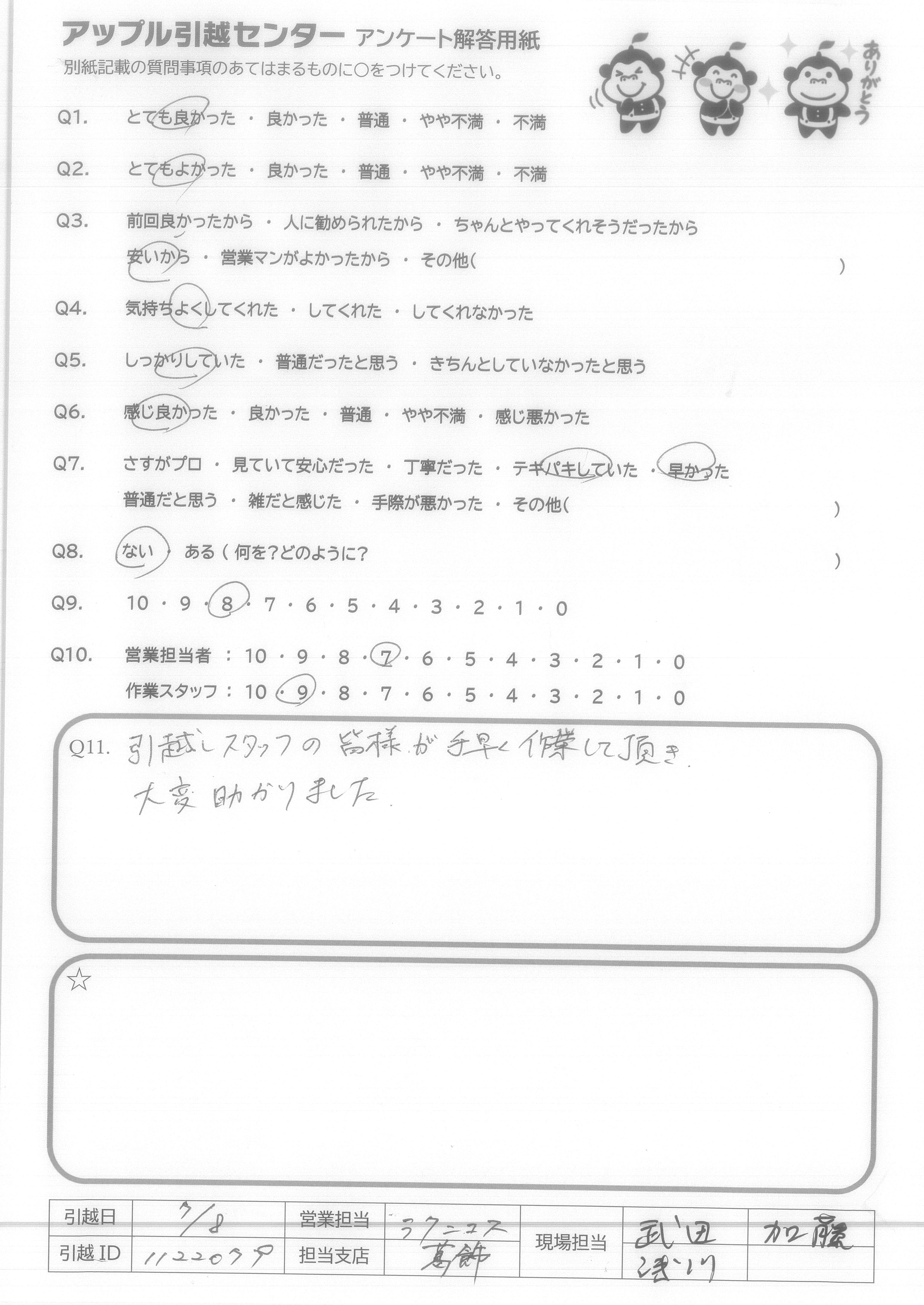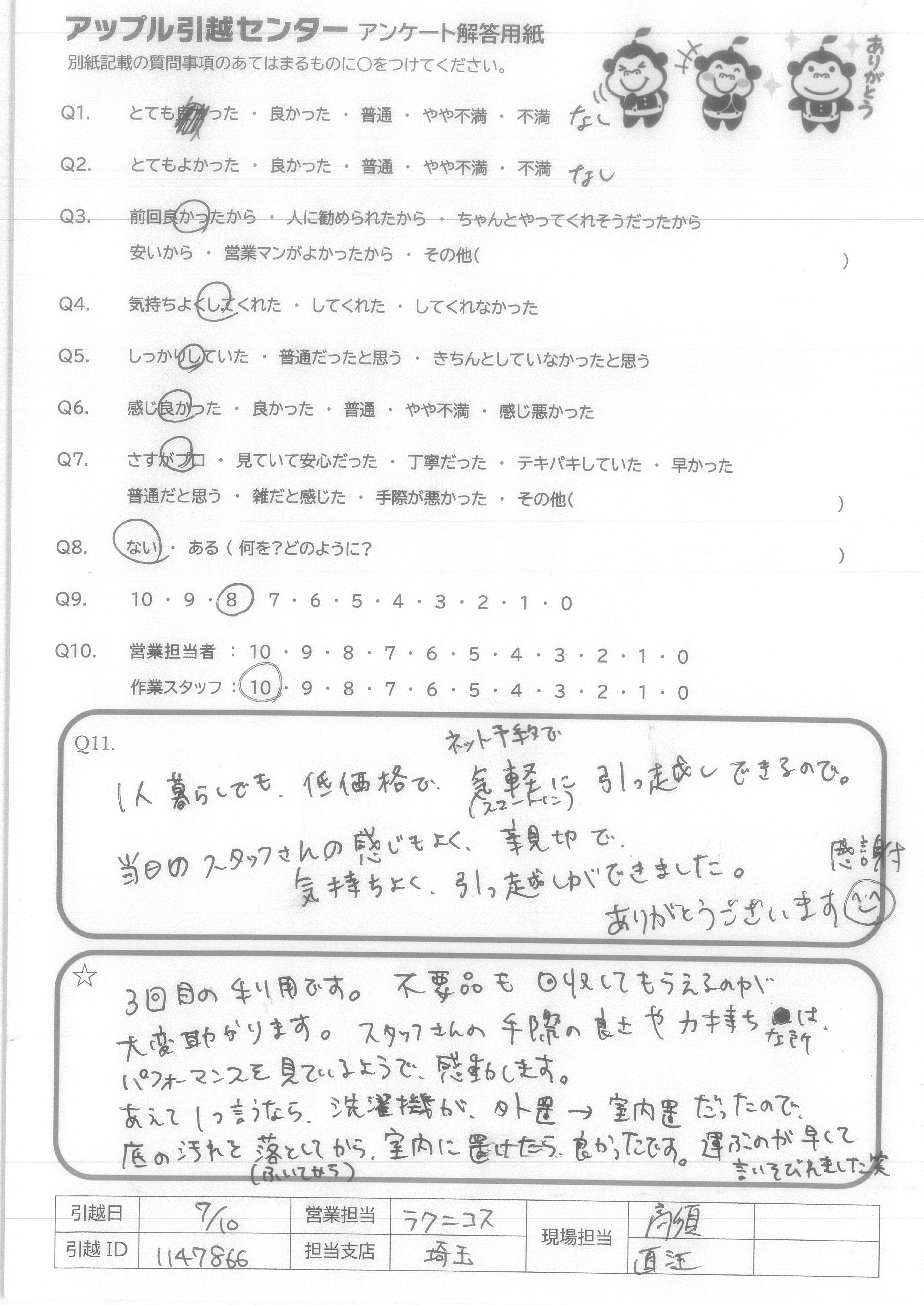 A.今回は、暑い中、荷物も多かったのに、作業していただきありがとうございました。 旧住宅では玄関先のゴミも、ゴミ収集の場所にまで運んでいただいたり、新住居では(依頼していたのだが)家の家具を下まで運んでいただき、本当に助かりました。ありがとうございました。 そのような連絡もちゃんと連携がとれていて良かったのですが、不用品に関して (”当日でも不用品対応可”と書いてあって)前日にメールで1品追加(2品不要)の件が伝わって無くて、当日1品増えた事に関しての対応が心良い対応じゃなかったのが残念だった(ひきとってはもらったが。)不安や相談をメールできる事はとてもよかった。ありがとうございました。お世話になりました。