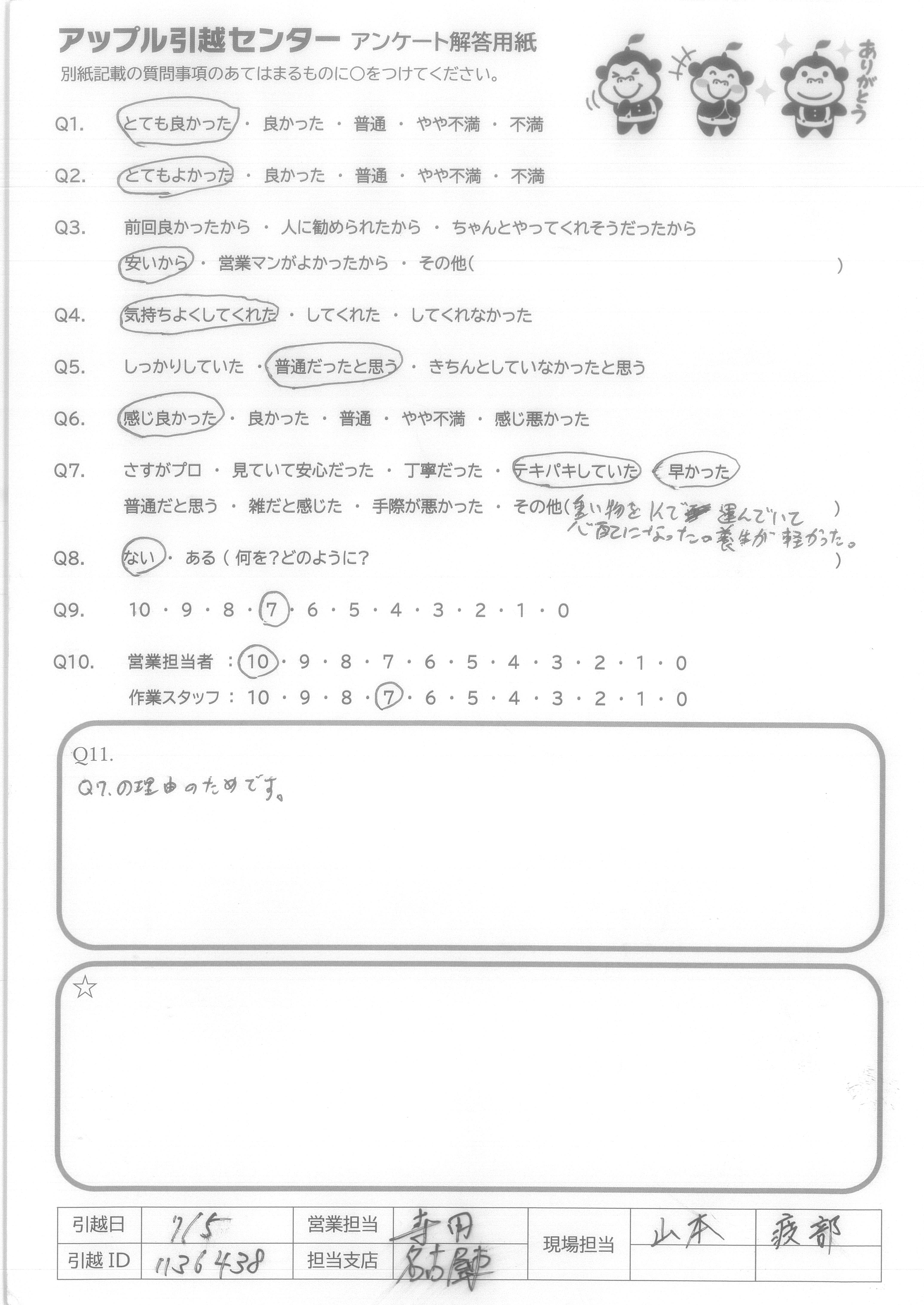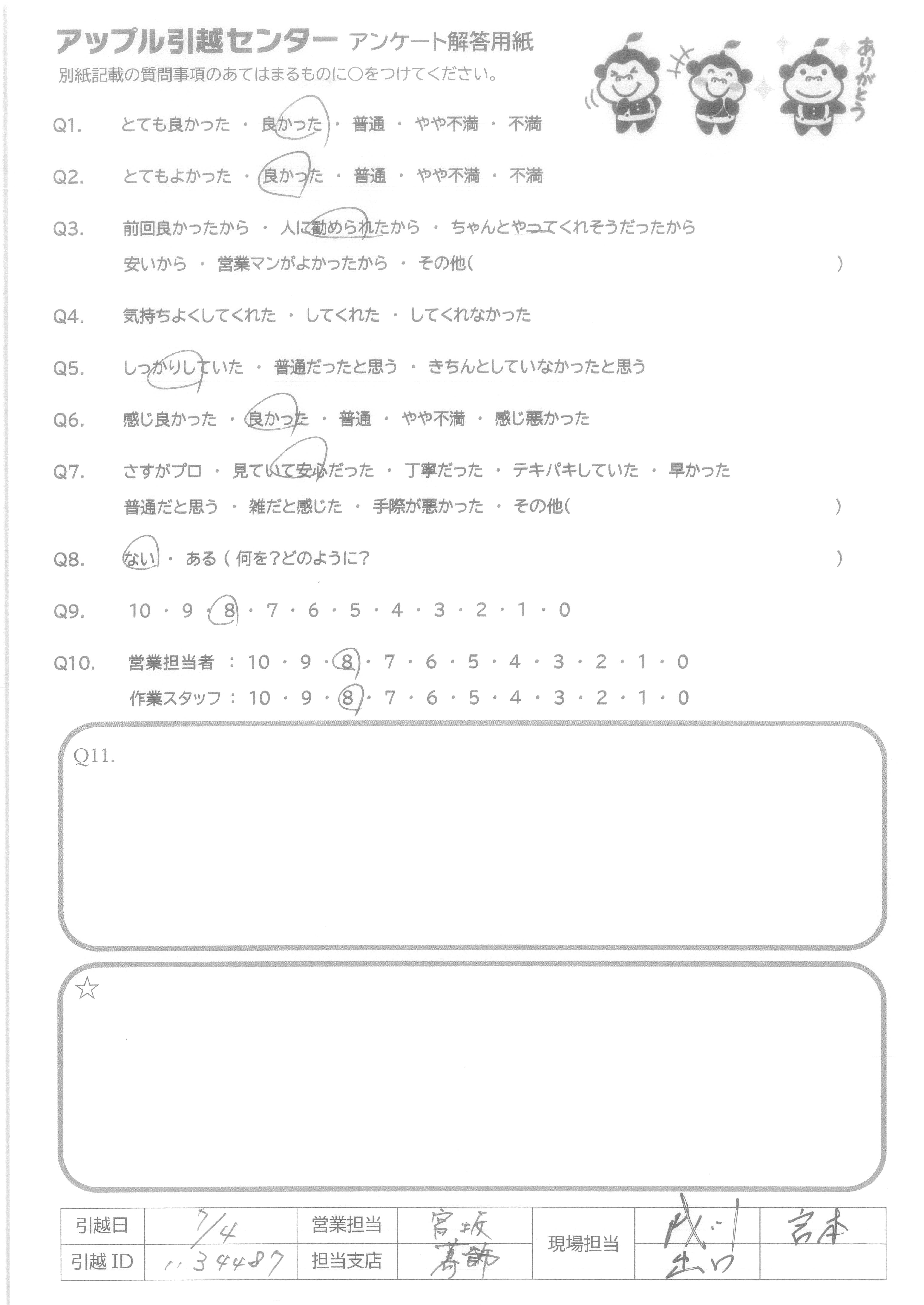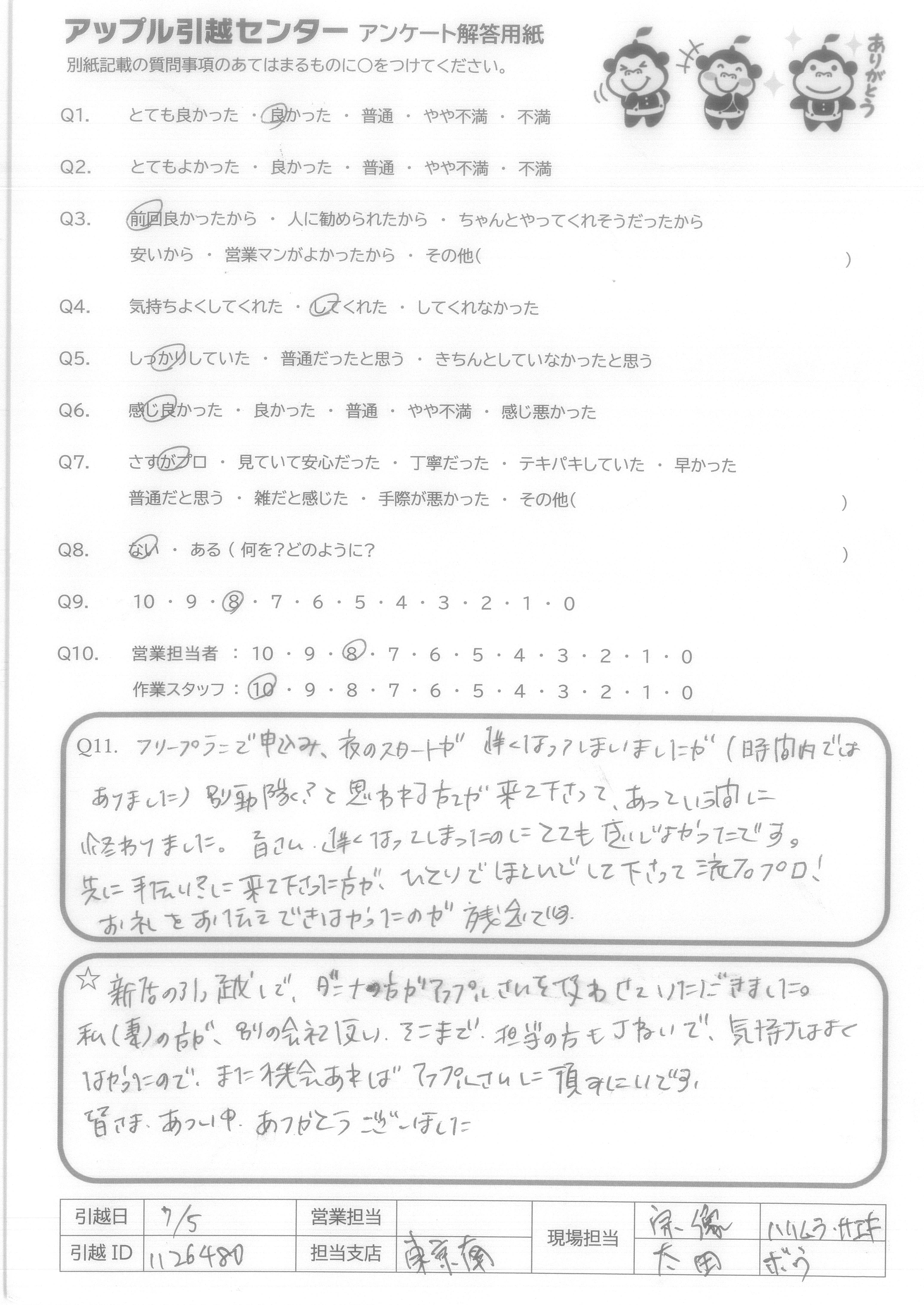 A.全体的にはとても良かったです。 引っ越し当日までのスムーズな見積もり・チャットのやり取り・当日の対応能力◎ 残念だったのは、お届け日を「フリー便」にしていたのですが、いつ引っ越し荷物が届くかの連絡が引っ越し先の事業所の担当者さんから電話がなく、こちらから問い合わせたことです。3日前に電話をいただくルールとのことでしたが、すでに届け目安はわかっていたようでしたので、単なる連絡漏れでした。大雨災害が九州地方でも起きていた時期でしたので、災害時などは臨機応変にいつ届けるかのご連絡をくれた方が安心すると思いました。また、6日〜12日のどこかで引き取り対応とのことで控えの書類をもらっておりましたが、いつ届くのか電話で確認したところ、「6日〜12日or13〜18日までの何処かでお届けで許可をしていただいているようです。」と、聞いたことがない期間を電話で告げられ、少々心配になりました。結果的には、申し込み通りの12日に届けてくださったのですが、いつ猶予をもった配達に許可をしたのか、お話しした覚えがなかったので謎のままでした。 引っ越し当日は暑い中嫌な顔ひとつせず対応してくださり、感謝しています。オペレーションを見直していただければまた利用させていただきたいと思います。 ありがとうございました。