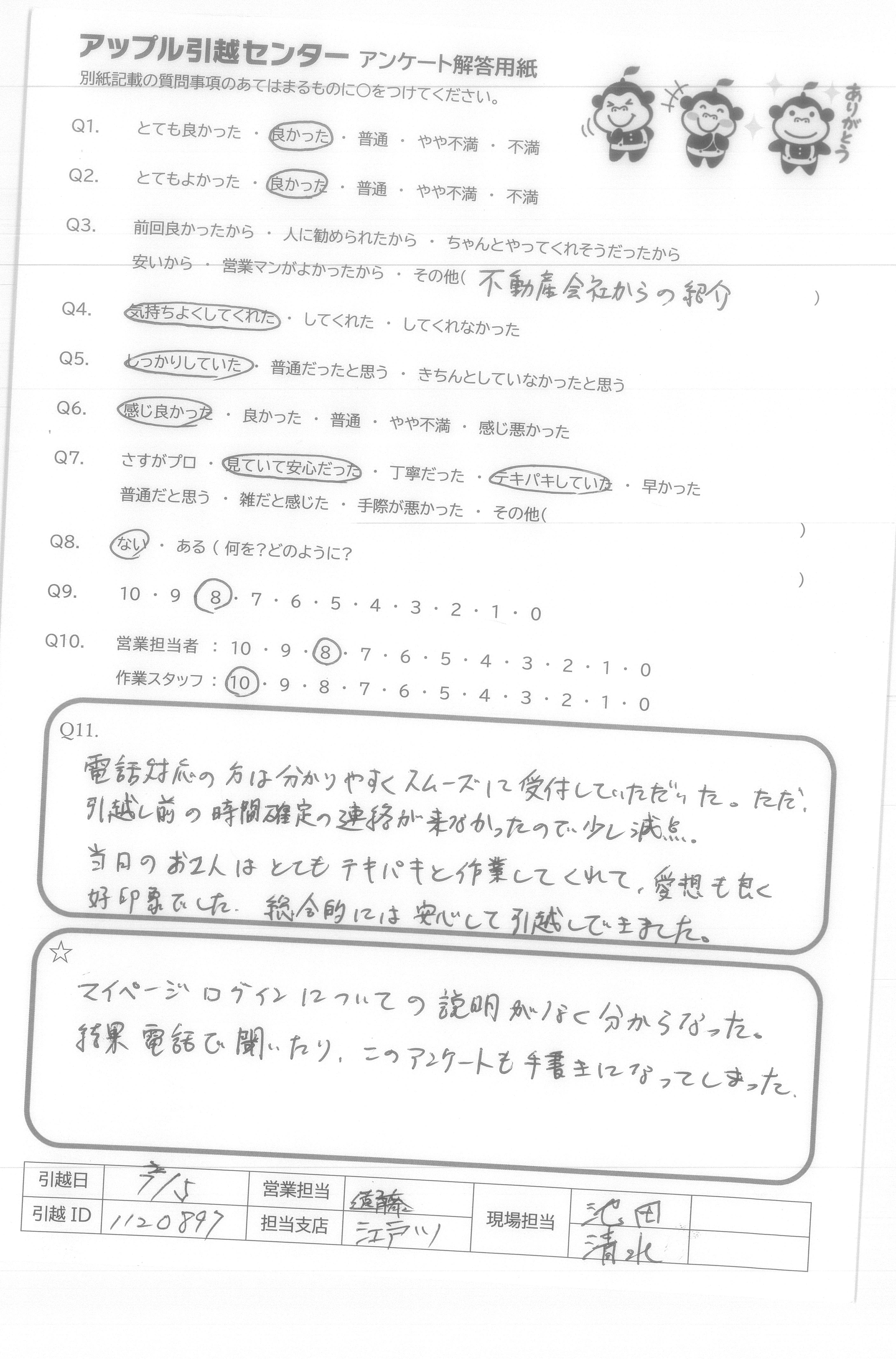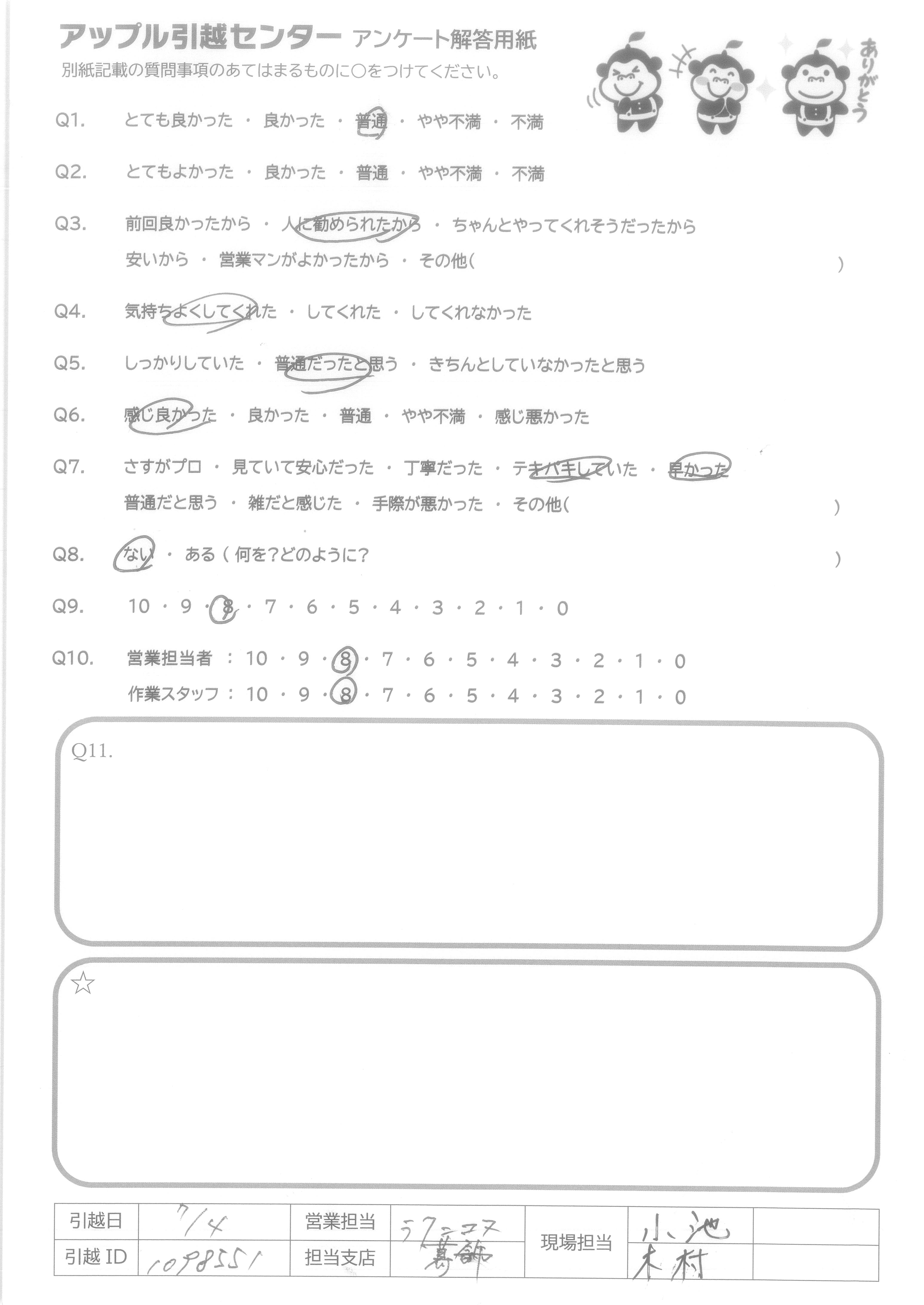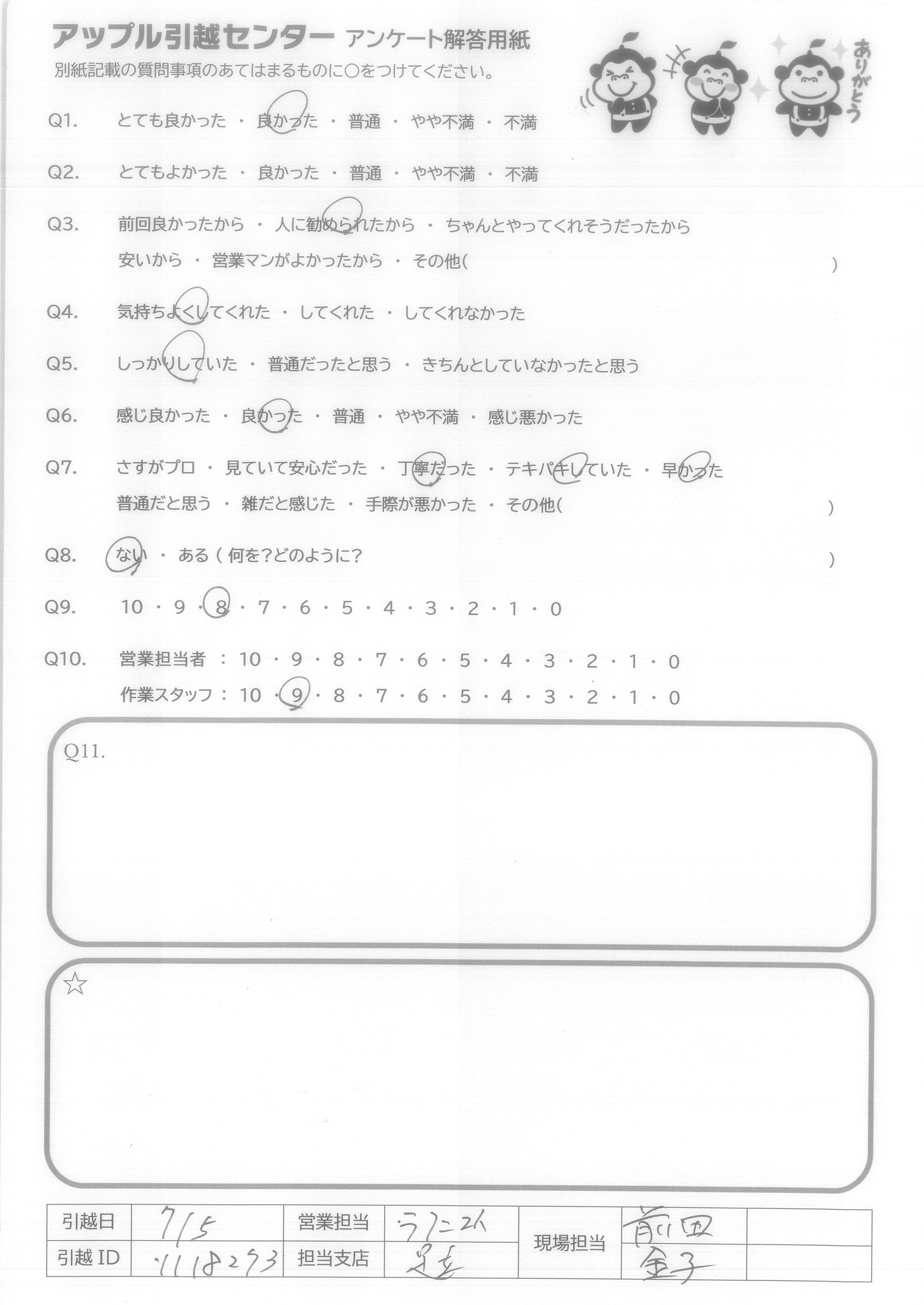 A.全体的にはとても良かったです。 引っ越し当日までのスムーズな見積もり・チャットのやり取り・当日の対応能力◎ 残念だったのは、お届け日を「フリー便」にしていたのですが、いつ引っ越し荷物が届くかの連絡が引っ越し先の事業所の担当者さんから電話がなく、こちらから問い合わせたことです。3日前に電話をいただくルールとのことでしたが、すでに届け目安はわかっていたようでしたので、単なる連絡漏れでした。大雨災害が九州地方でも起きていた時期でしたので、災害時などは臨機応変にいつ届けるかのご連絡をくれた方が安心すると思いました。また、6日〜12日のどこかで引き取り対応とのことで控えの書類をもらっておりましたが、いつ届くのか電話で確認したところ、「6日〜12日or13〜18日までの何処かでお届けで許可をしていただいているようです。」と、聞いたことがない期間を電話で告げられ、少々心配になりました。結果的には、申し込み通りの12日に届けてくださったのですが、いつ猶予をもった配達に許可をしたのか、お話しした覚えがなかったので謎のままでした。 引っ越し当日は暑い中嫌な顔ひとつせず対応してくださり、感謝しています。オペレーションを見直していただければまた利用させていただきたいと思います。 ありがとうございました。