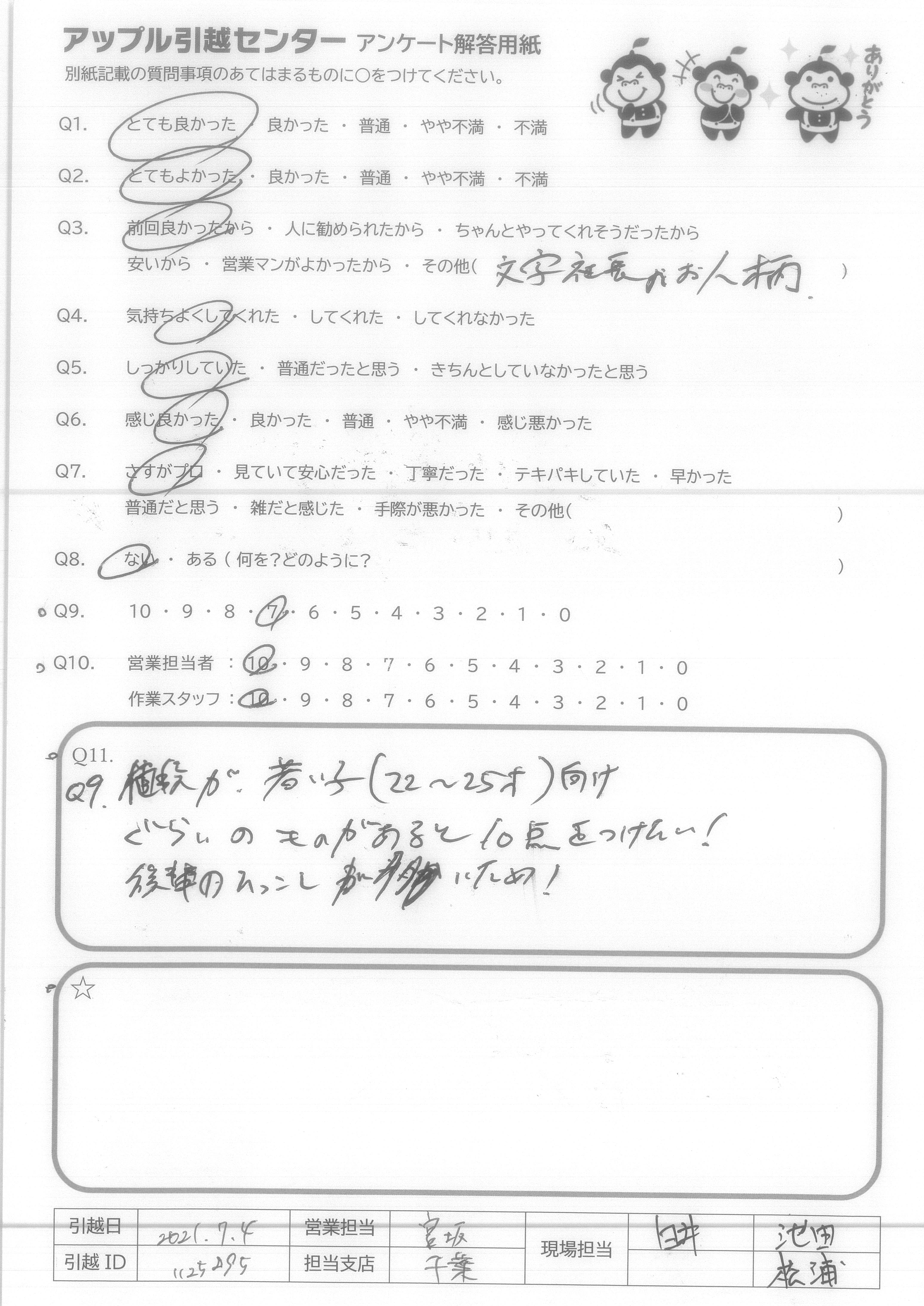 A.Q9、値段が若い子(22~25才)向けぐらいのものがあると10点をつけたい! 後輩のひっこしが多いため!!