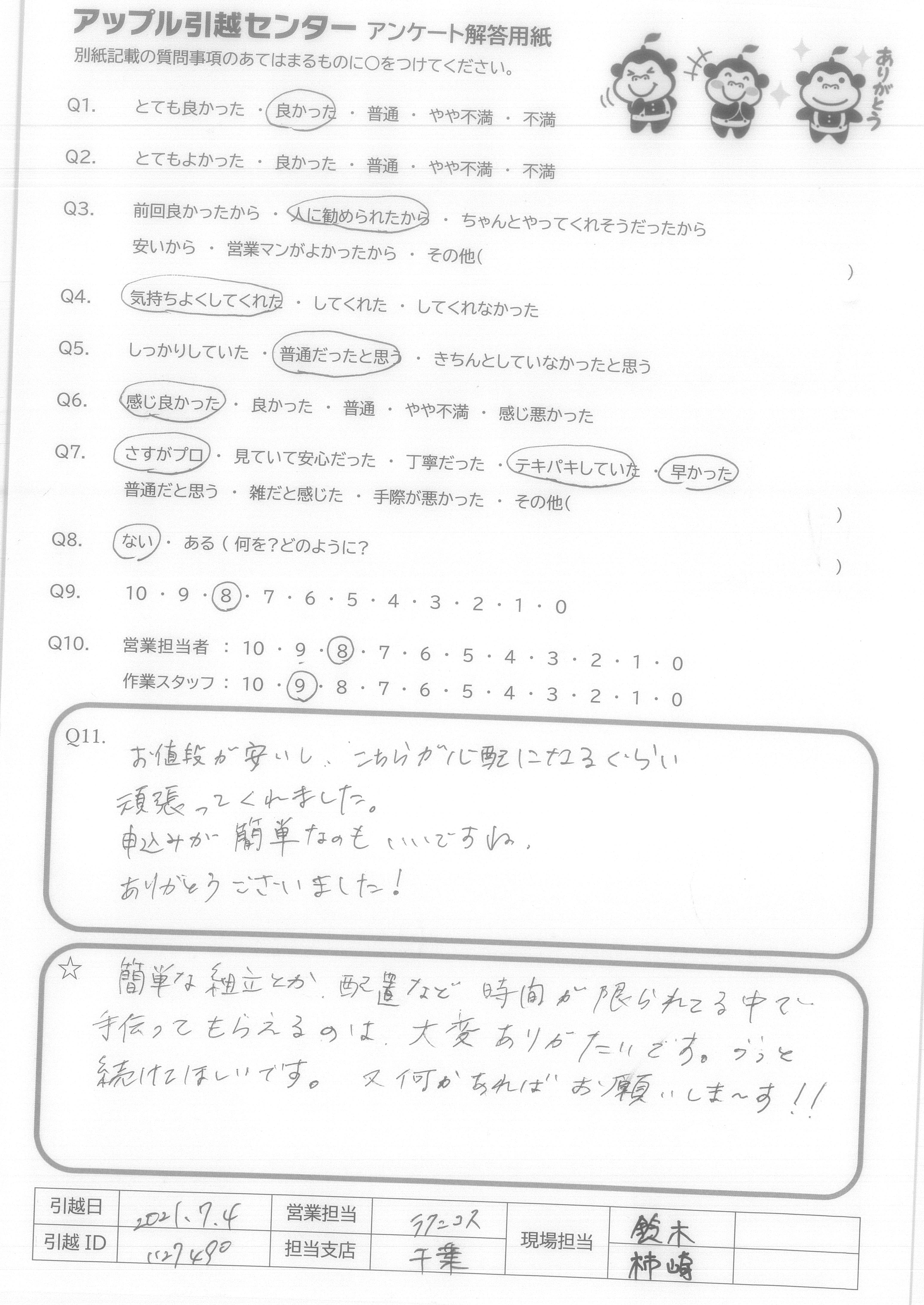 引越し日:2021年07月04日 エリア:千葉県船橋市