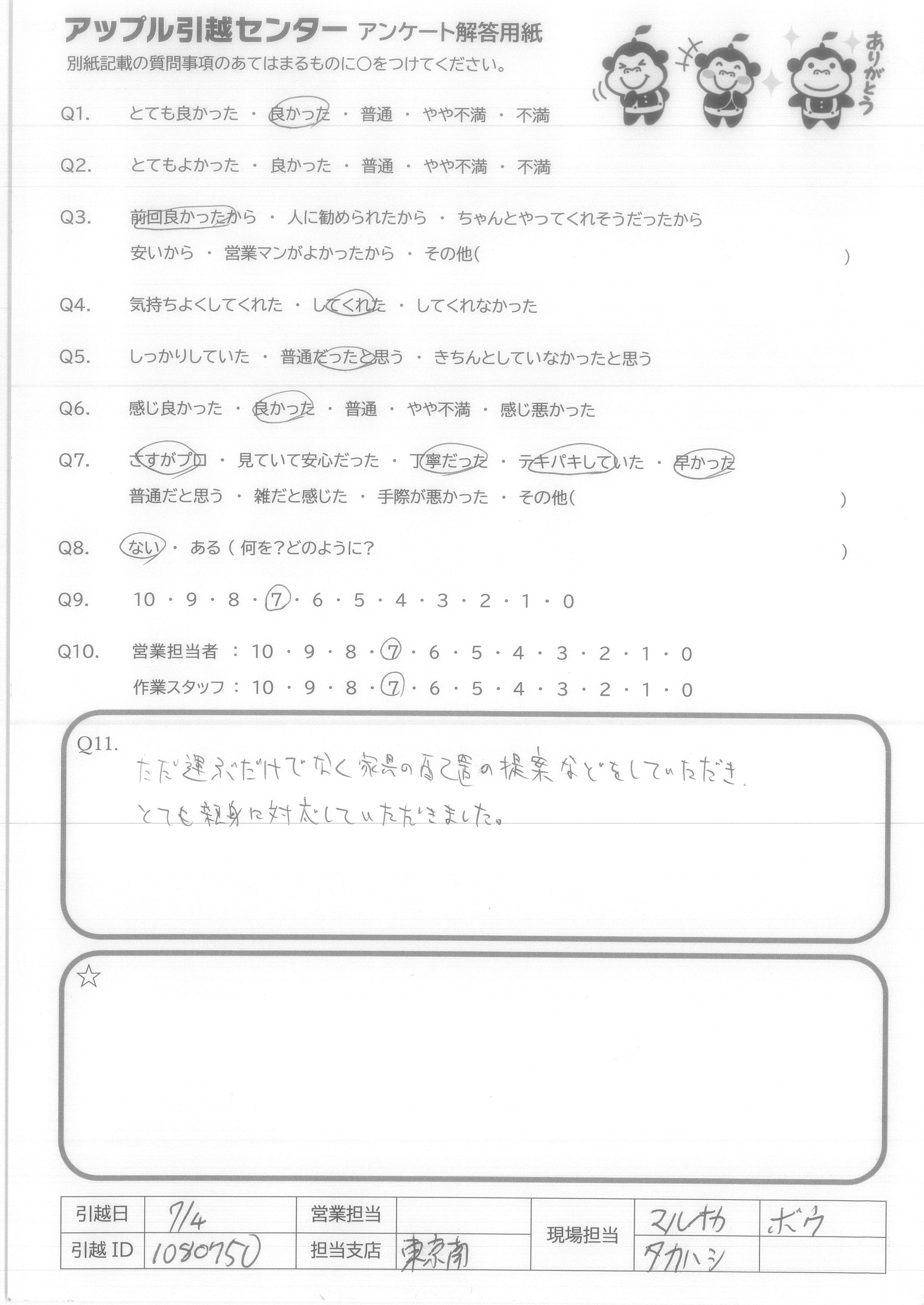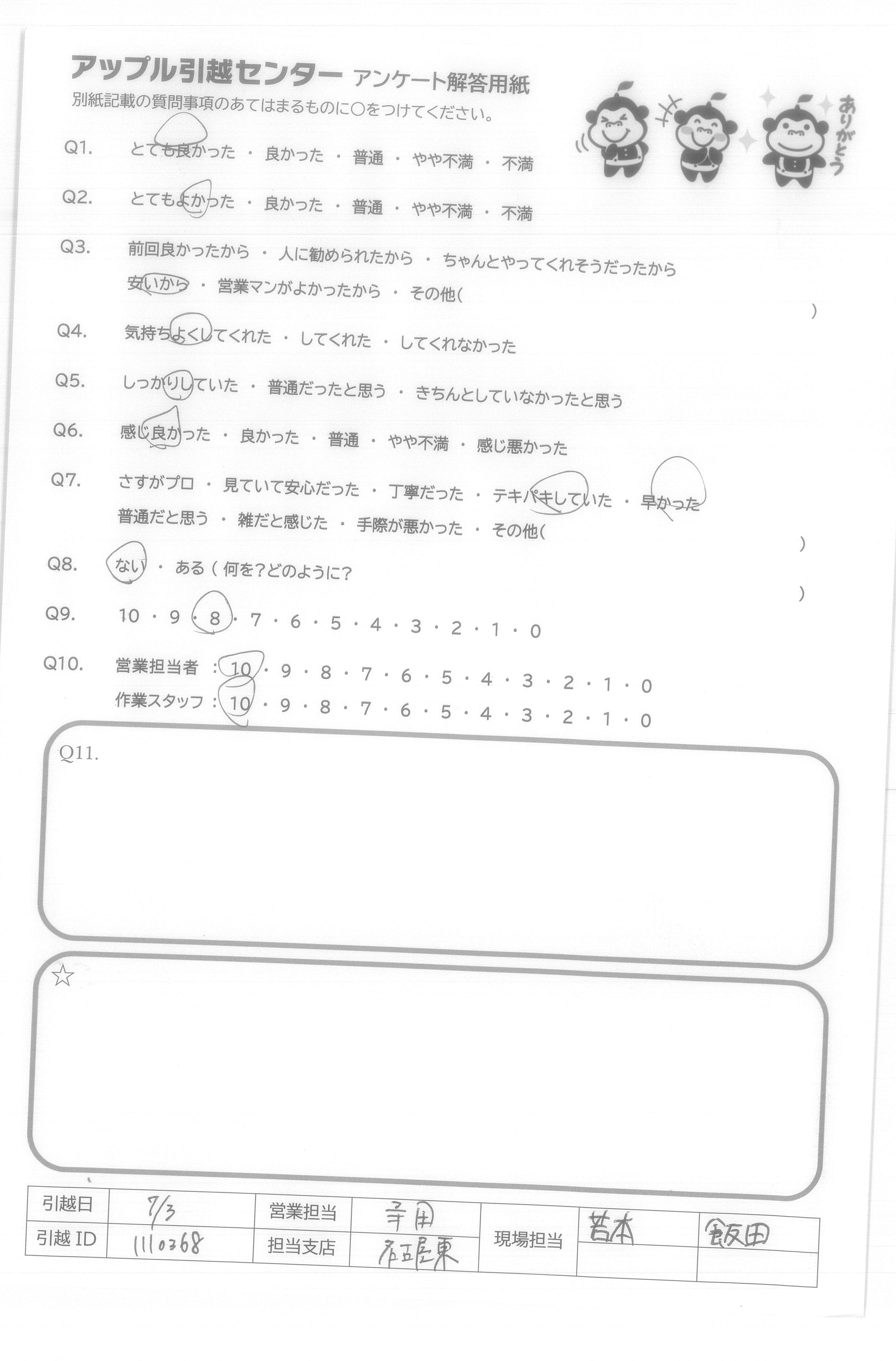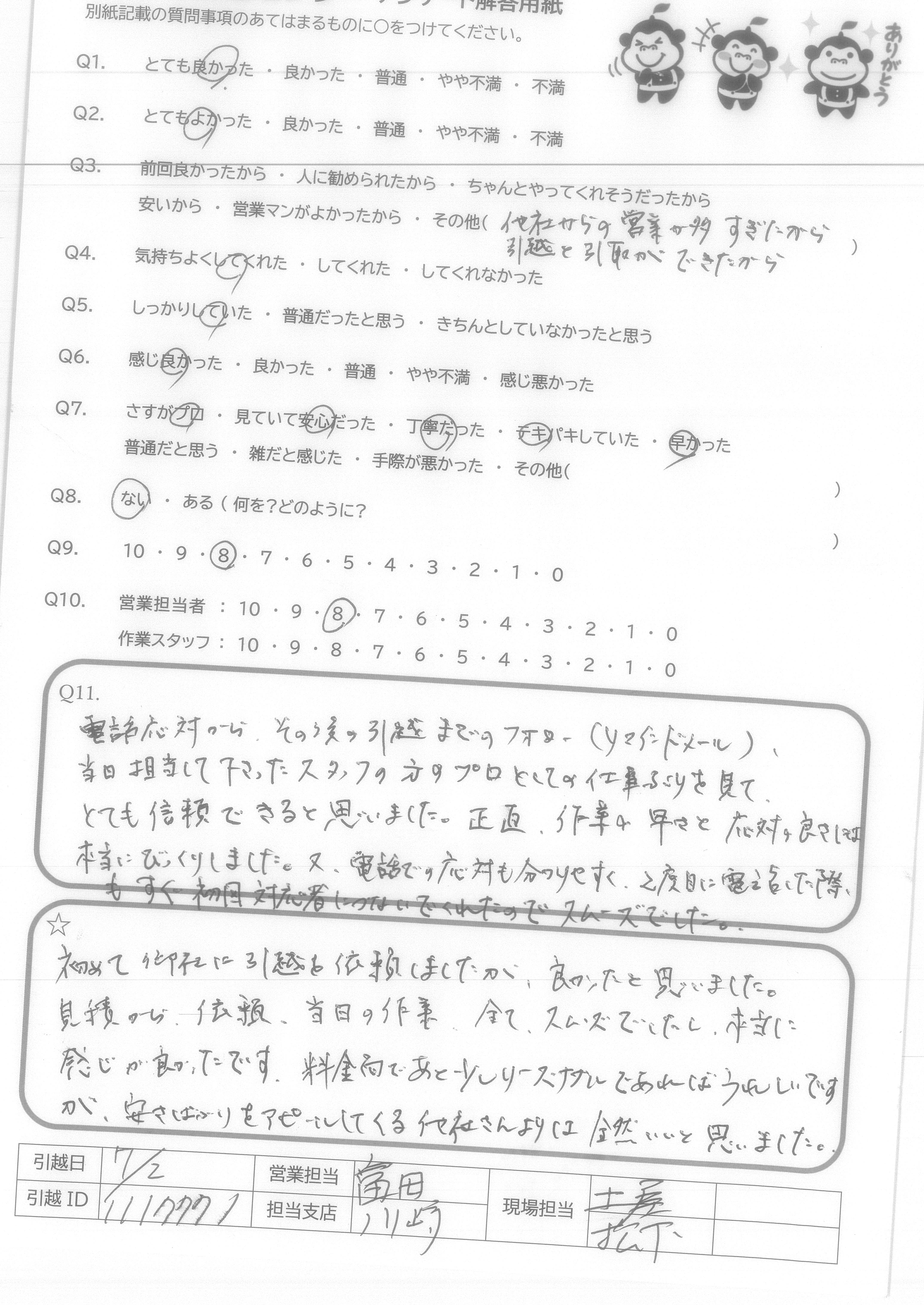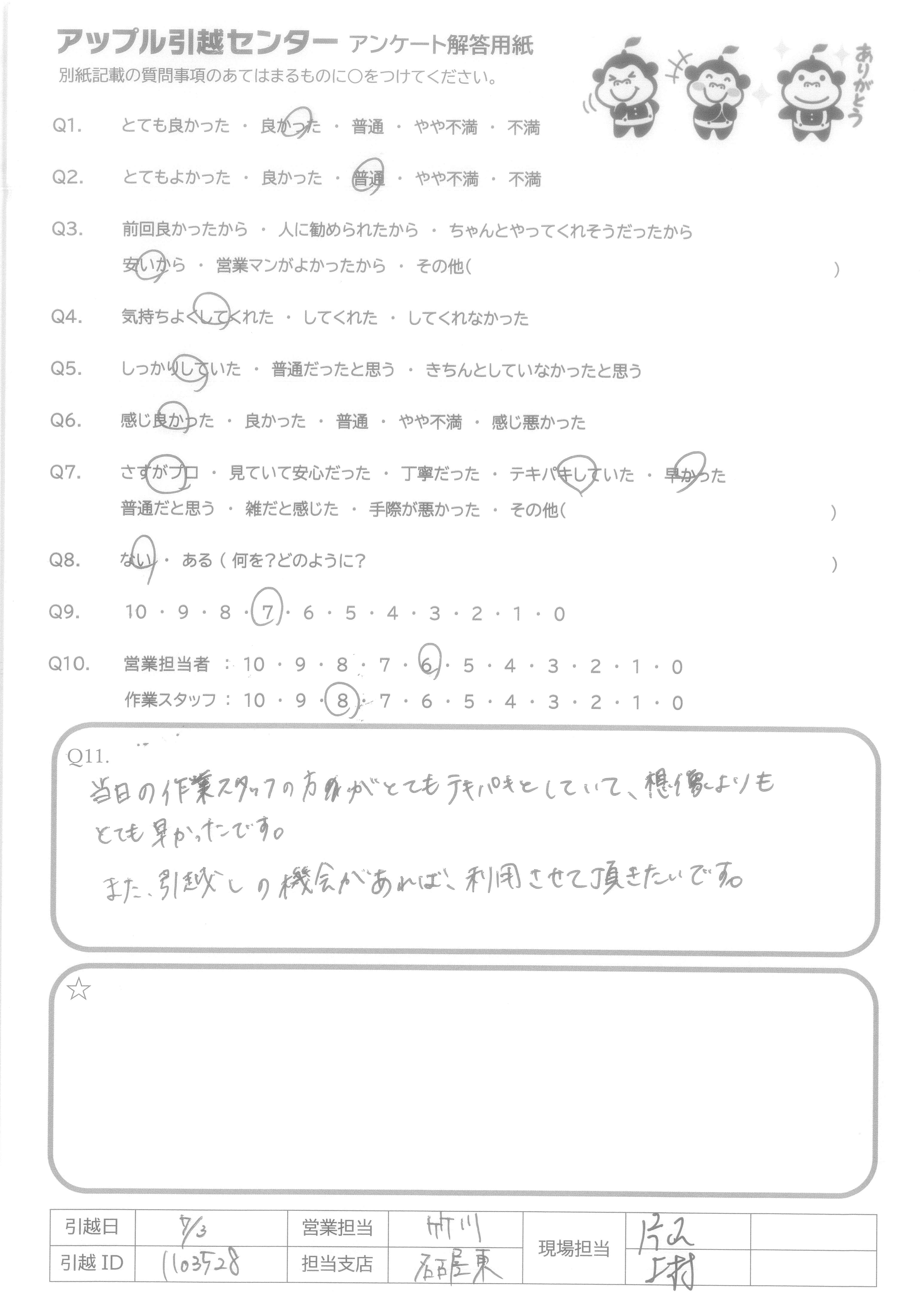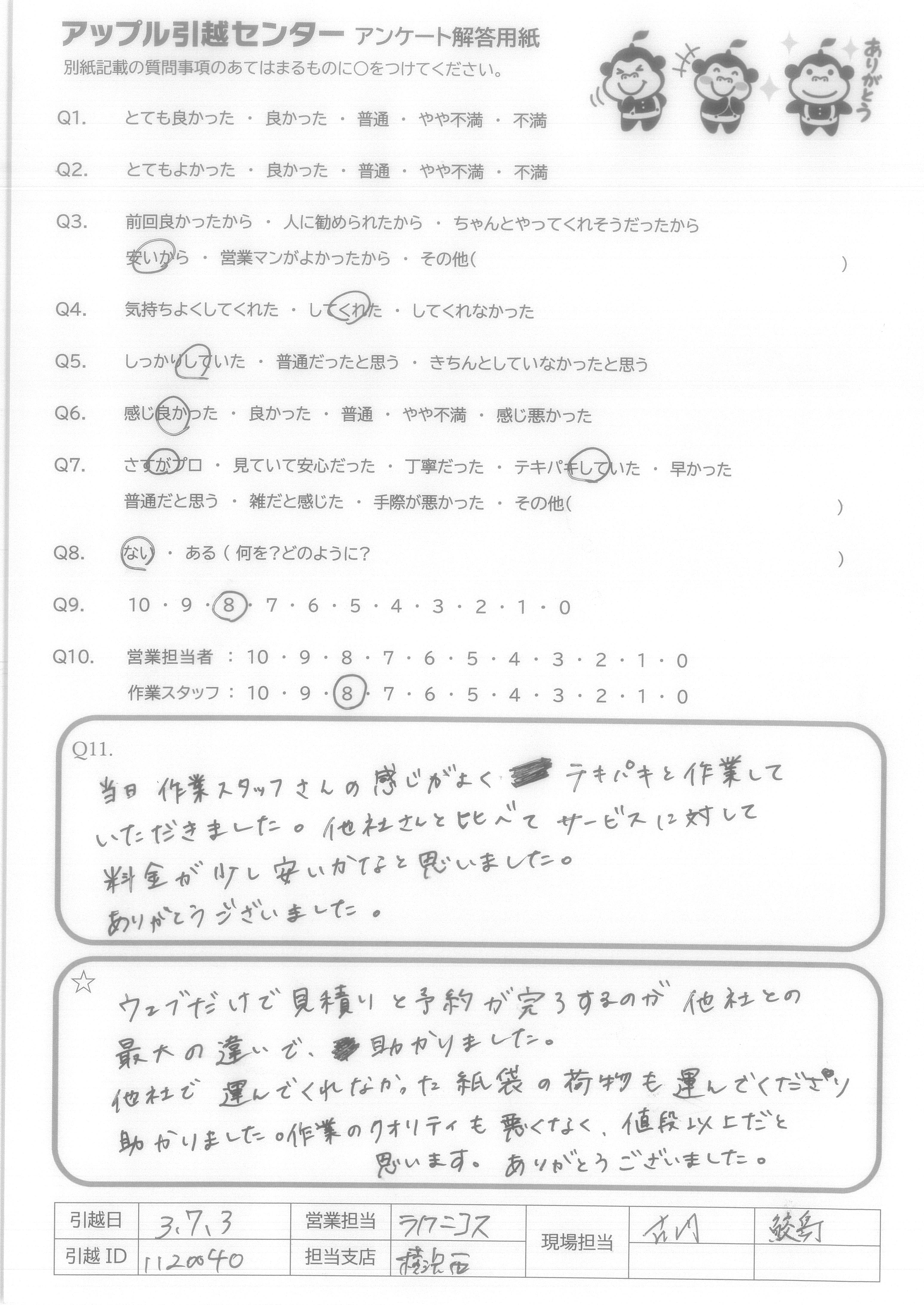 A.当日作業スタッフさんの感じがよく、テキパキと作業していただきました。他社さんと比べてサービスに対して料金が少し安いかなと思いました。 ありがとうございました。
