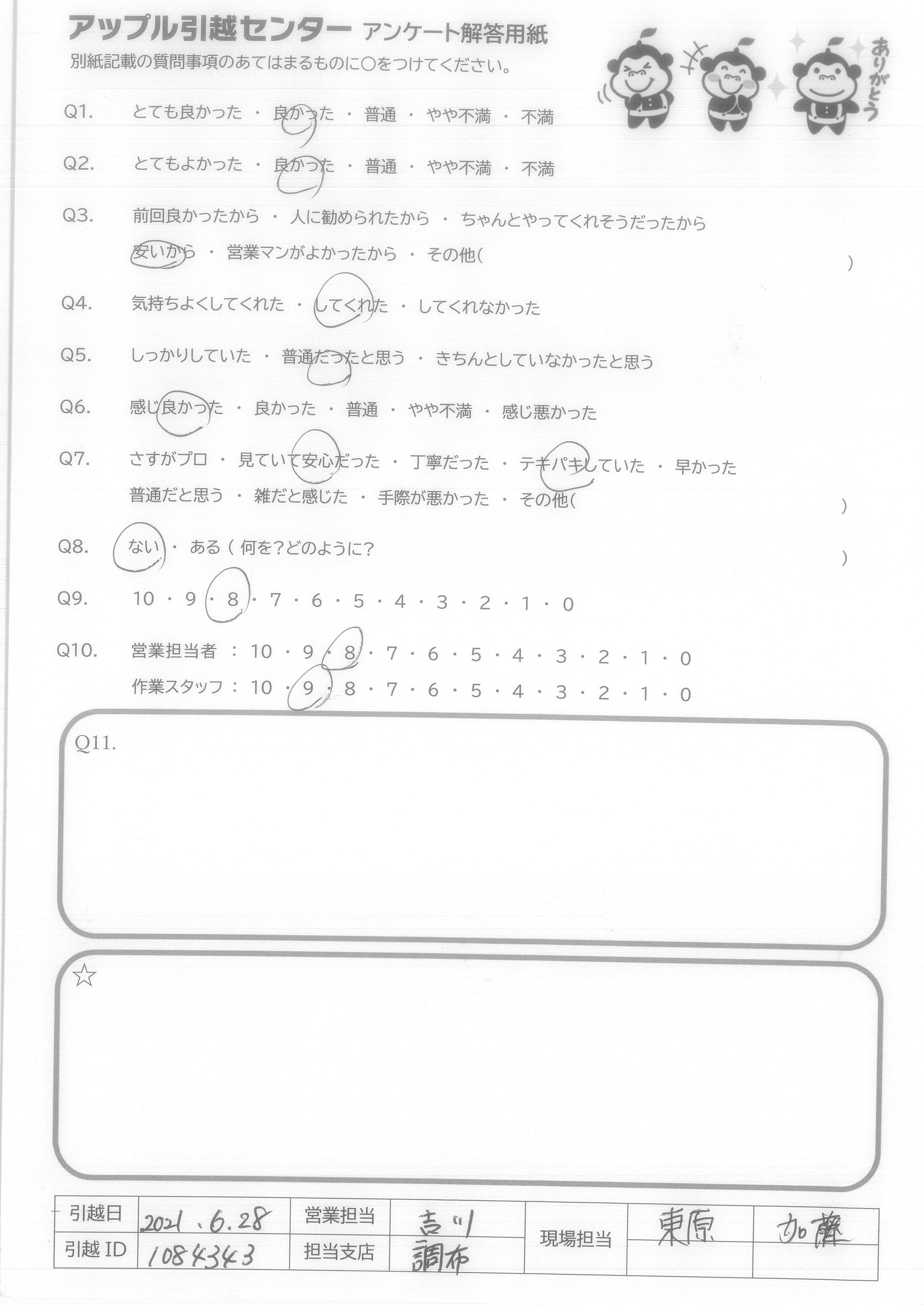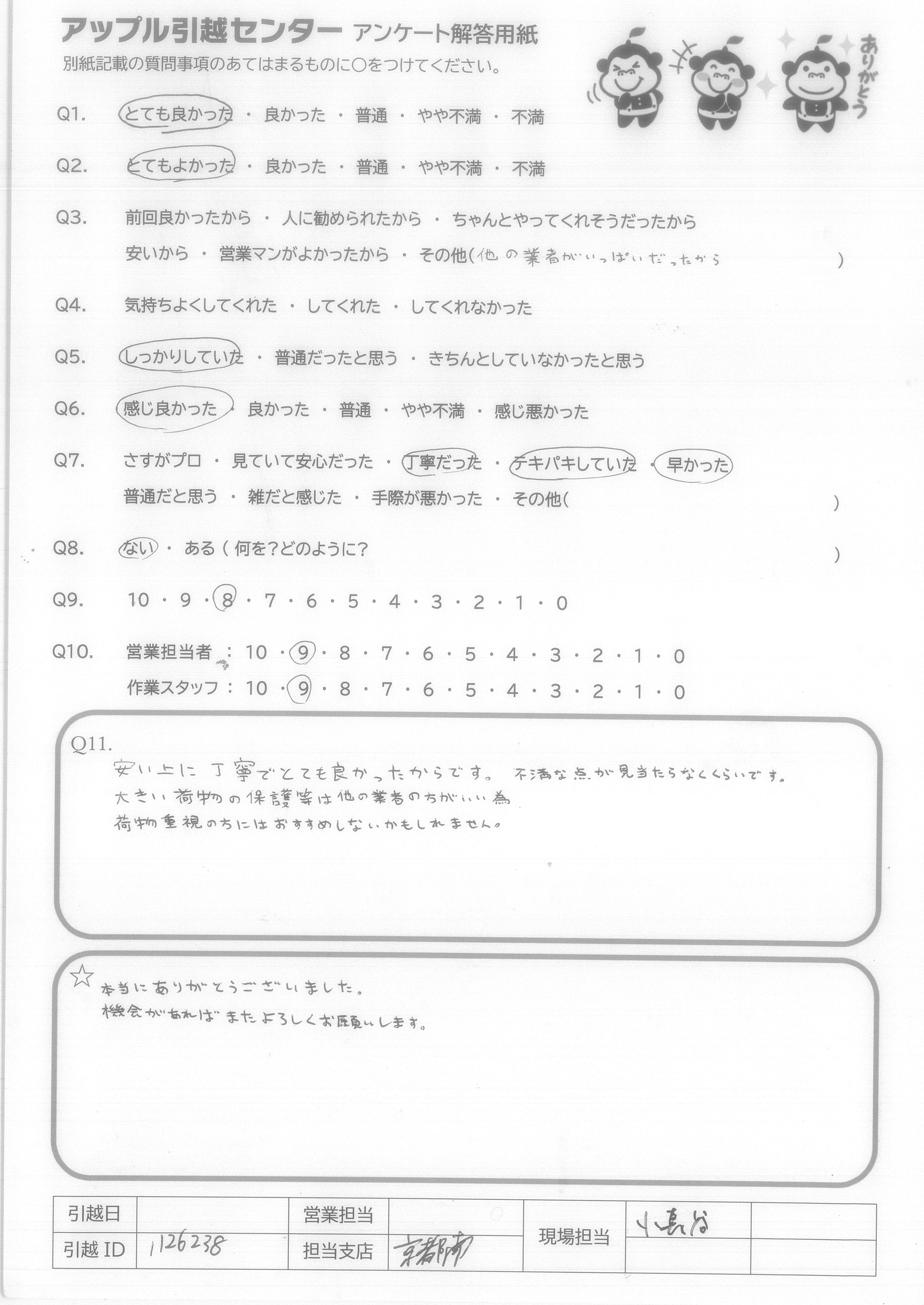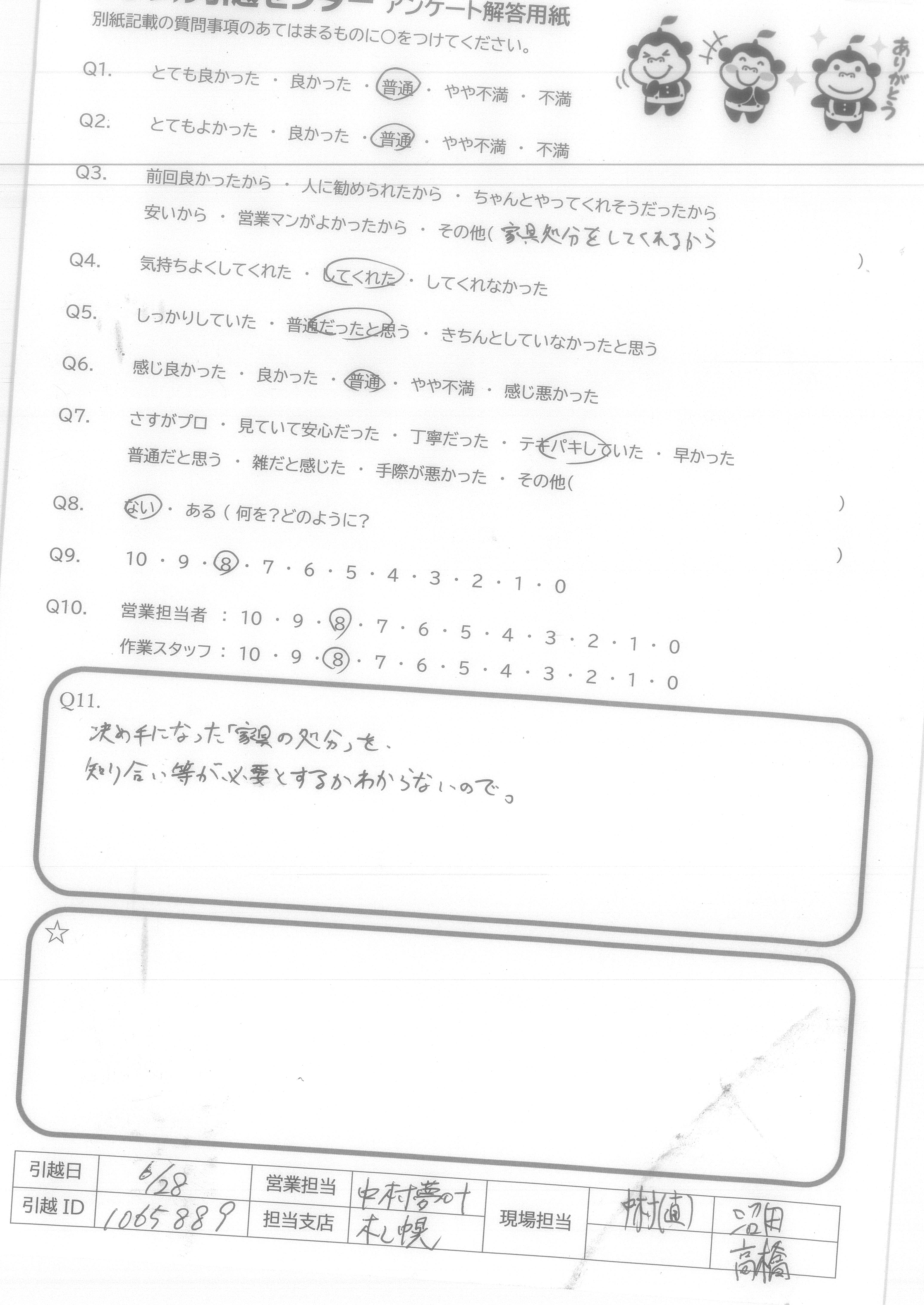 A.不用品の回収は、すごく助かりました。また、引越し直前まで、変更の要望を快くお引き受けいただきまして、ありがとうございました。 スタッフの皆さんの作業もスピーディでした。感謝いたします。