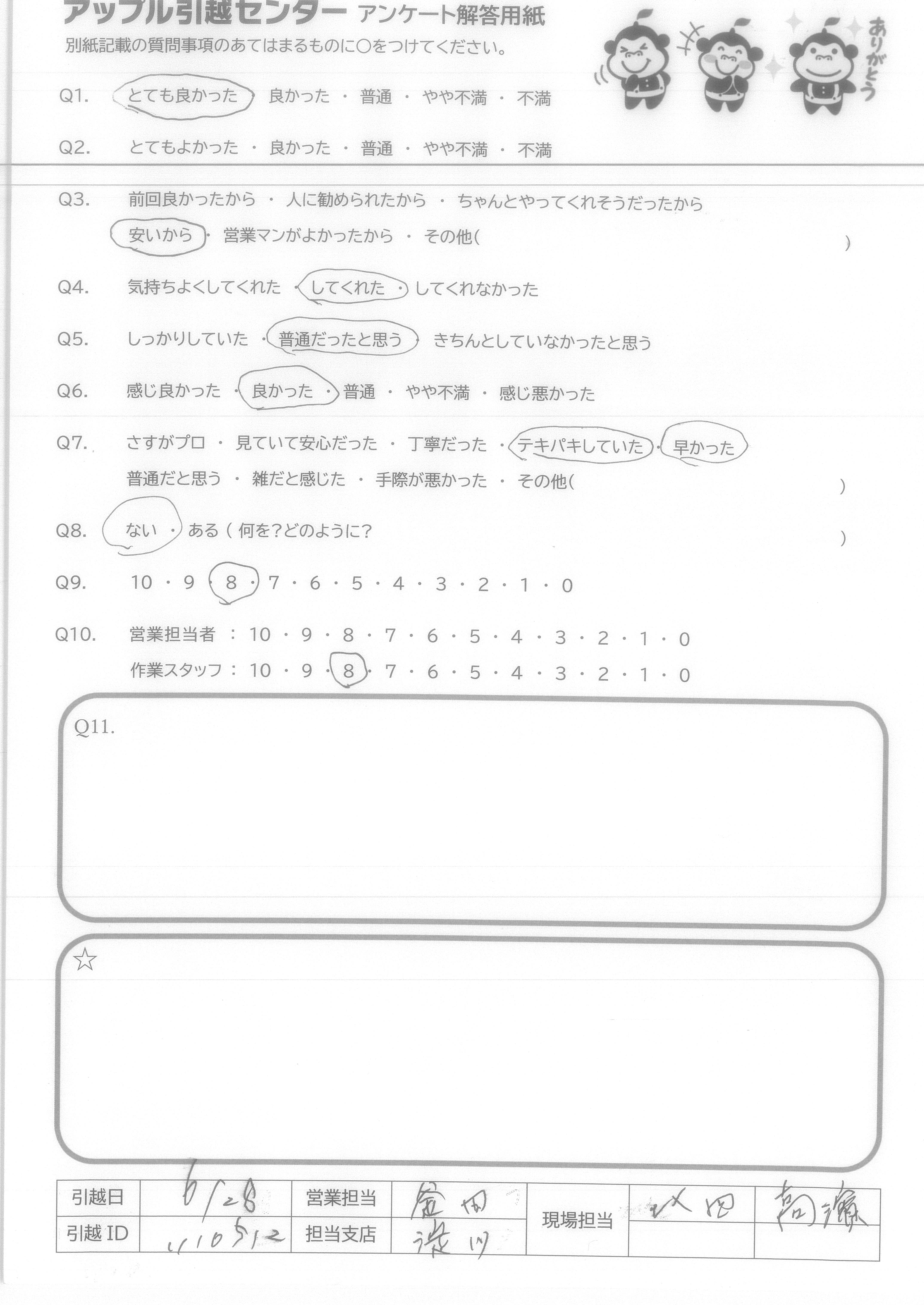 A.今回担当していただいた方は、テキパキしていて雰囲気も良く、特に問題もなく、スムーズに短時間で引越しがおわりました。 他の方にも安心してお薦めできます。