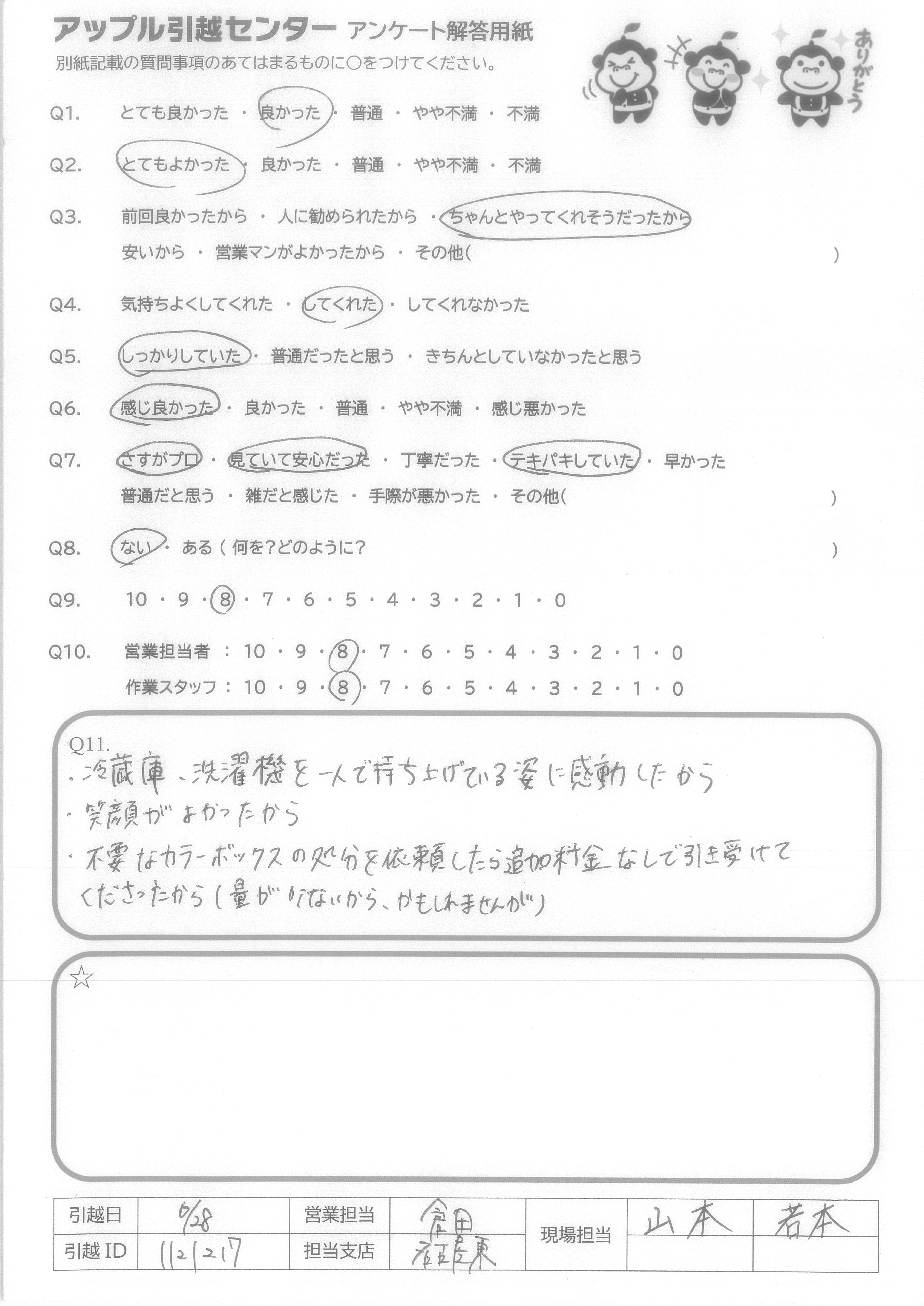 A.・冷蔵庫、洗濯機を一人で持ち上げている姿に感動したから ・笑顔がよかったから ・不要なカラーボックスの処分を依頼したら追加料金なしで引き受けてくださったから(量が少ないから、かもしれませんが)