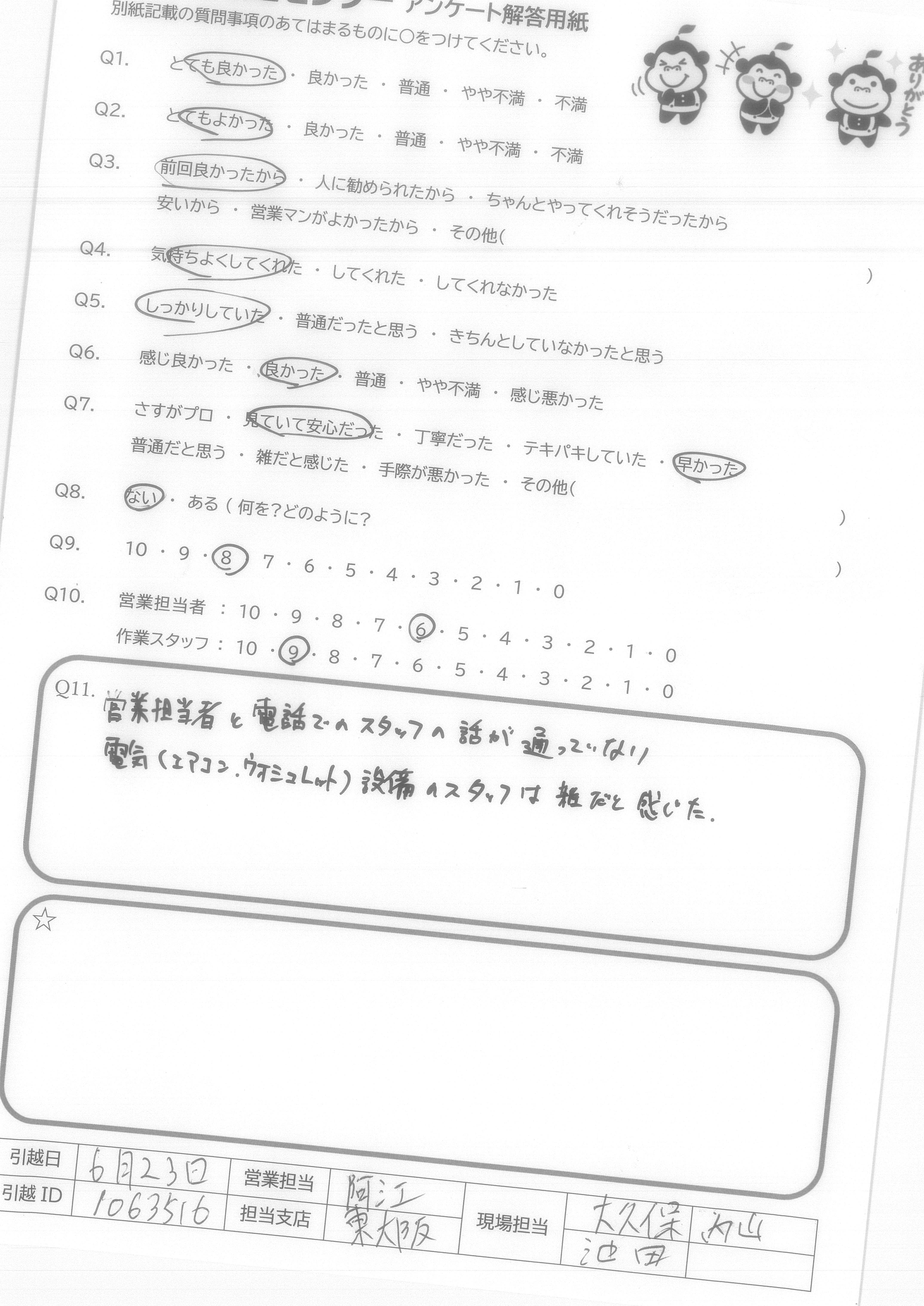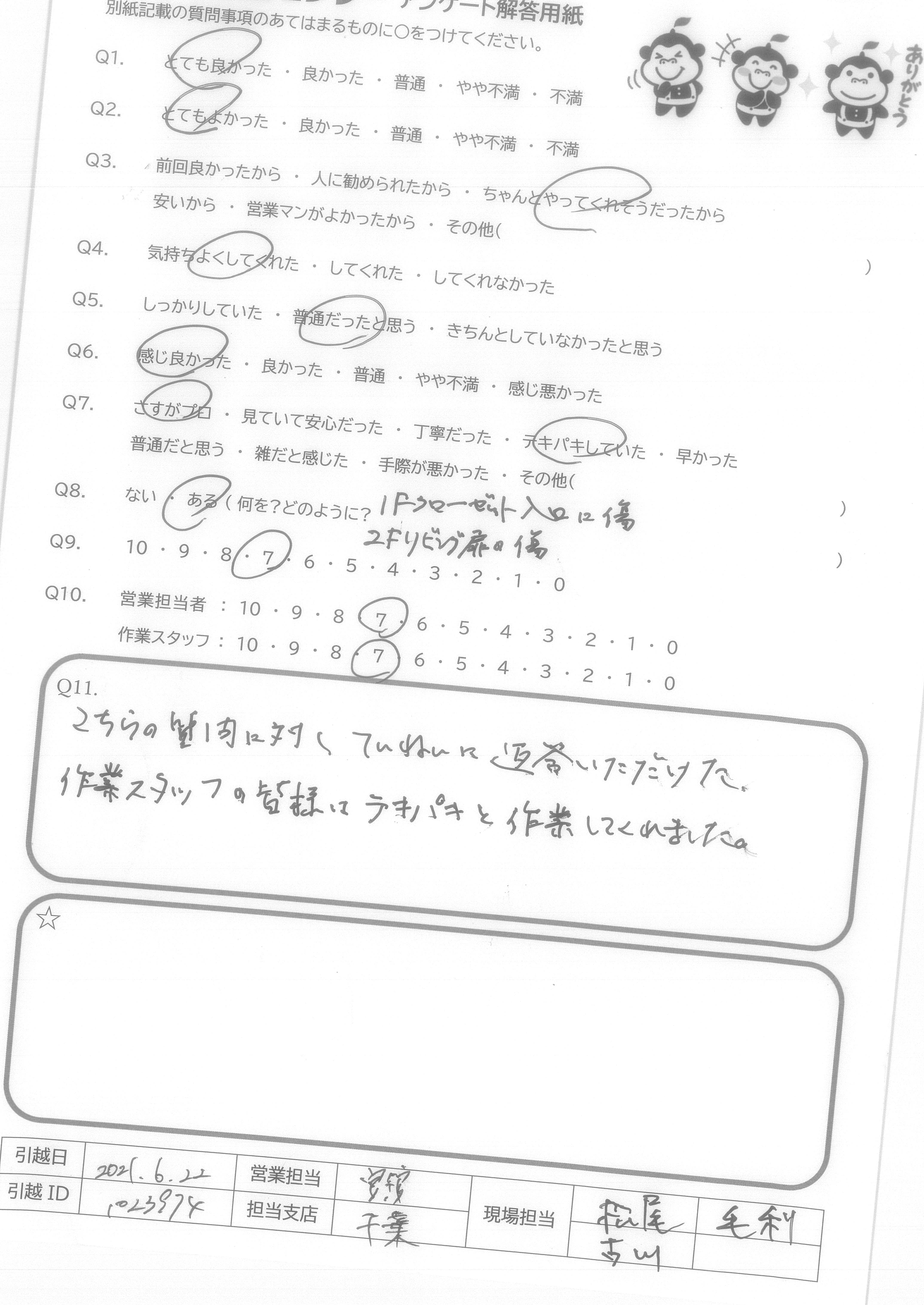 A.ありがとうございました。 また引越しする際はお願いしようと思います。