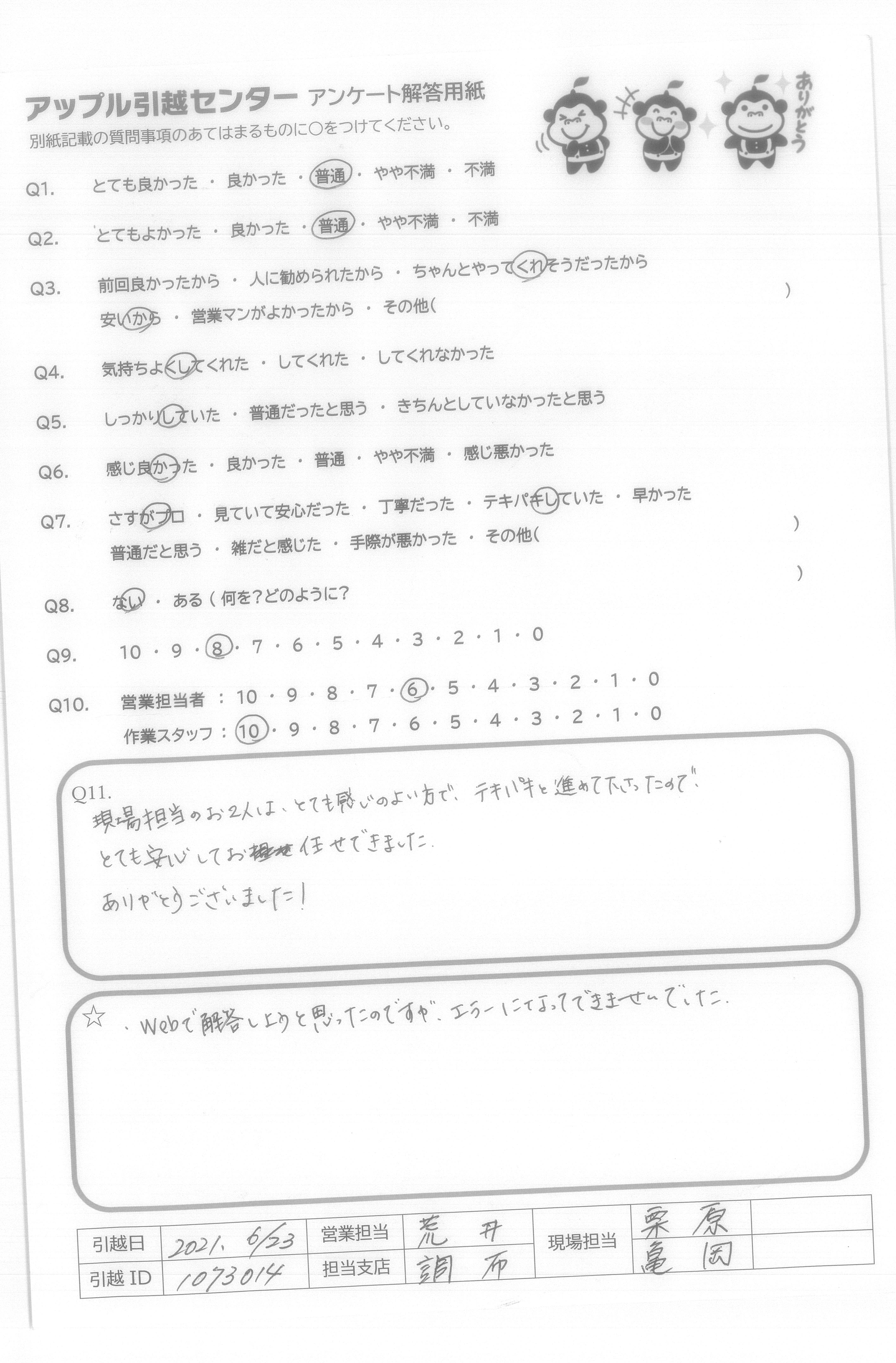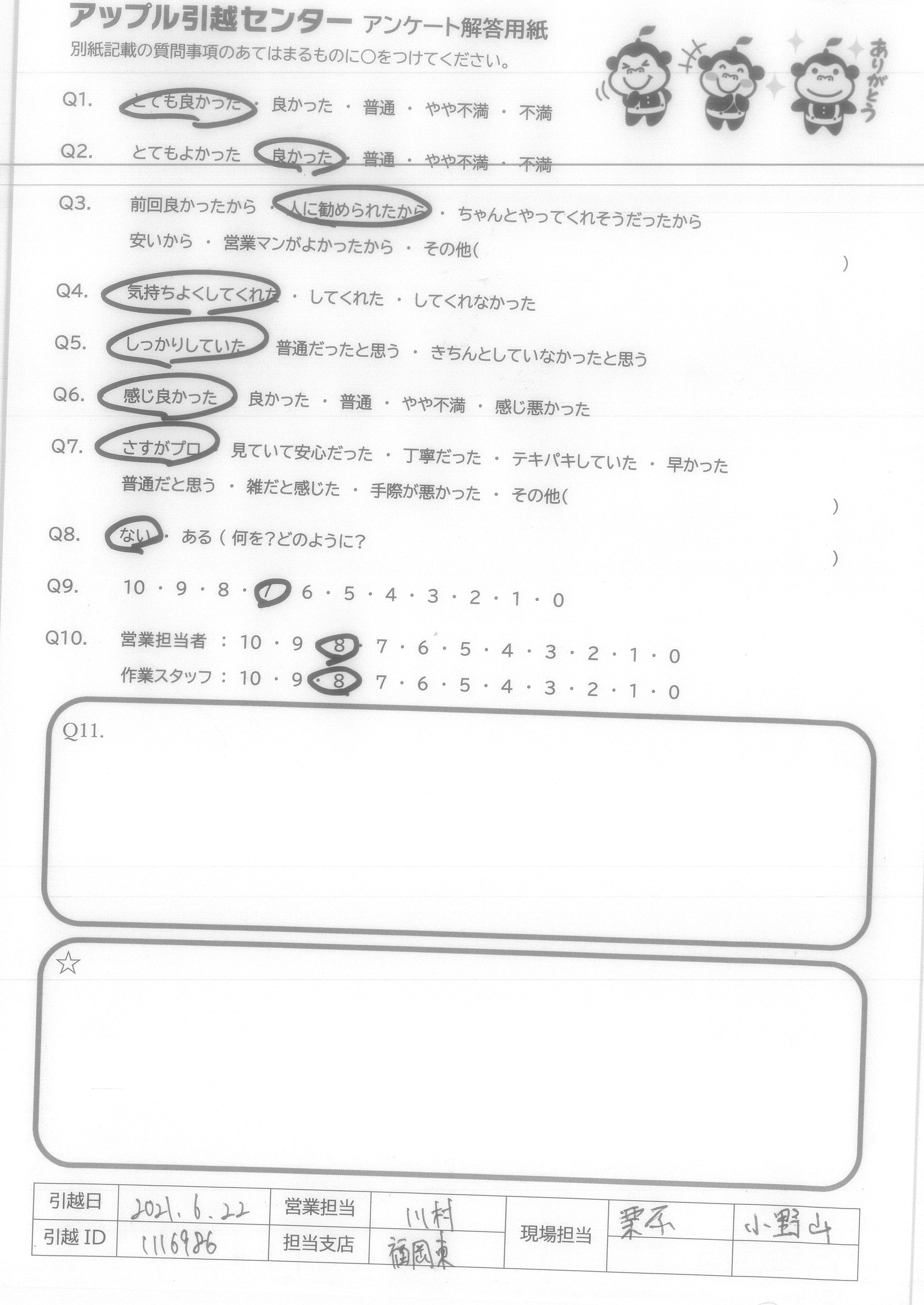 A.対応よく進めていただきました。 3名できていただいたため非常に迅速な対応いただいておりましたが、早すぎて片付け切れていなかった細かいものを一気に持っていかれてしまったので少しだけ困りました。