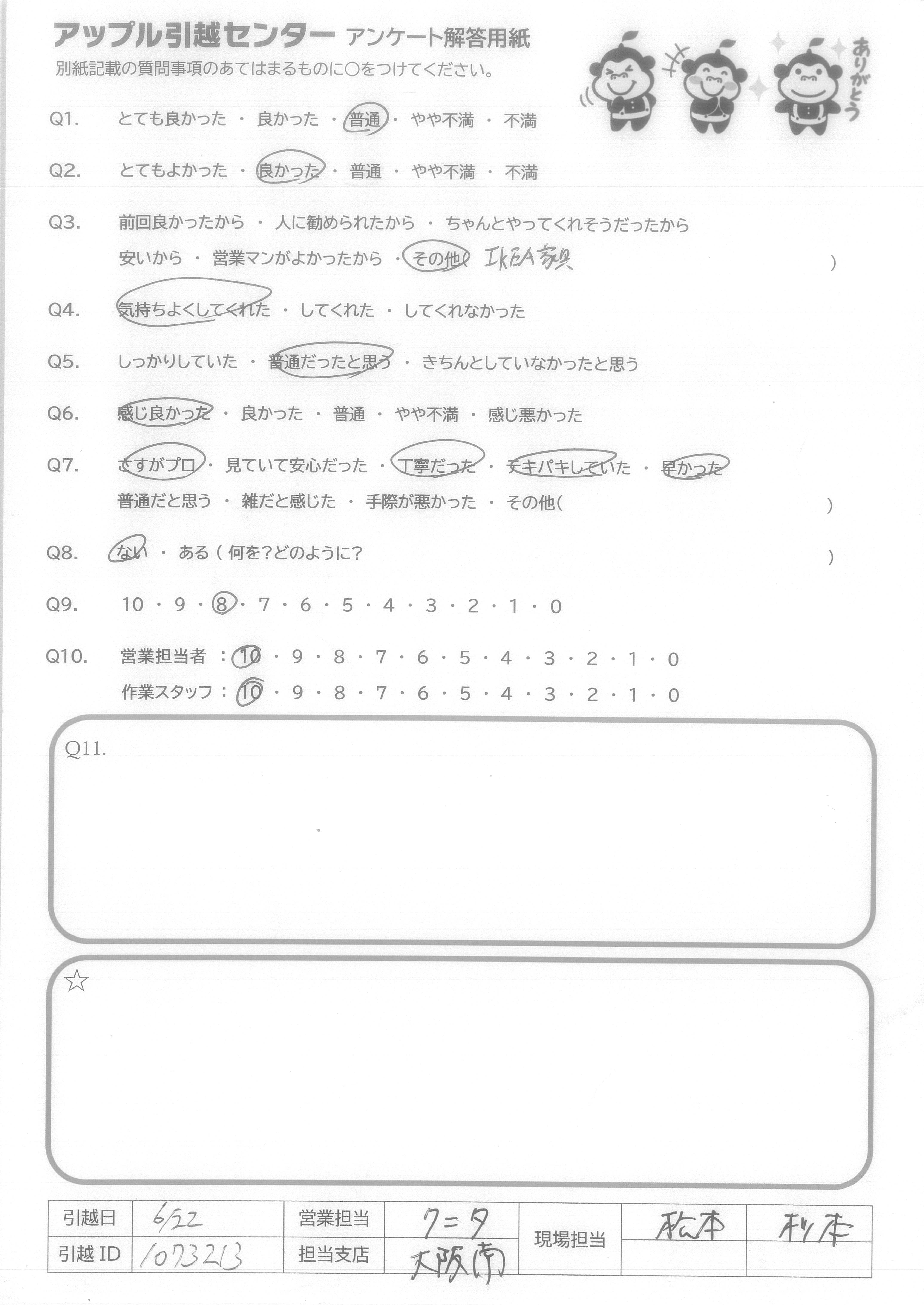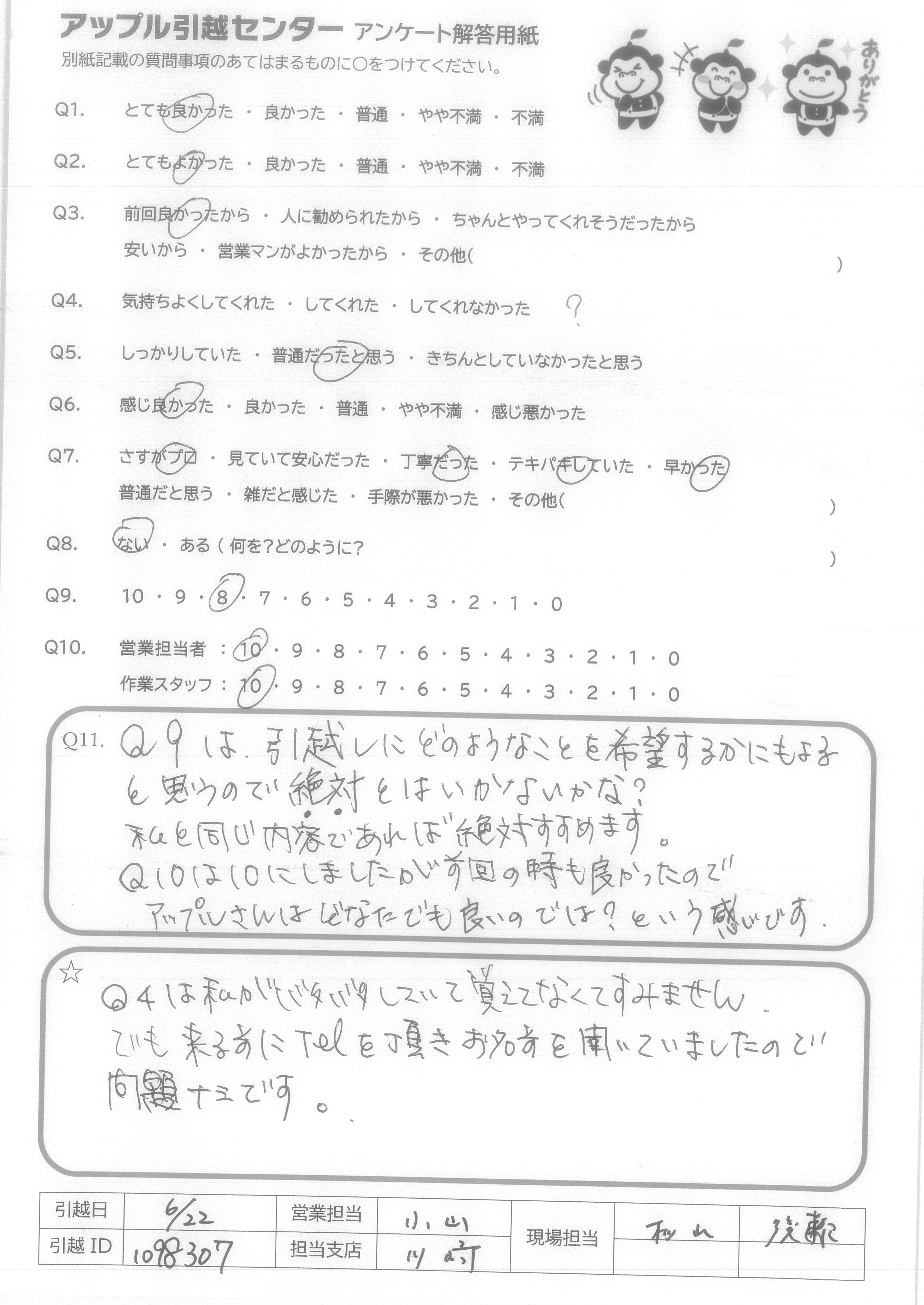 A.Q9は引越しにどのようなことを希望するかにもよると思うので絶対とはいかないかな? 私と同じ内容であれば絶対すすめます。 Q10は10にしましたが前回の時も良かったのでアップルさんはどなたでも良いのでは?という感じです。