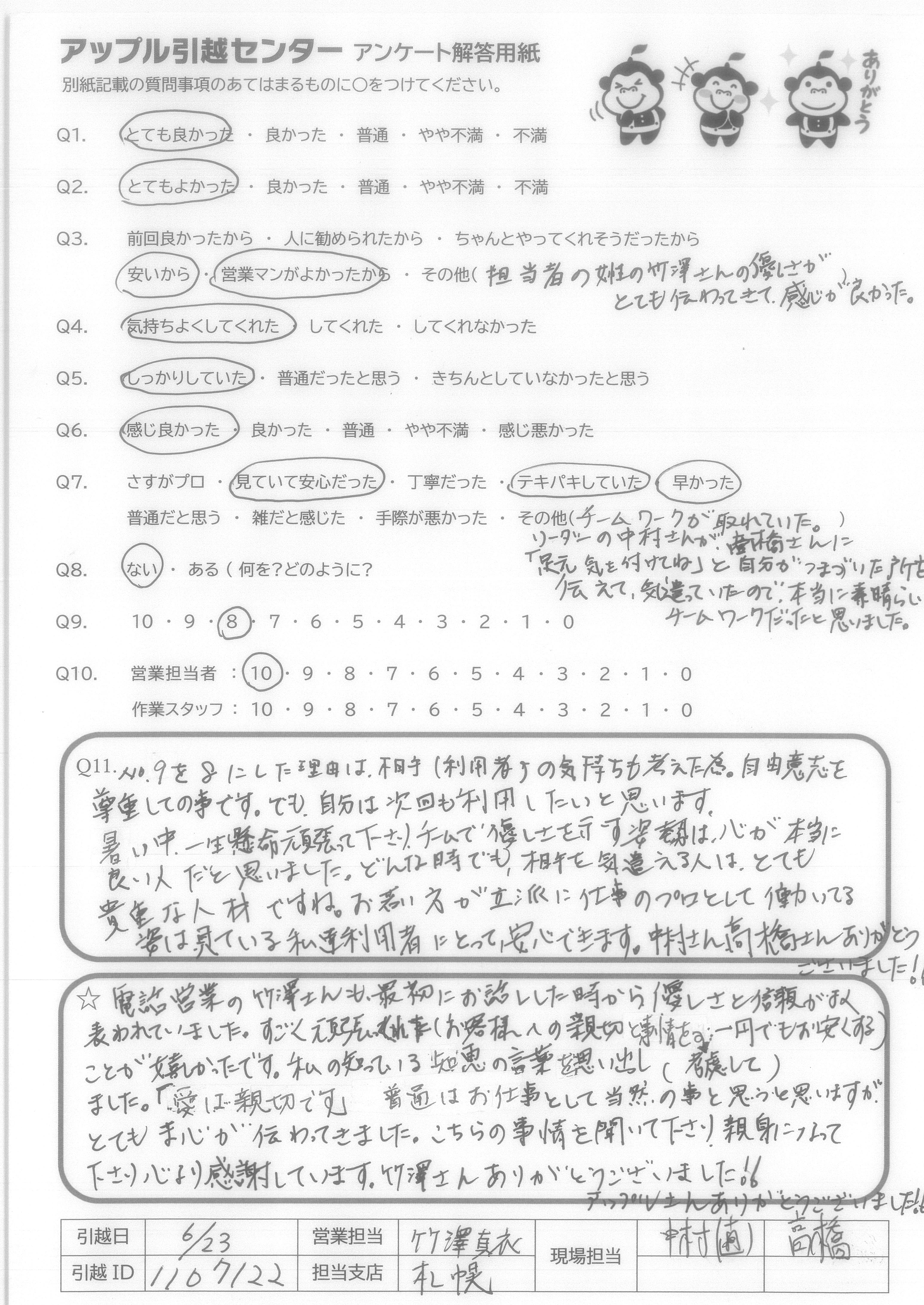 アップル引越センターでは、面映いお褒めの言葉も、胸に突き刺さるお叱りのコメントも、