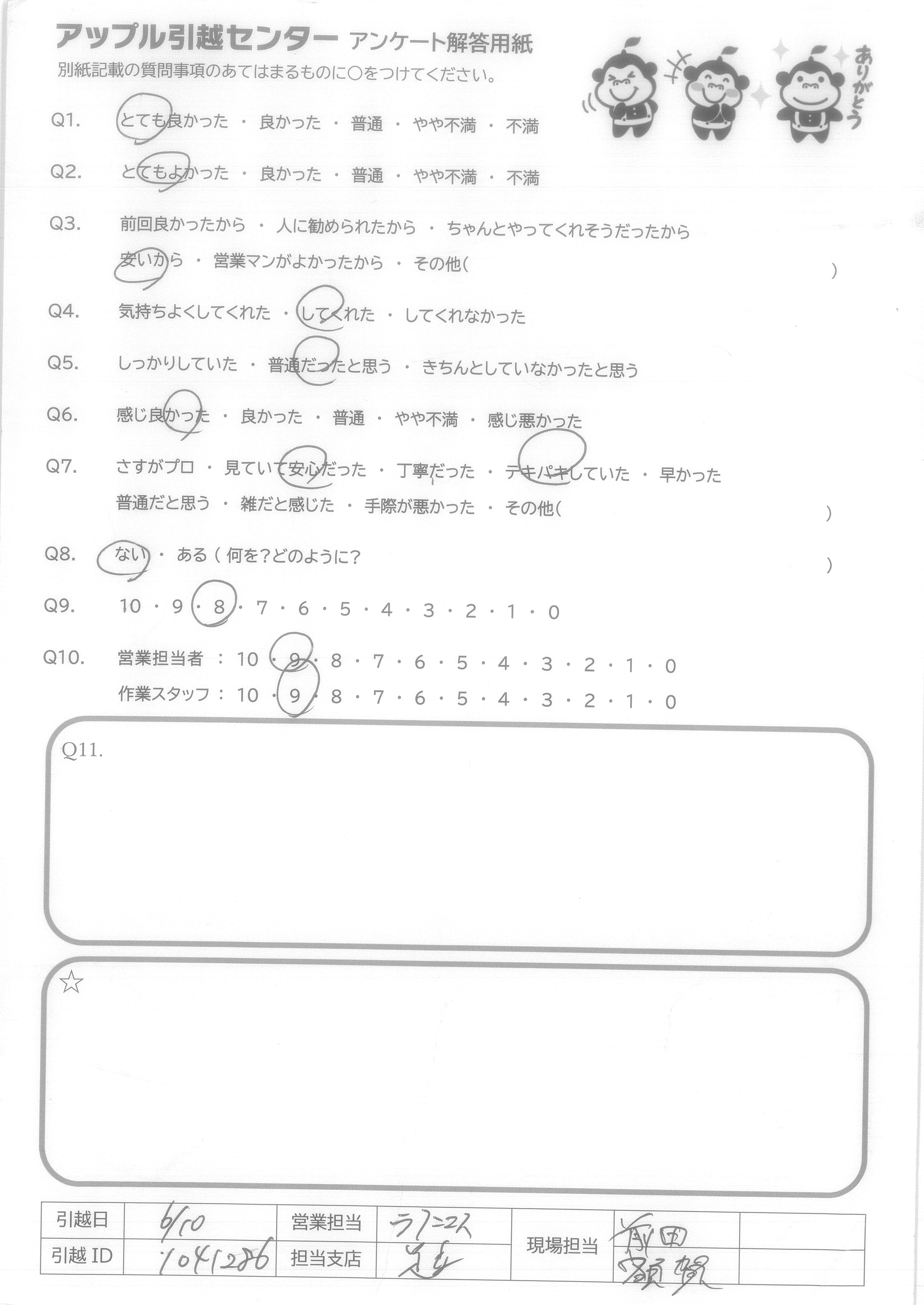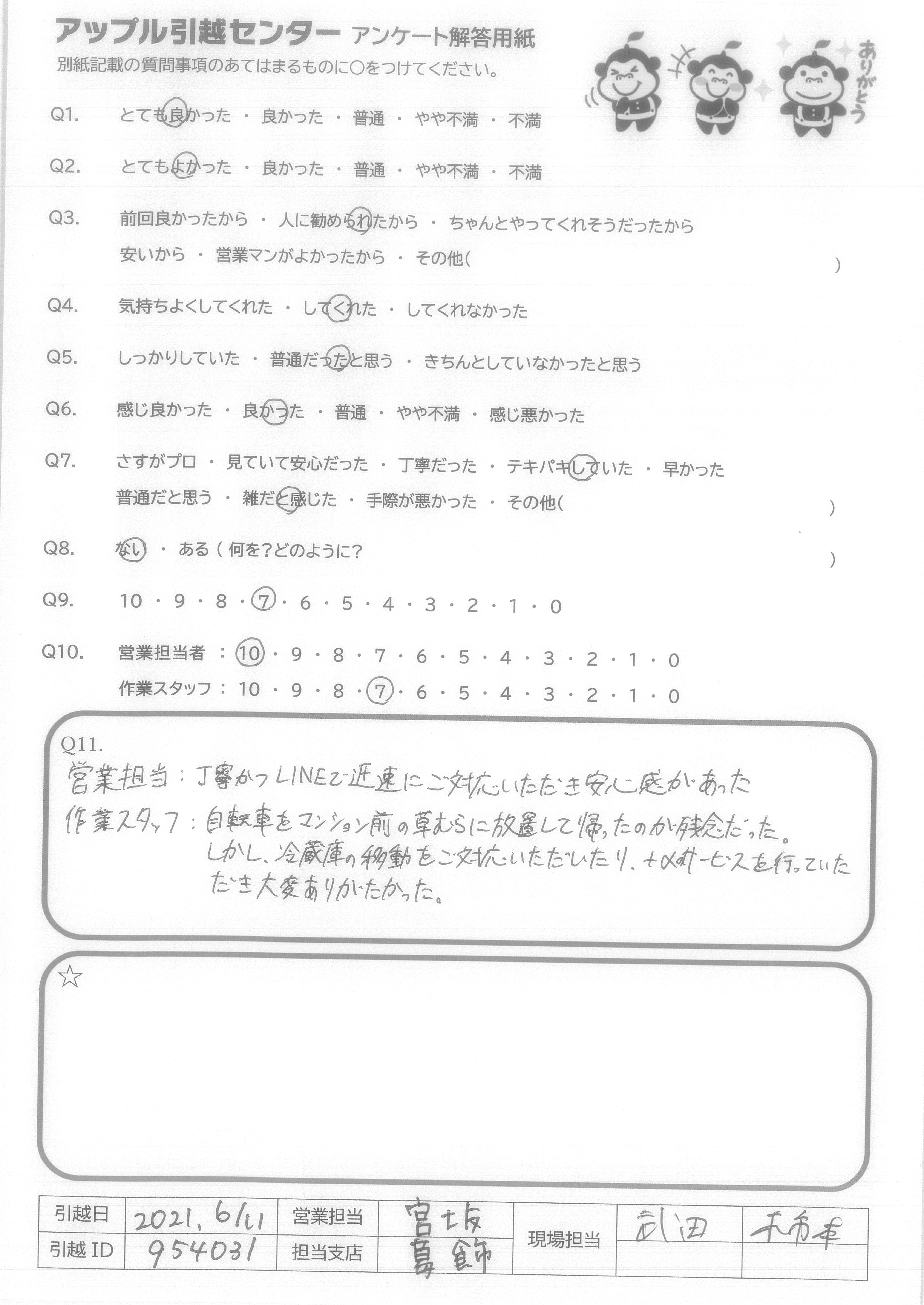 A.営業担当:丁寧かつLINEで迅速にご対応いただき安心感があった 作業スタッフ:自転車をマンション前の草むらに放置して帰ったのが残念だった。しかし、冷蔵庫の移動をご対応いただいたり、+αサービスを行っていただき大変ありがたかった。