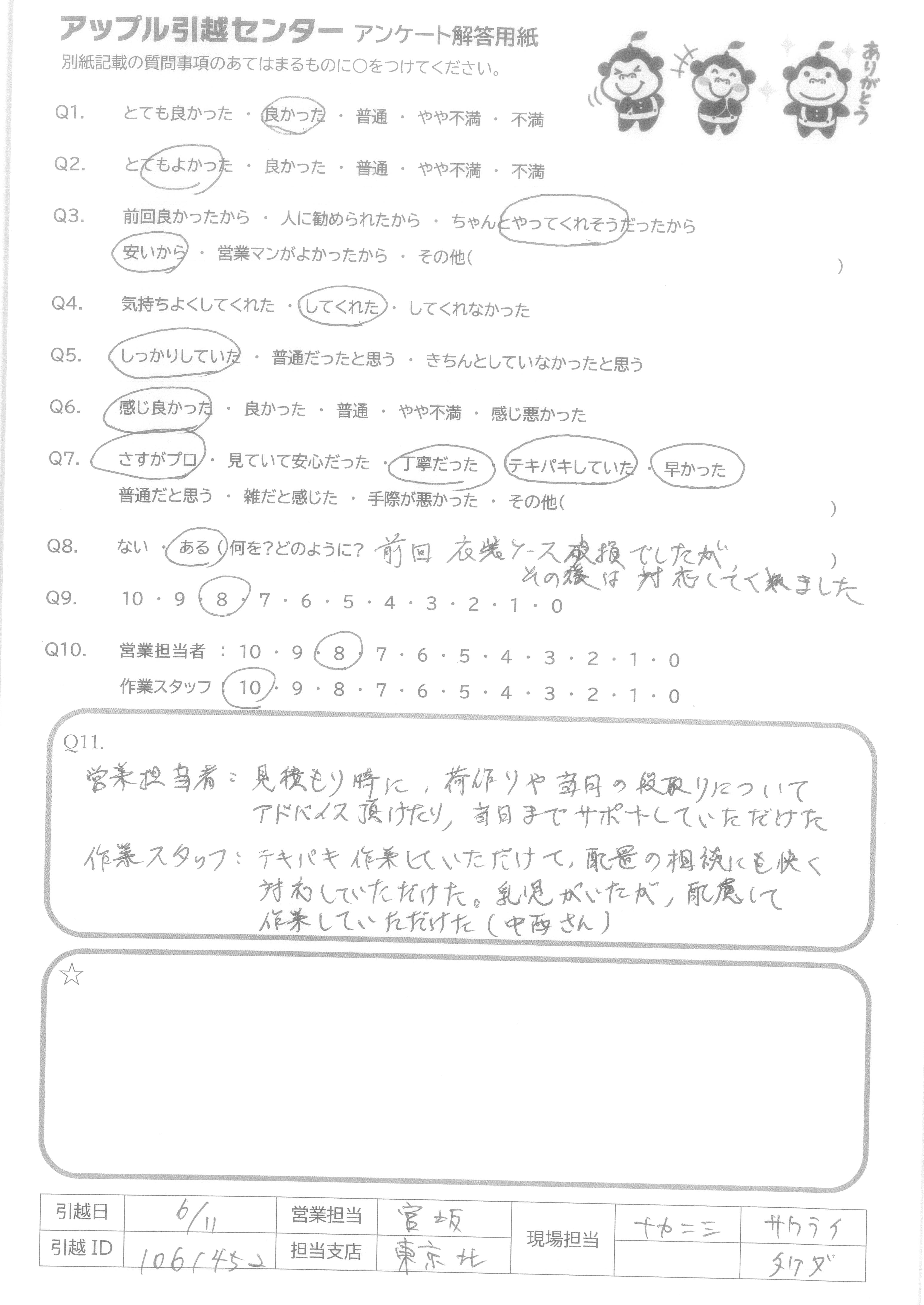 A.営業担当者:見積もり時に、荷作りや当日の段取りについてアドバイス頂けたり、当日までサポートしていただけた 作業スタッフ:テキパキ作業していただけて、配置の相続にも快く対応していただけた。乳児がいたが、配慮して作業していただけた(中西さん)