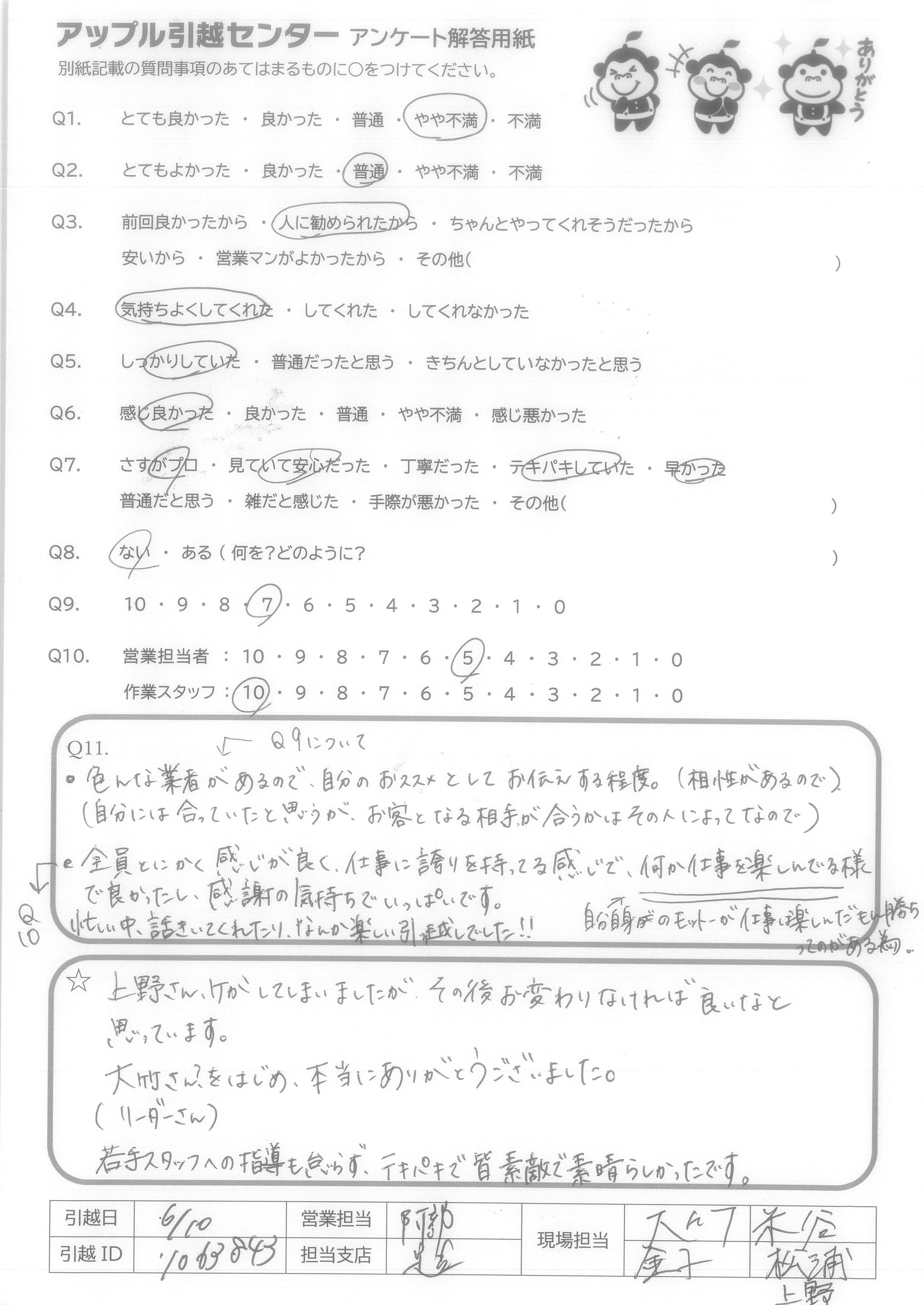 A.・営業の方はテキパキしていて感じよく、また、電話見積もり後に一旦検討したいと言っても態度が変わったりしつこい営業がなかったのが良かった。 ・作業の方たちは、暑い中、旧居新居ともエレベーターなしの引越しで大変だったと思うが、最後までさわやかに対応してもらえて良かった。