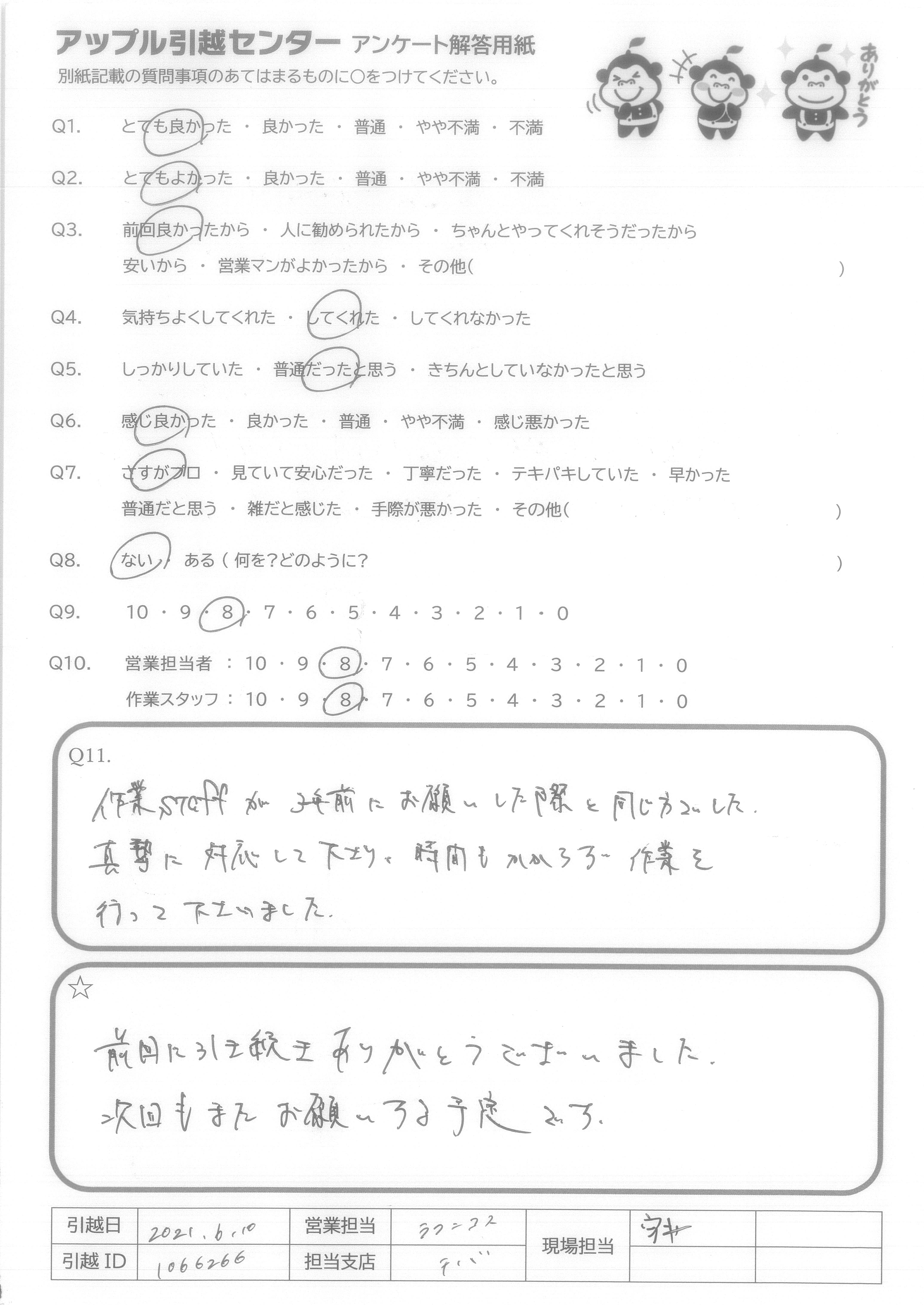 A.引っ越し作業をして下さった方々の手際の良さや丁寧さにすごく安心できたため。 また、とても会話しやすく優しく声をかけてくださったため。