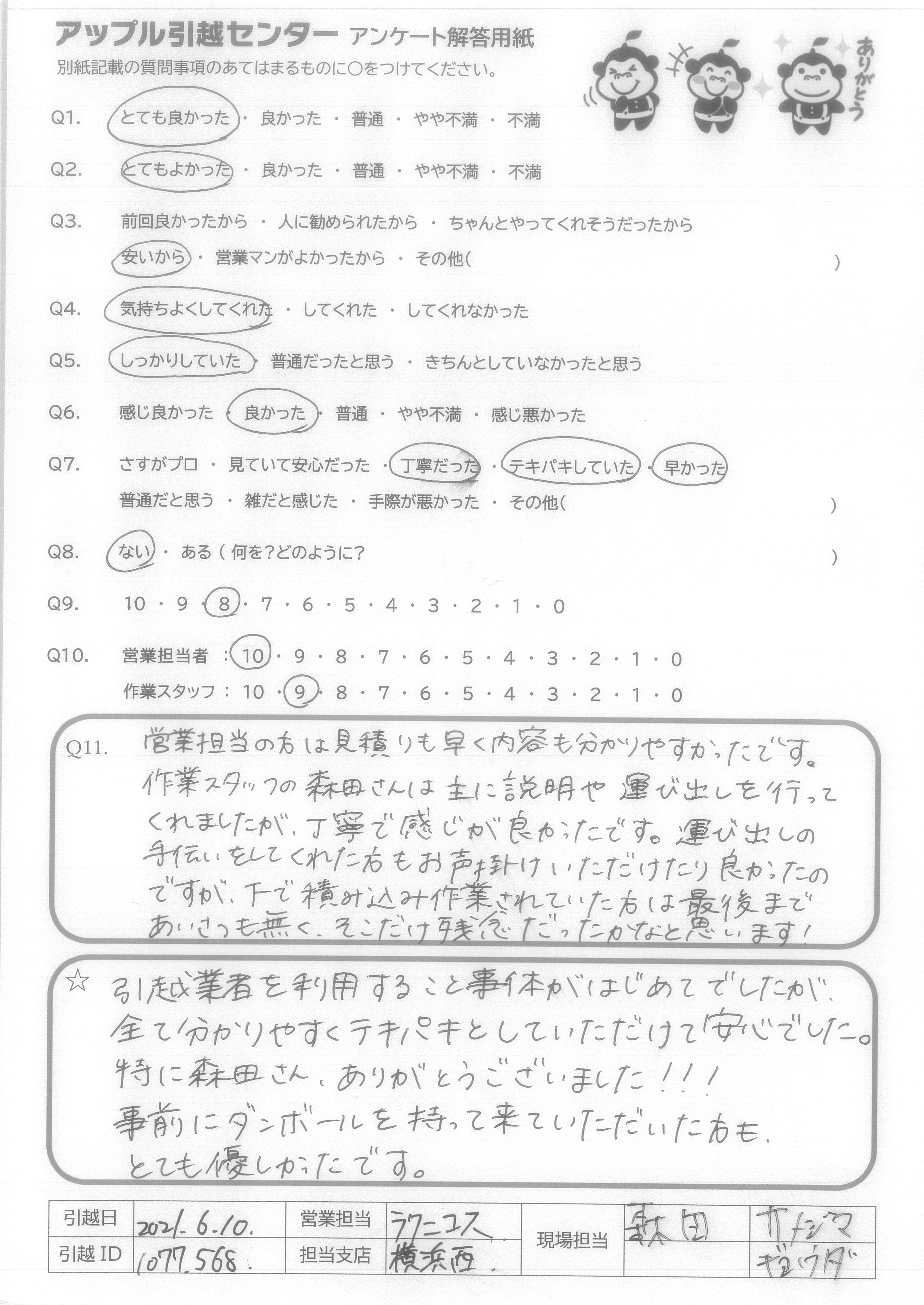 A.引越業者を利用すること事体がはじめてでしたが、全て分かりやすくテキパキとしていただけて安心でした。 特に森田さん、ありがとうございました!! 事前にダンボールを持って来ていただいた方も、とても優しかったです。