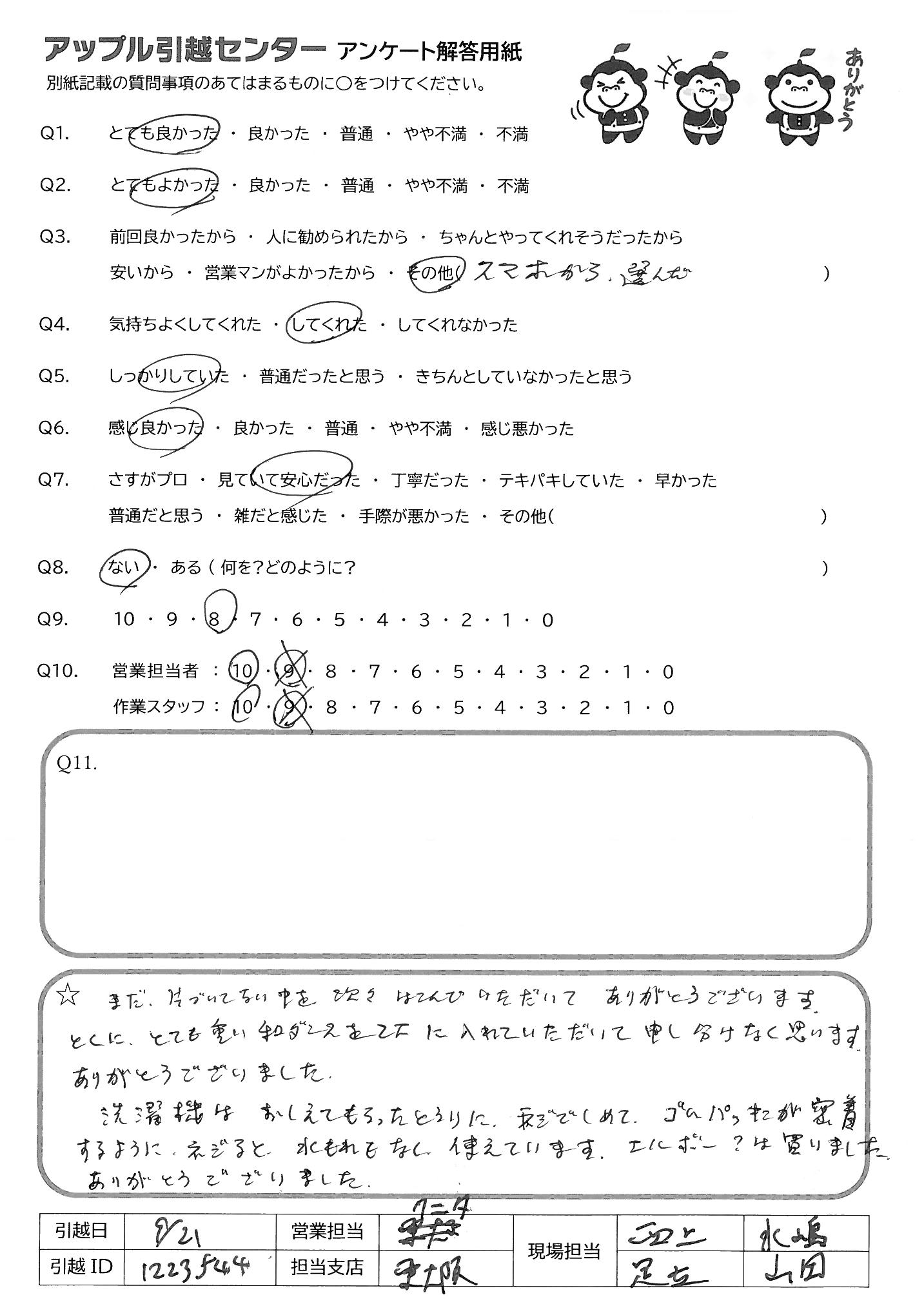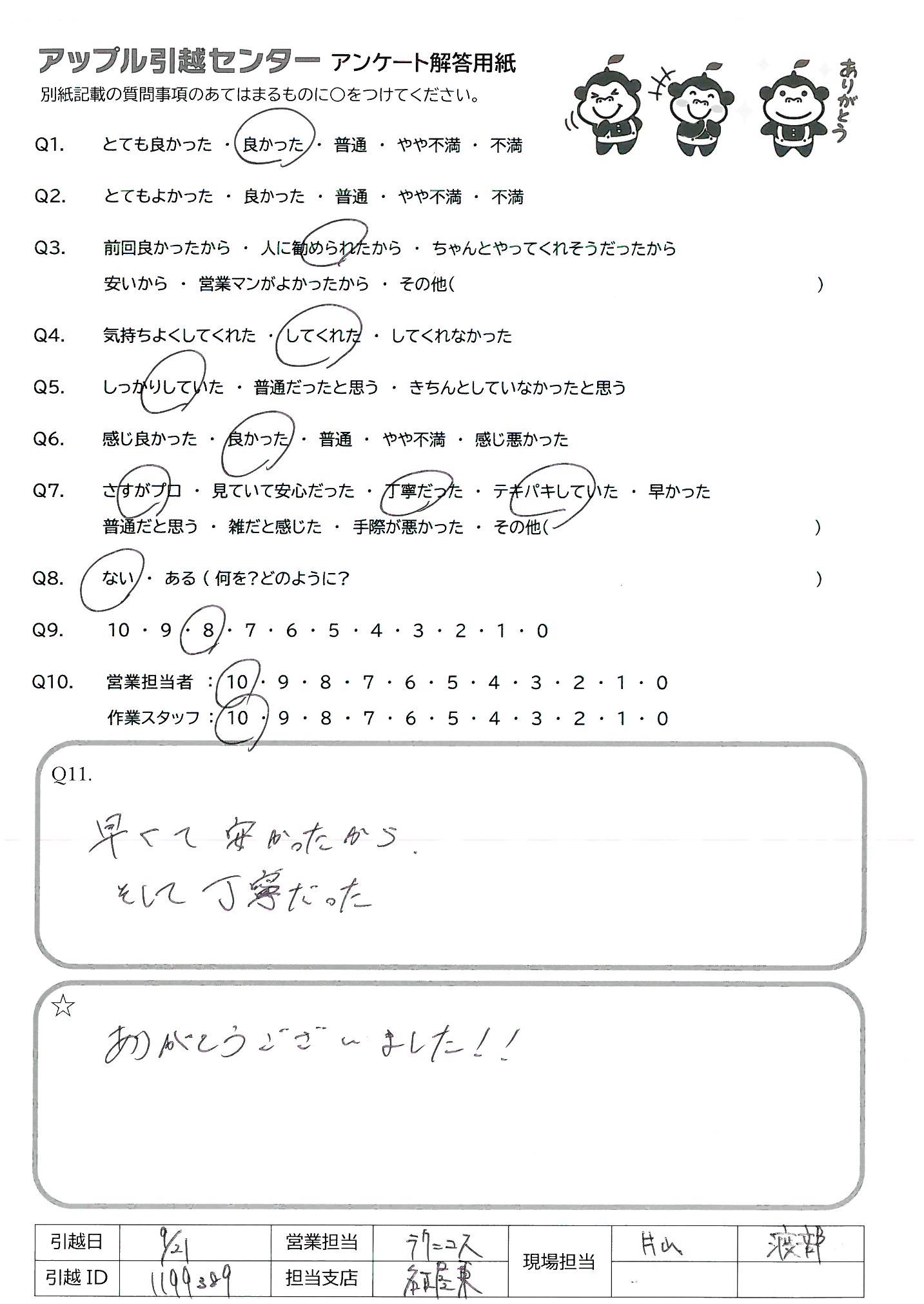 A.最近涼しかったのに当日天気良くて、暑い中作業頂きありがとうございました。旧居から新居へ移動する際、待たせてしまって申し訳ありませんでした。また機会ございましたらよろしくお願いいたします。