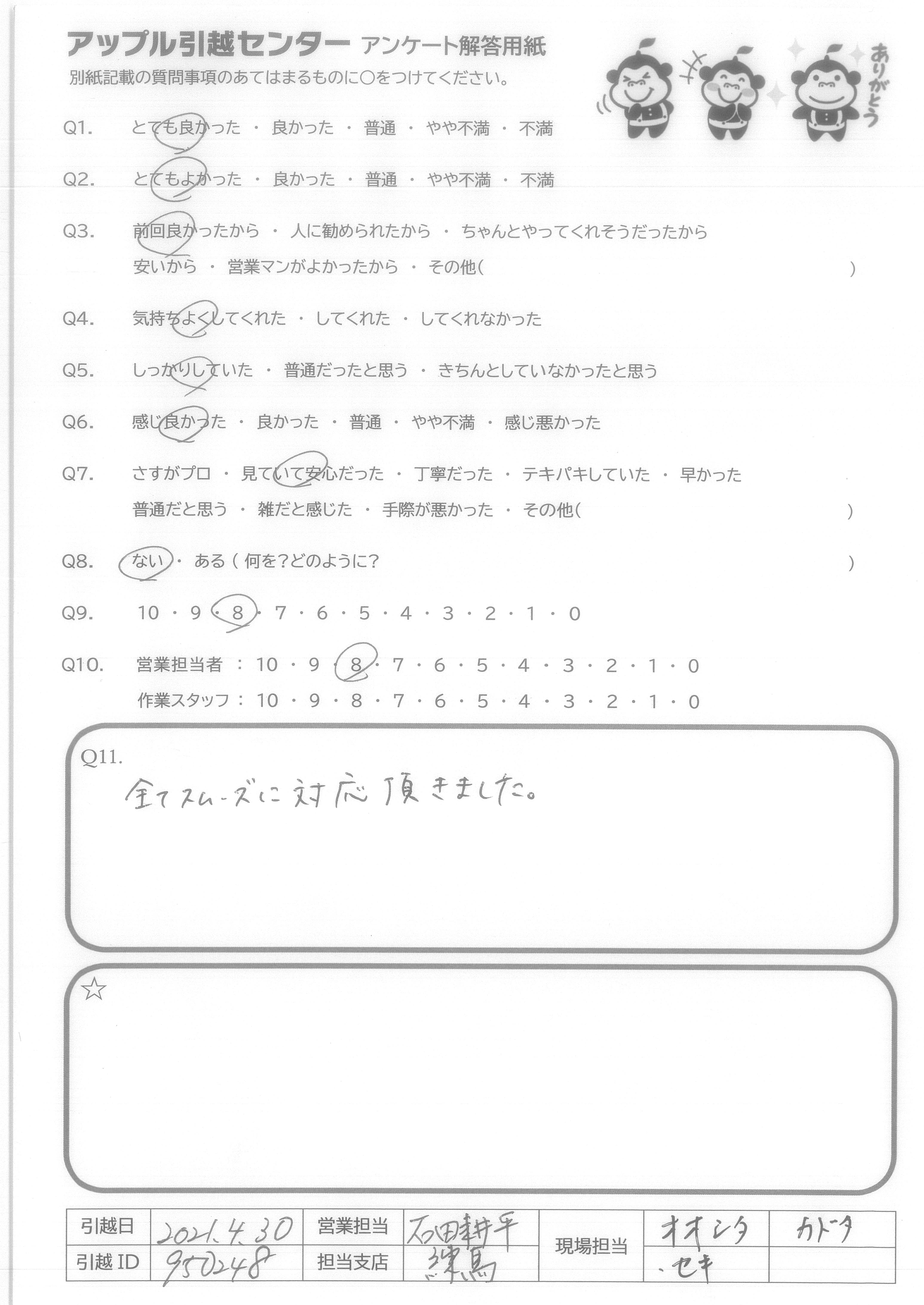A.当日までに荷造りが終わっておらずご面倒をおかけしてしまいましたが、にこやかに、テキパキと対応いただきとても有難かったです。