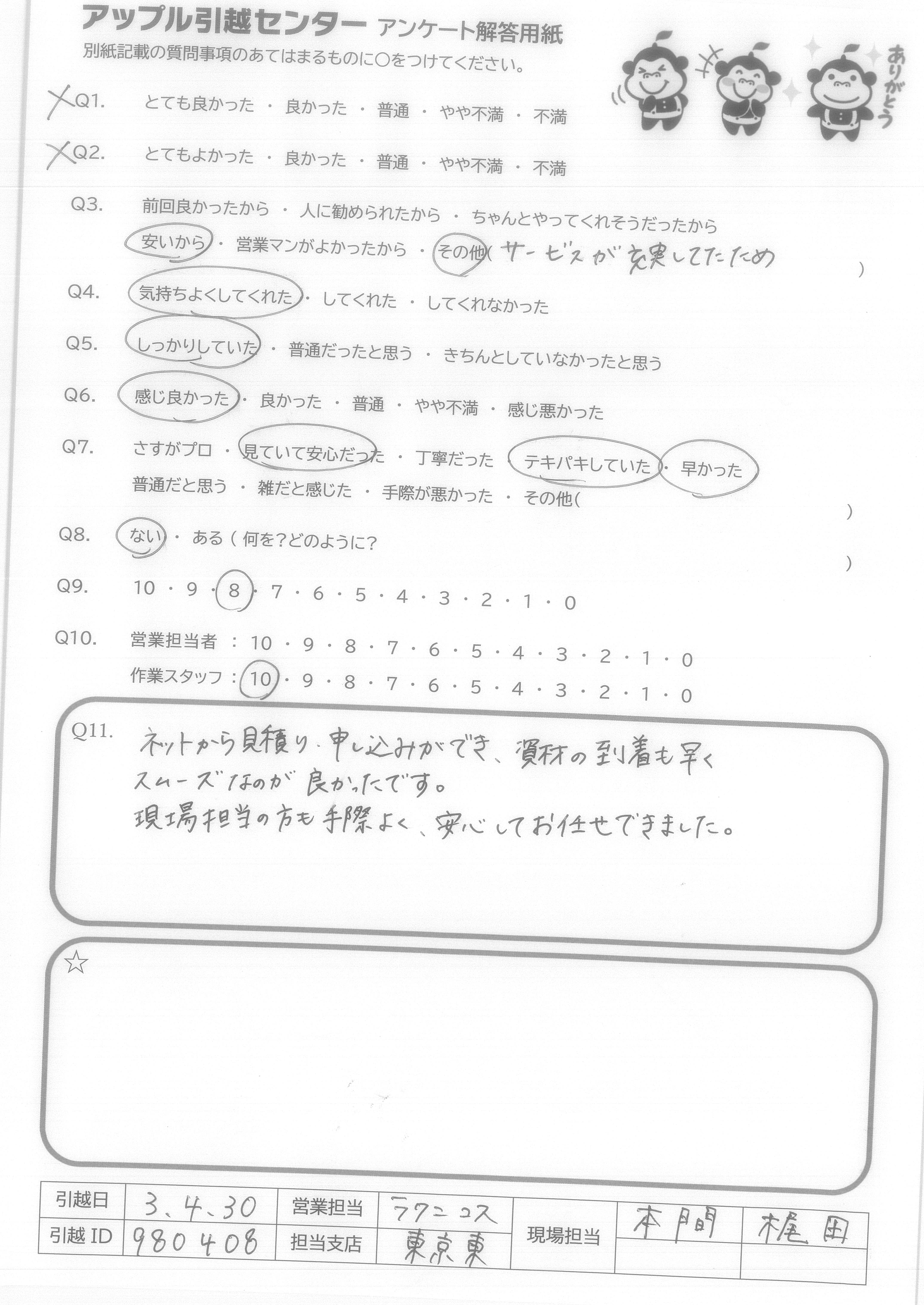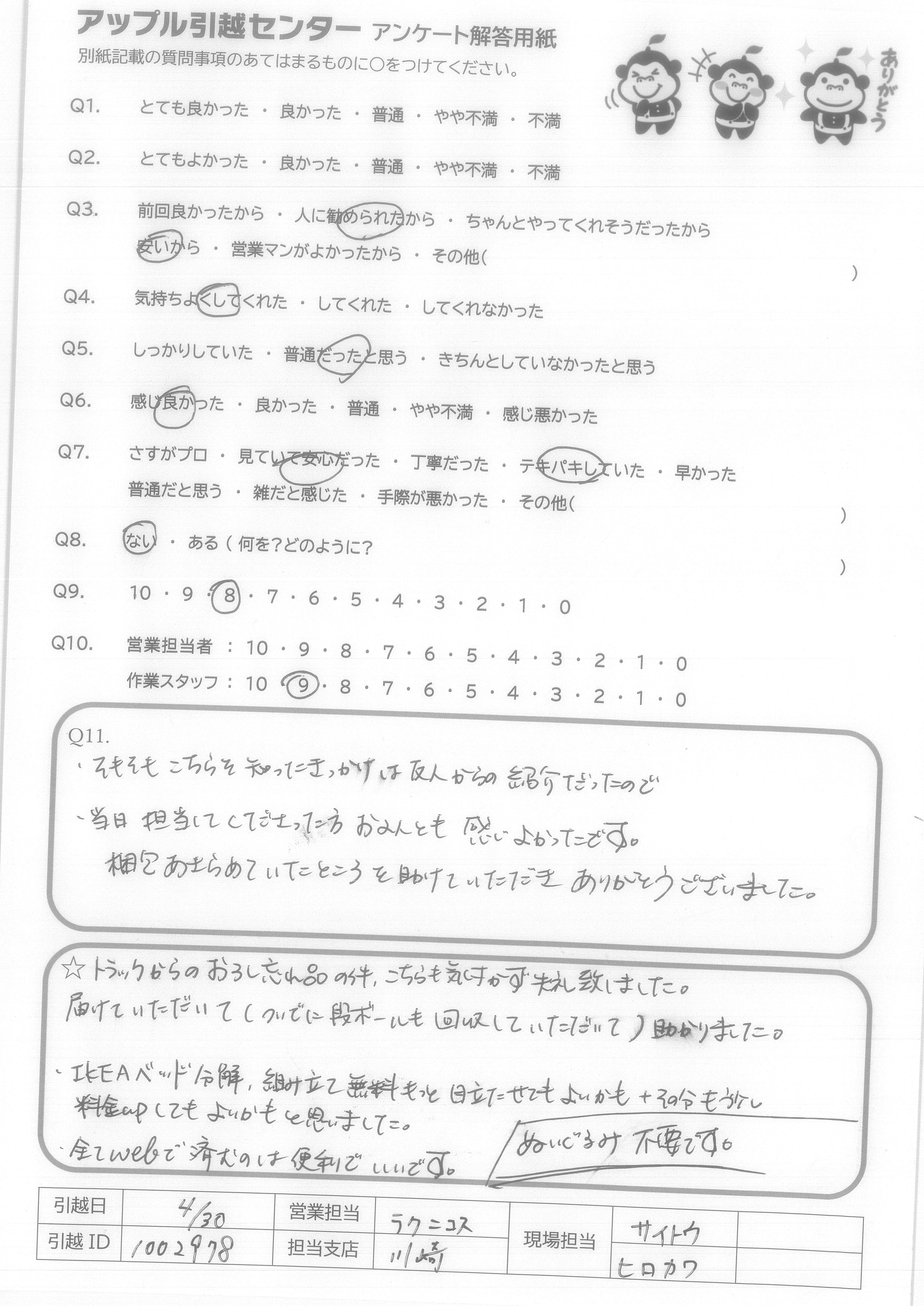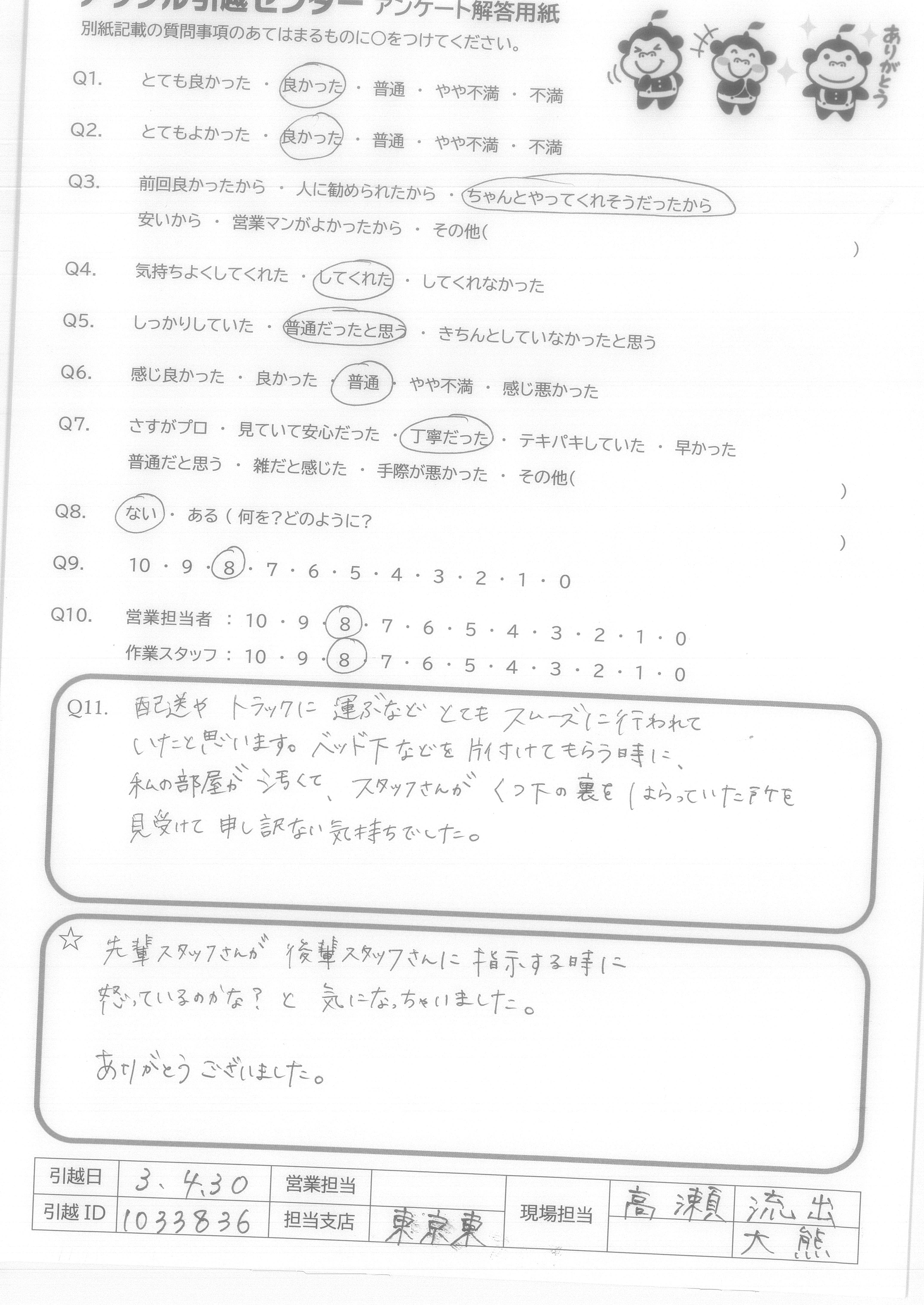 A.総じて短納期の引越しを実行できましたので感謝しております。これ以上欲張るのは忍びないですが、+αの加点、付加価値が実作業でも見れると友人知人に勧めたいなと思いましたので小言までに。自己紹介については搬出の際はありましたが、搬入の際は無かったと記憶してます、蛇足まで。