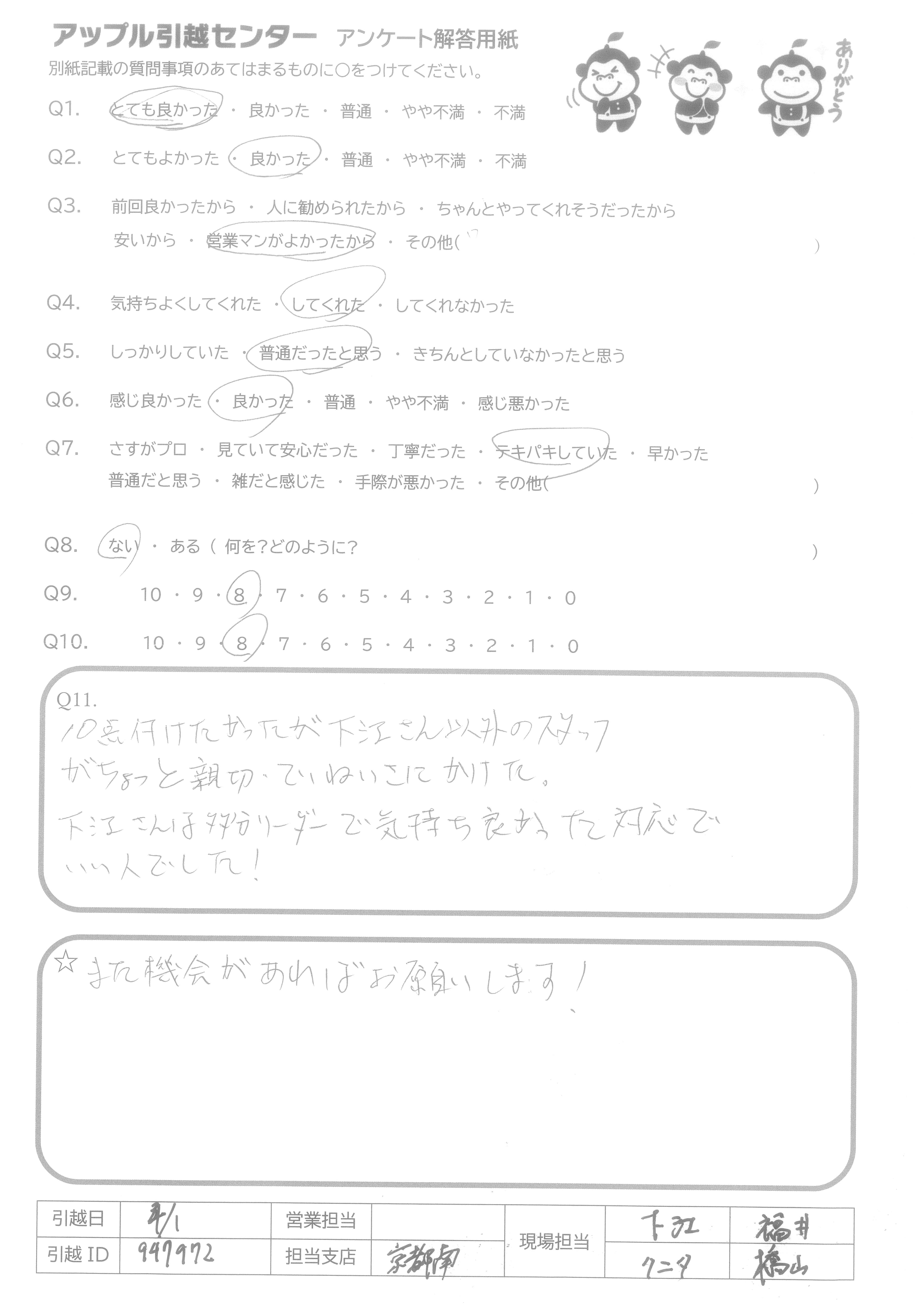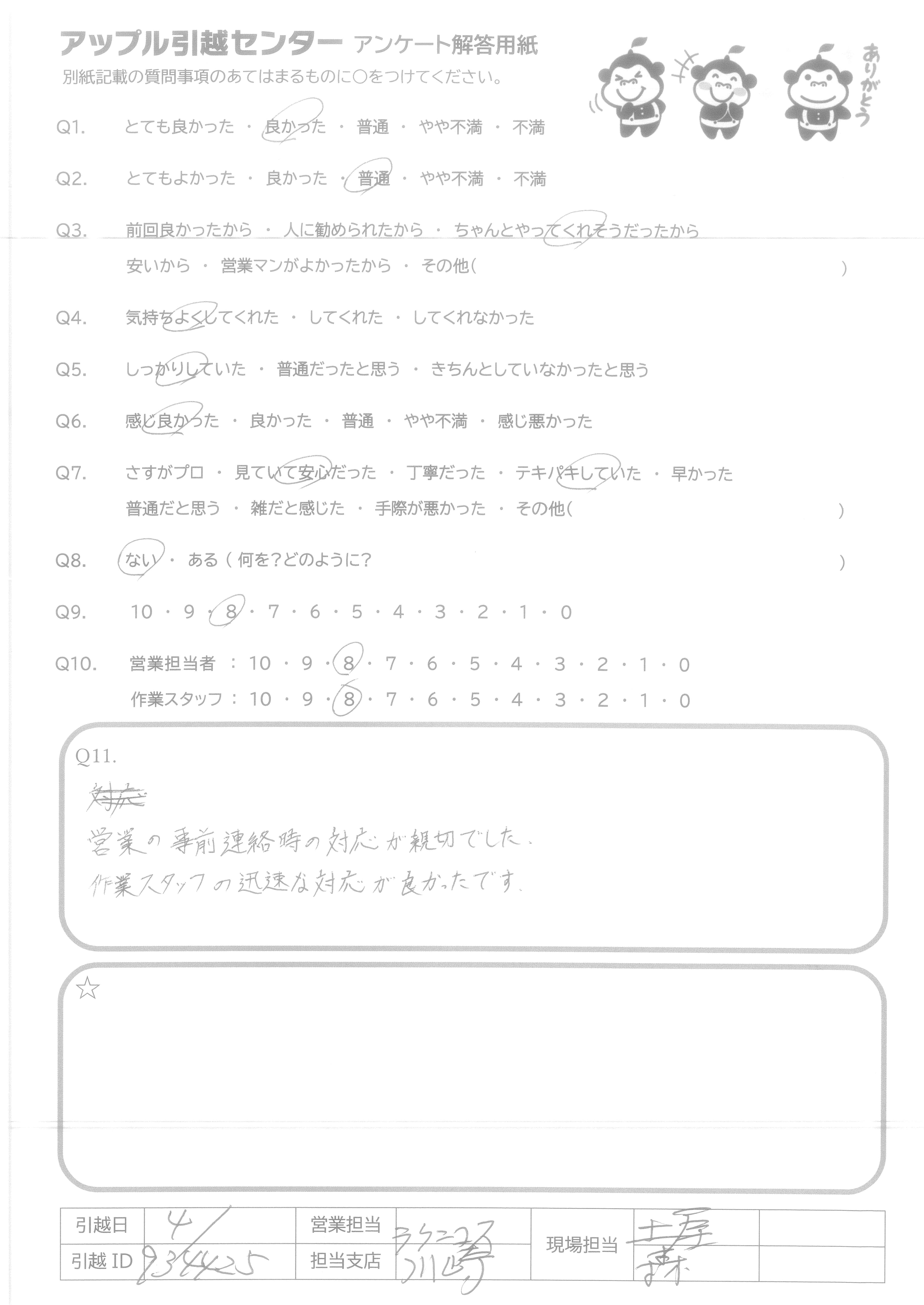 A.営業担当の方は引越内容の質問をもう少しどんどん早く進めてほしかったが料金のことやアップルがどこまで作業してくれるかなど分かりやすく言ってもらえてよかったです。当日の作業はハキハキと作業内容を説明してもらえ、私と一緒に荷物の確認等をしてもらえたのでよかったです。途中の到着時間の連絡はもう少し早く欲しかったです。
