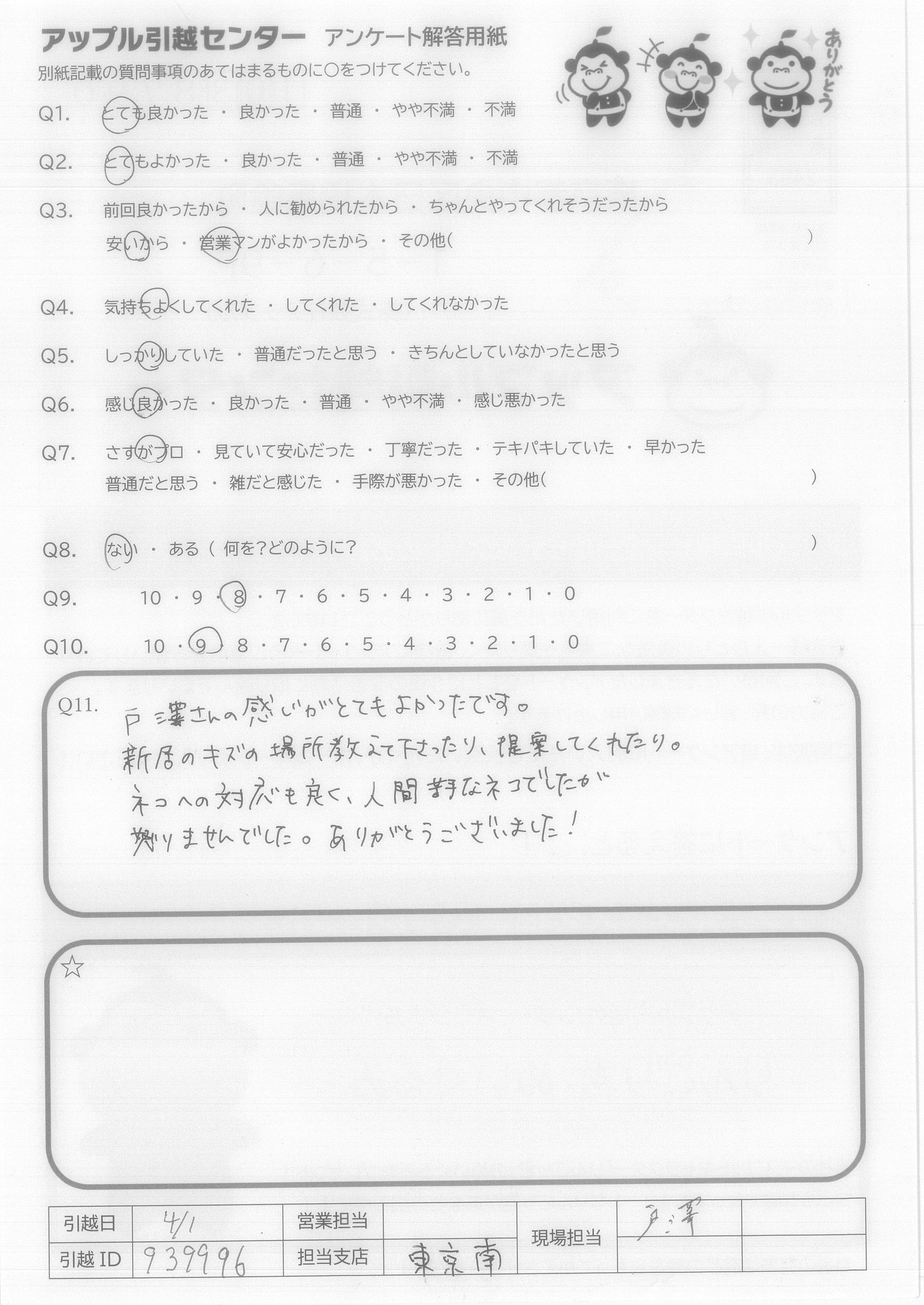A.戸澤さんの感じがとてもよかったです。 新居のキズの場所教えて下さったり、提案してくれたり。 ネコへの対応も良く、人間苦手なネコでしたが怒りませんでした。ありがとうございました!