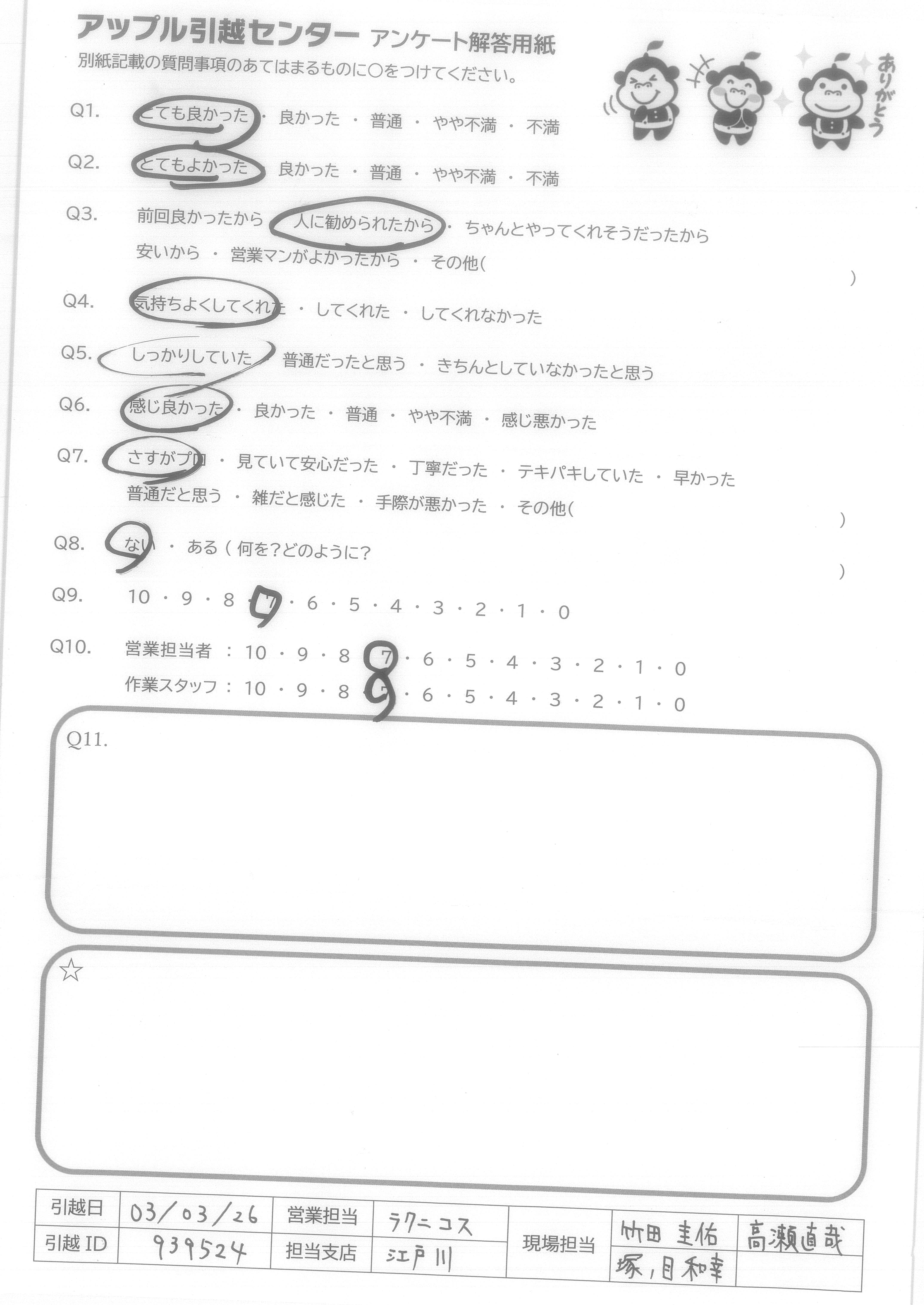 A.ありがとうございました。 思ったより早く引越しできたので、しっかり寝れました。