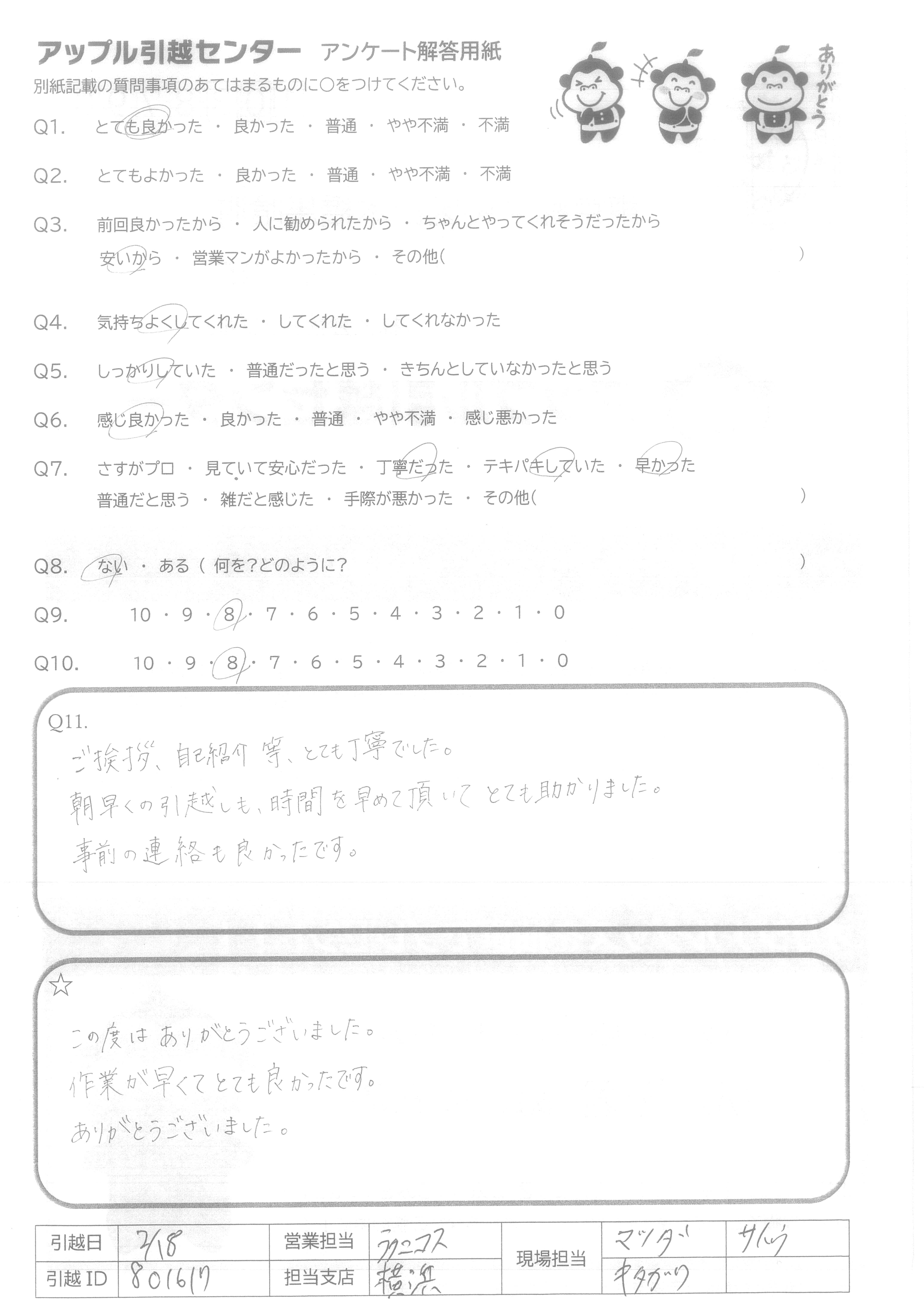 A.ご挨拶、自己紹介等、とても丁寧でした。 朝早くの引越しも、時間を早めて頂いてとても助かりました。 事前の連絡も良かったです。