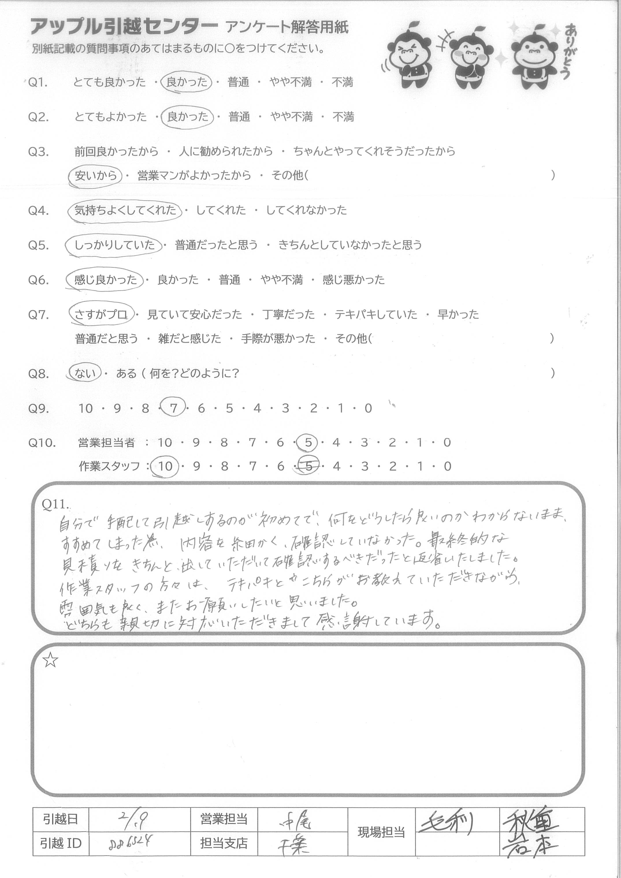 A.アップルさんのおかげでスムーズにお得に引っ越しできました。ありがとうございました。