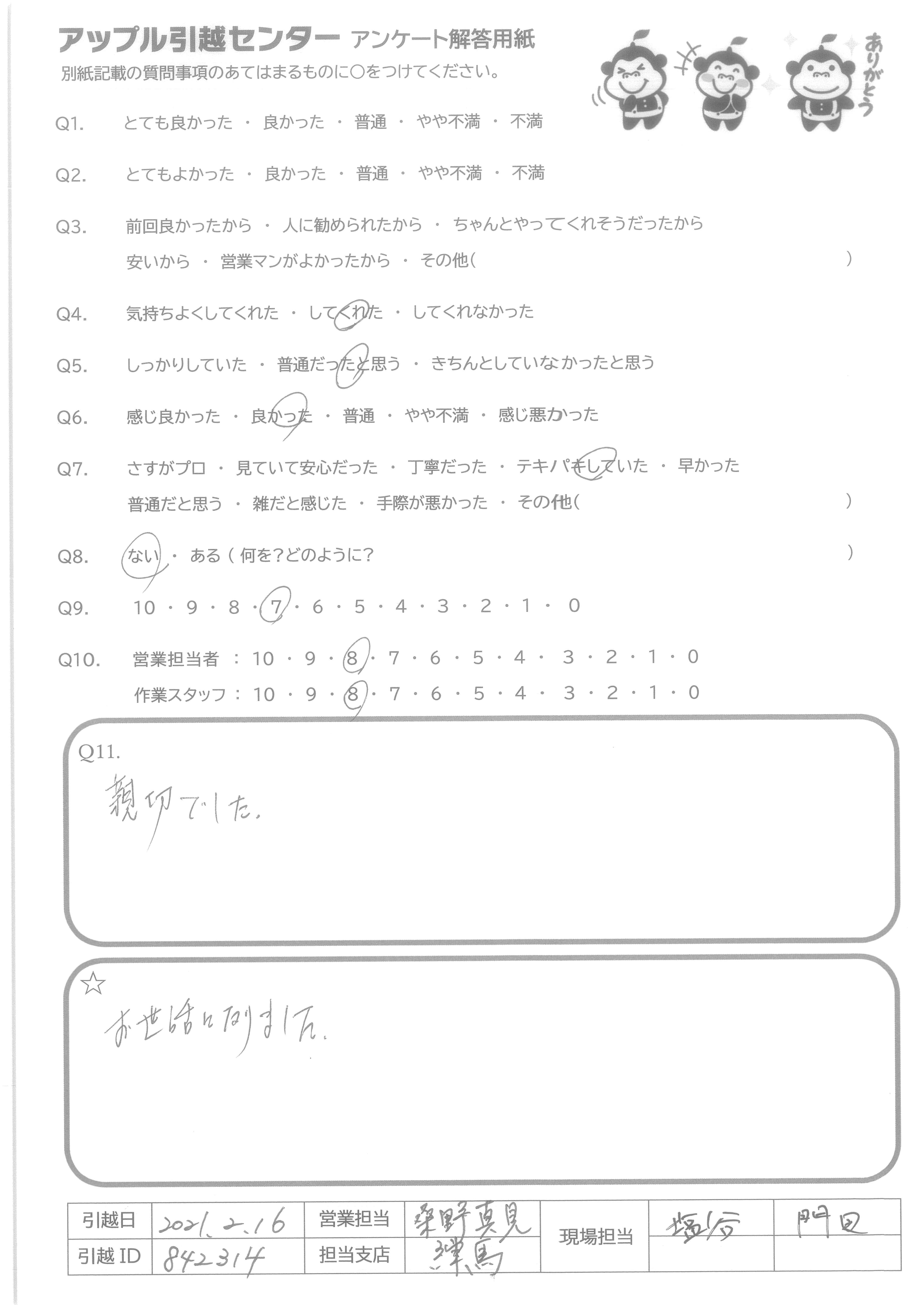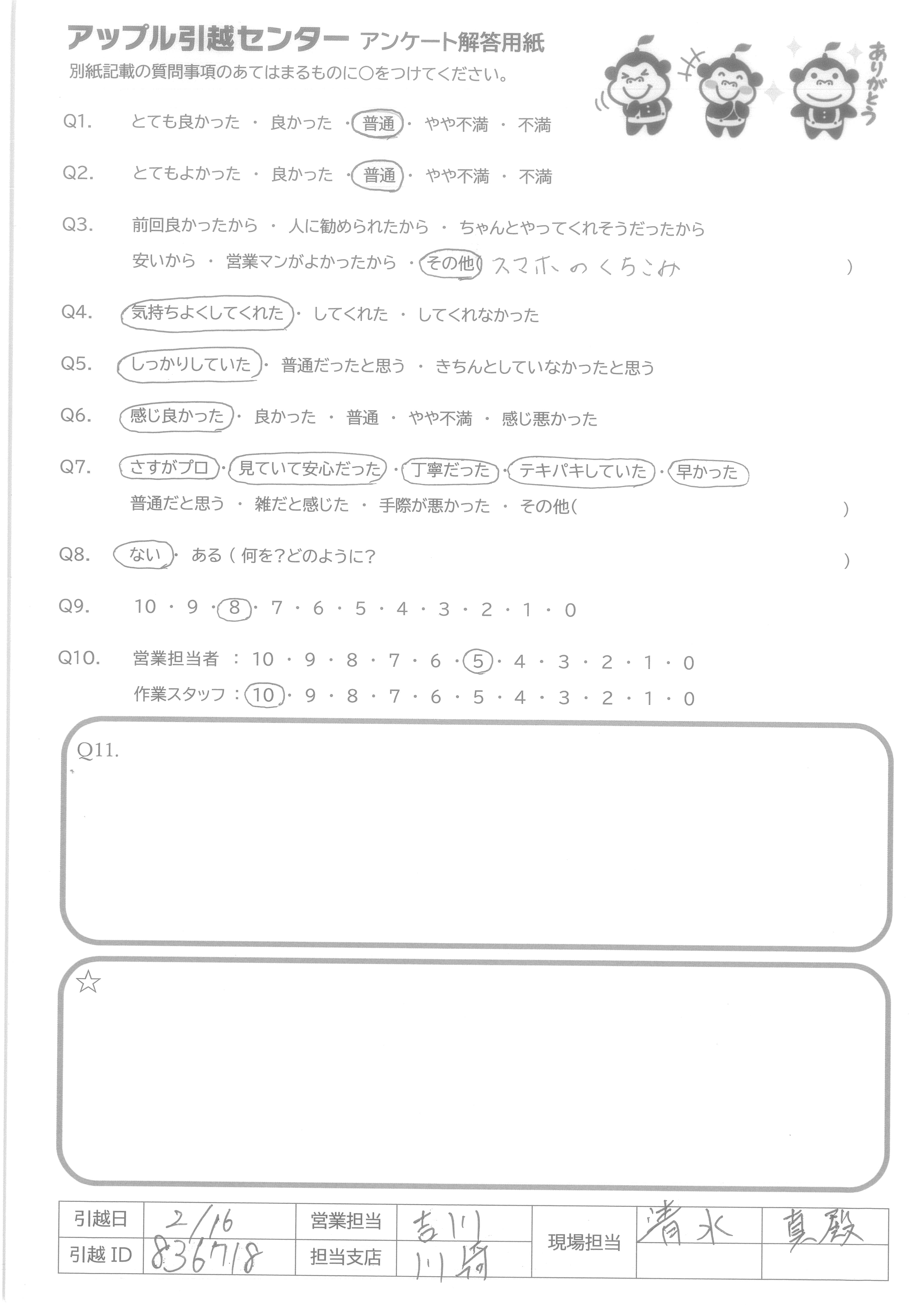 A.引越しスタッフさんは前回も今回もとても感じがよく、仕事も丁寧で好印象でしたが、本部との連携がとれてなかったりコールセンターの対応に不満があり、もったいないと思いました。上田さん、高瀬さんありがとうございました。