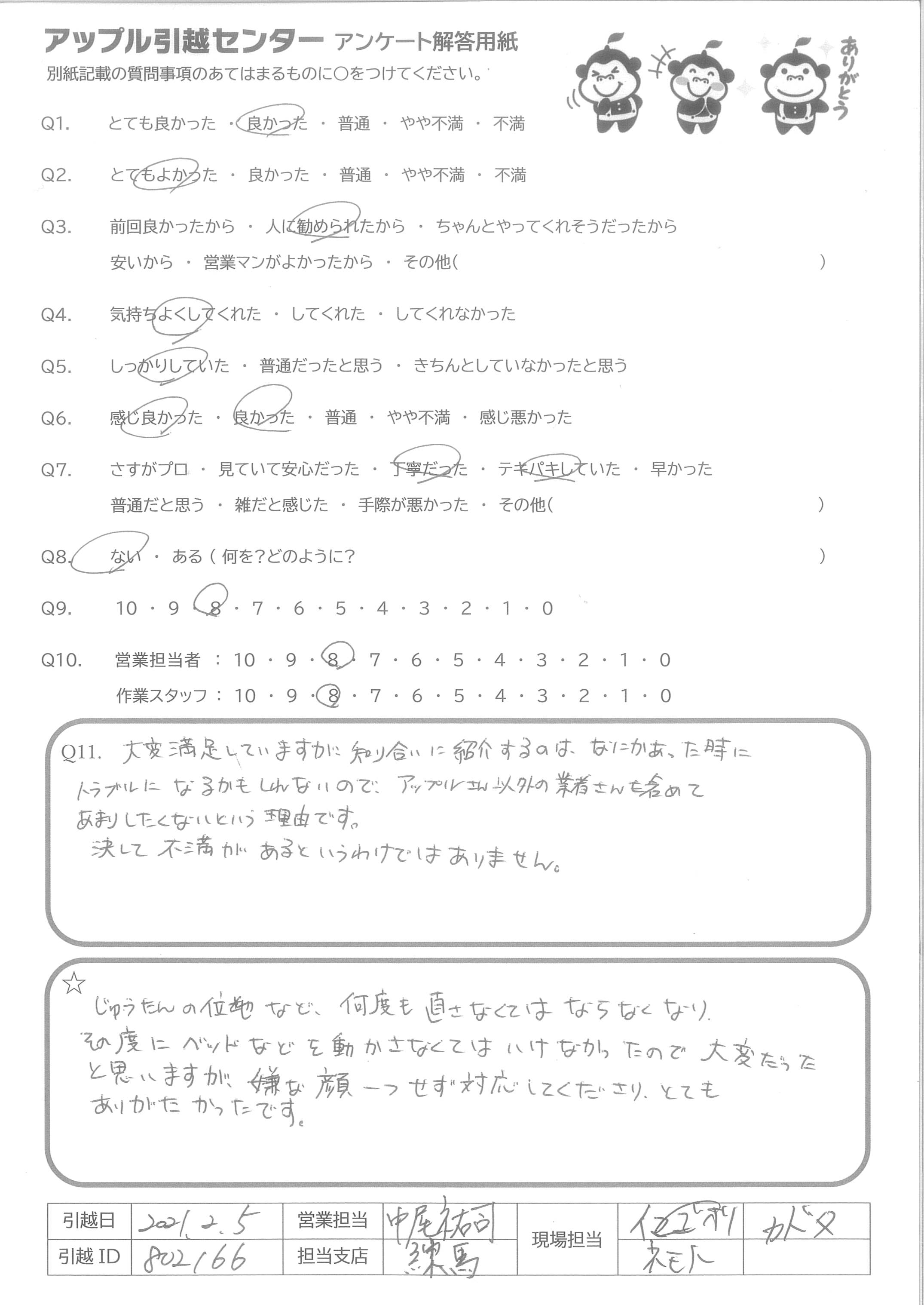 A.初めて業者の方に来てもらって引っ越しだったので不安でしたが、スタッフの方々がテキパキ動いてくださり、対応も丁寧でした。他の会社よりも安かったので選びましたが、正解だったと本当に思います。