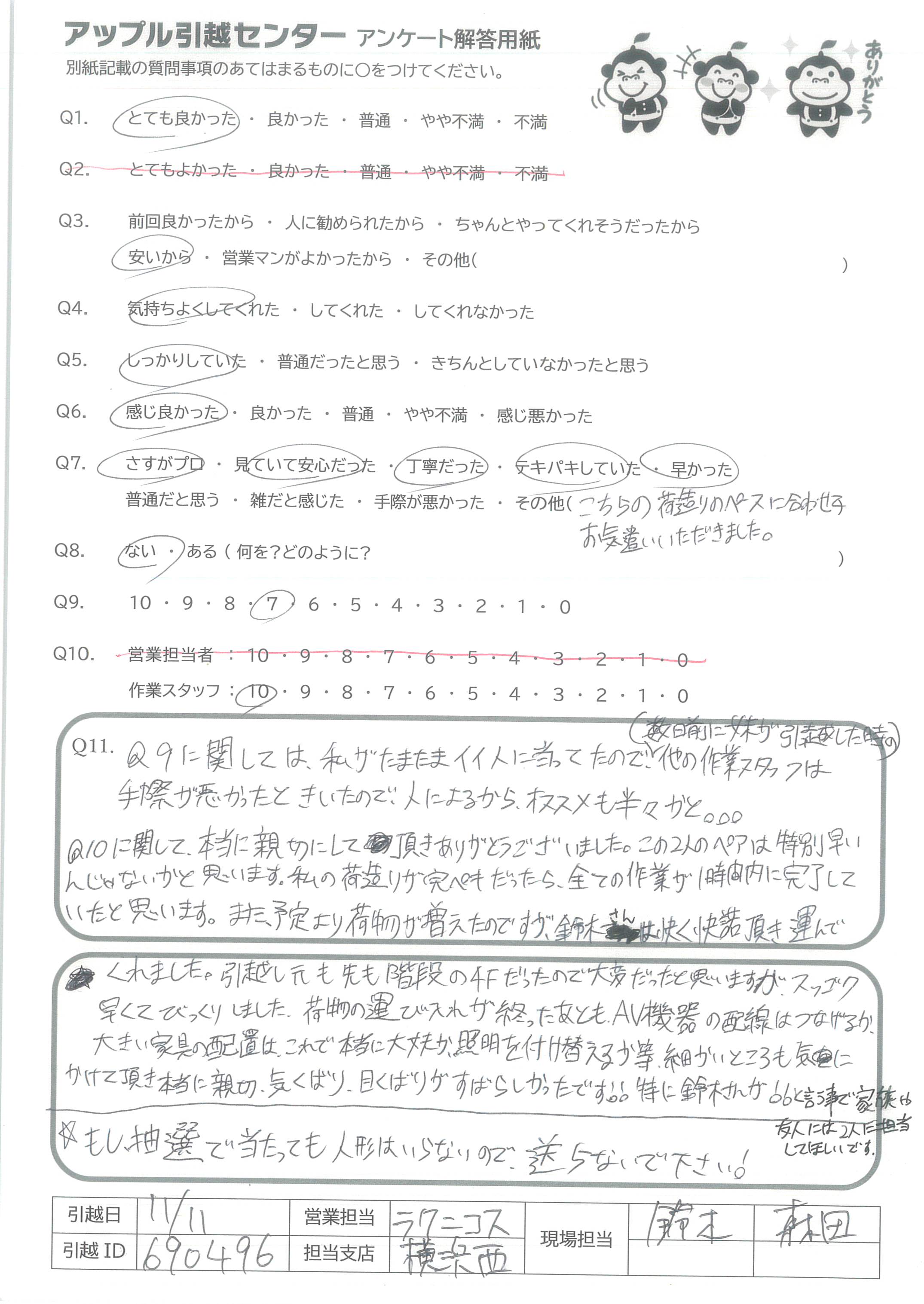 A.Q9に関しては、私がたまたまイイ人に当ってたので、(数日前に妹が引越した時の)他の作業スタッフは手際が悪かったときいたので、人によるからオススメも半々かと。。。 Q10に関して、本当に親切にして頂きありがとうございました。この2人のペアは特別早いんじゃないかと思います。私の荷造りが完ペキだったら、全ての作業が1時間内に完了していたと思います。また予定より荷物が増えたのですが、鈴木さんは快く快諾頂き運んでくれました。引越し元も先も階段の4Fだったので大変だったと思いますが、すっごく早くてびっくりしました。荷物の運び入れが終ったあともAV聴きの配線はつなげるか、大きい家具の配置はこれで本当に大丈夫か、照明を付け替えるか等、細かいところも気にかけて頂き本当に親切、気くばり、目くばりがすばらしかったです!!特に鈴木さんが!!と言う事で家族や友人には2人に担当してほしいです。