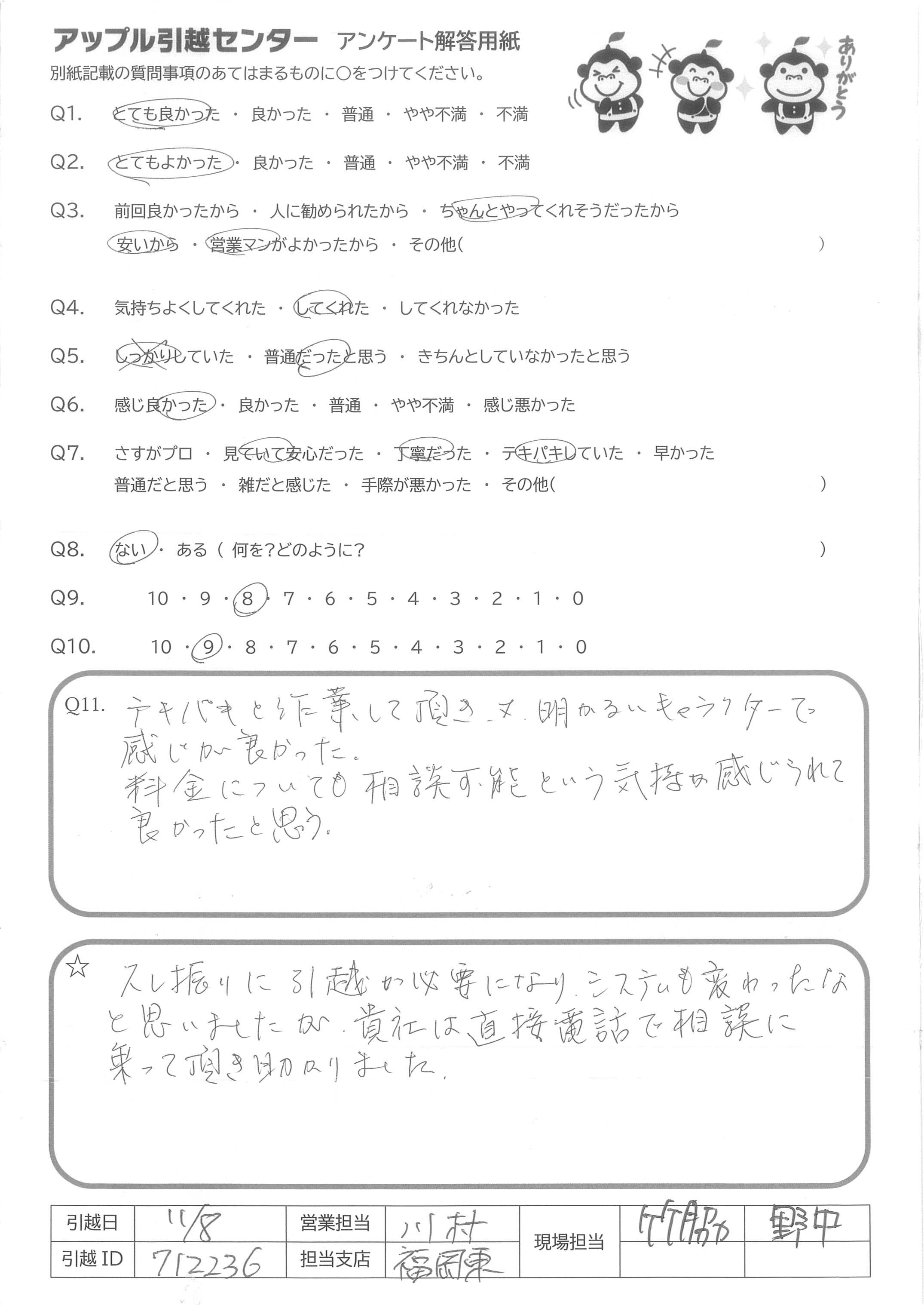 A.作業が早く丁寧で、作業の方もとても感じ良かったので、また引っ越しがあるときはこちらにお願いしたいと思いました。