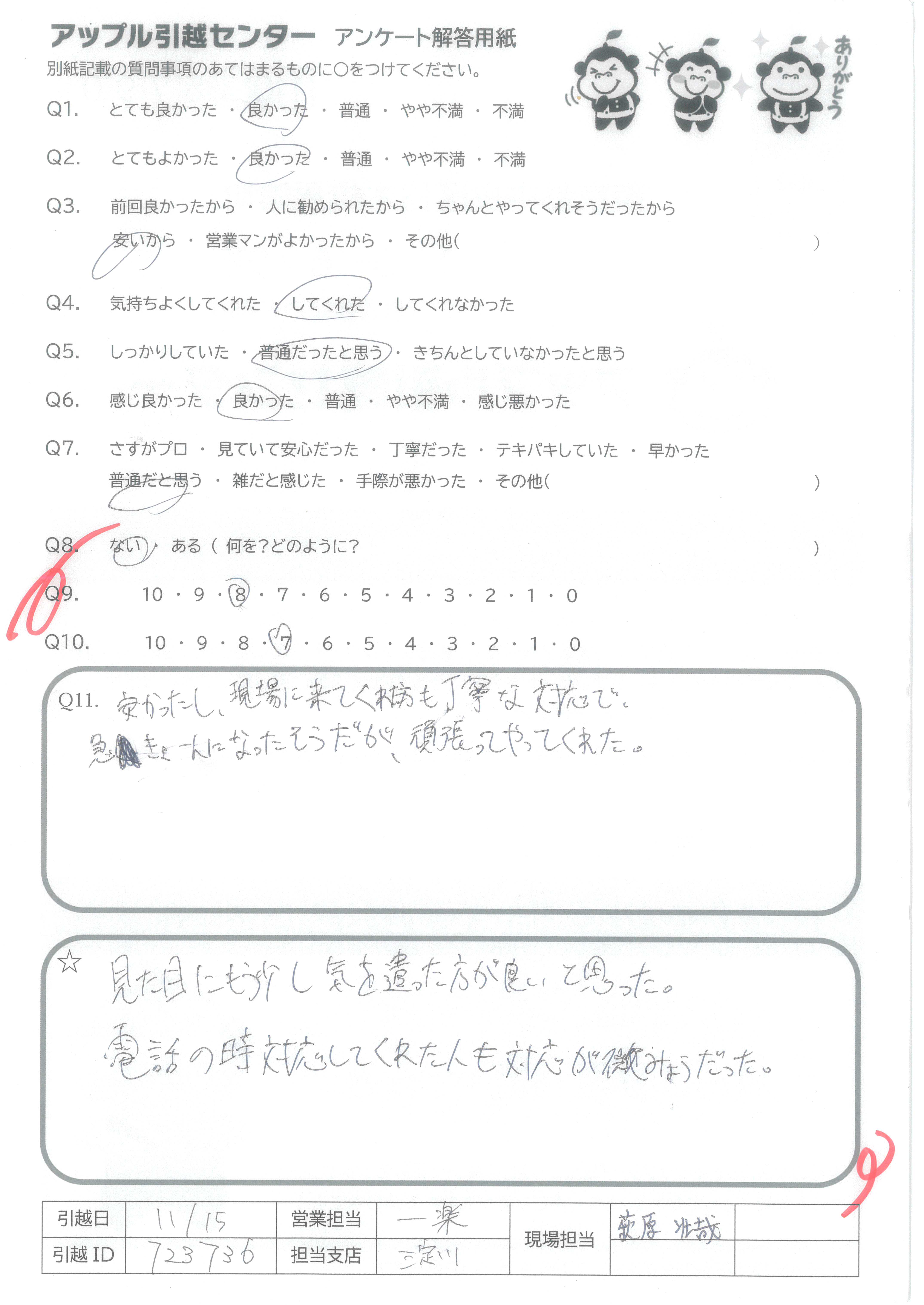 A.↓下の欄にクレームを書きましたが Q9.価格が安い、スタッフの感じが良い為 Q10.主要メンバーが遅れている為、最初に来られた「網島さん?」(※自己紹介がなかった為お名前が当っているか分かりませんが・・・)がとても感じ良く笑顔で一人でテキパキと、この方は丁寧に次から次へと荷物を運びだし、さすがプロだなと感じました。 後からヘルプで来られた「松本さん?」はいちいち発言が面白くて、たくさん笑わせて頂きました。 現場スタッフの皆さん、テキパキと仕事して頂きありがとうございました。