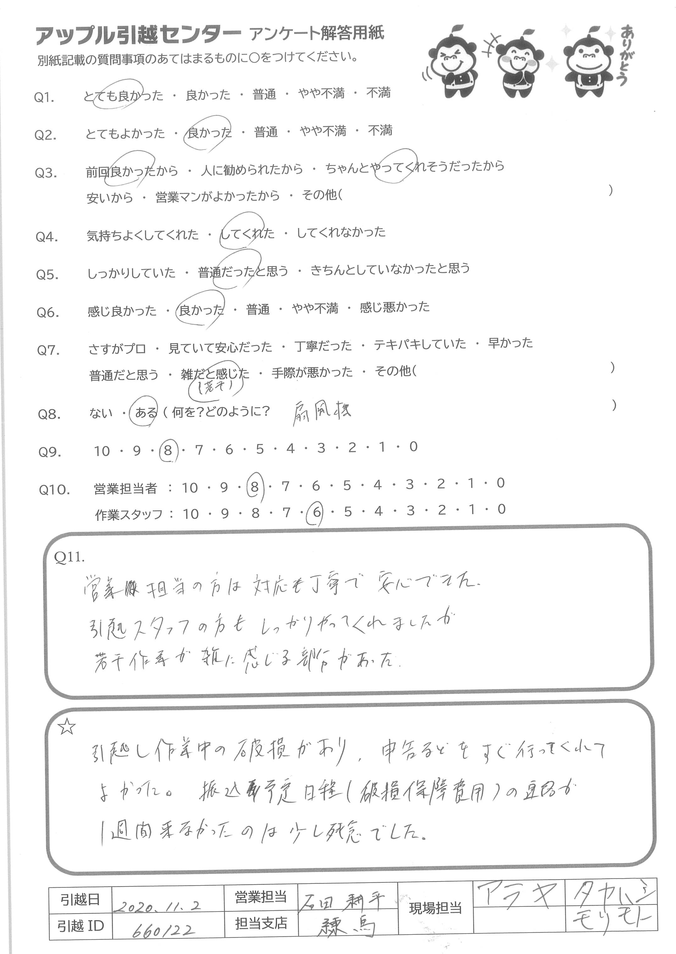A.引越し作業中の破損があり、申告るとをすぐ行ってくれてよかった。振込予定日程(破損保証費用)の連絡が1週間来なかったのは少し残念でした。