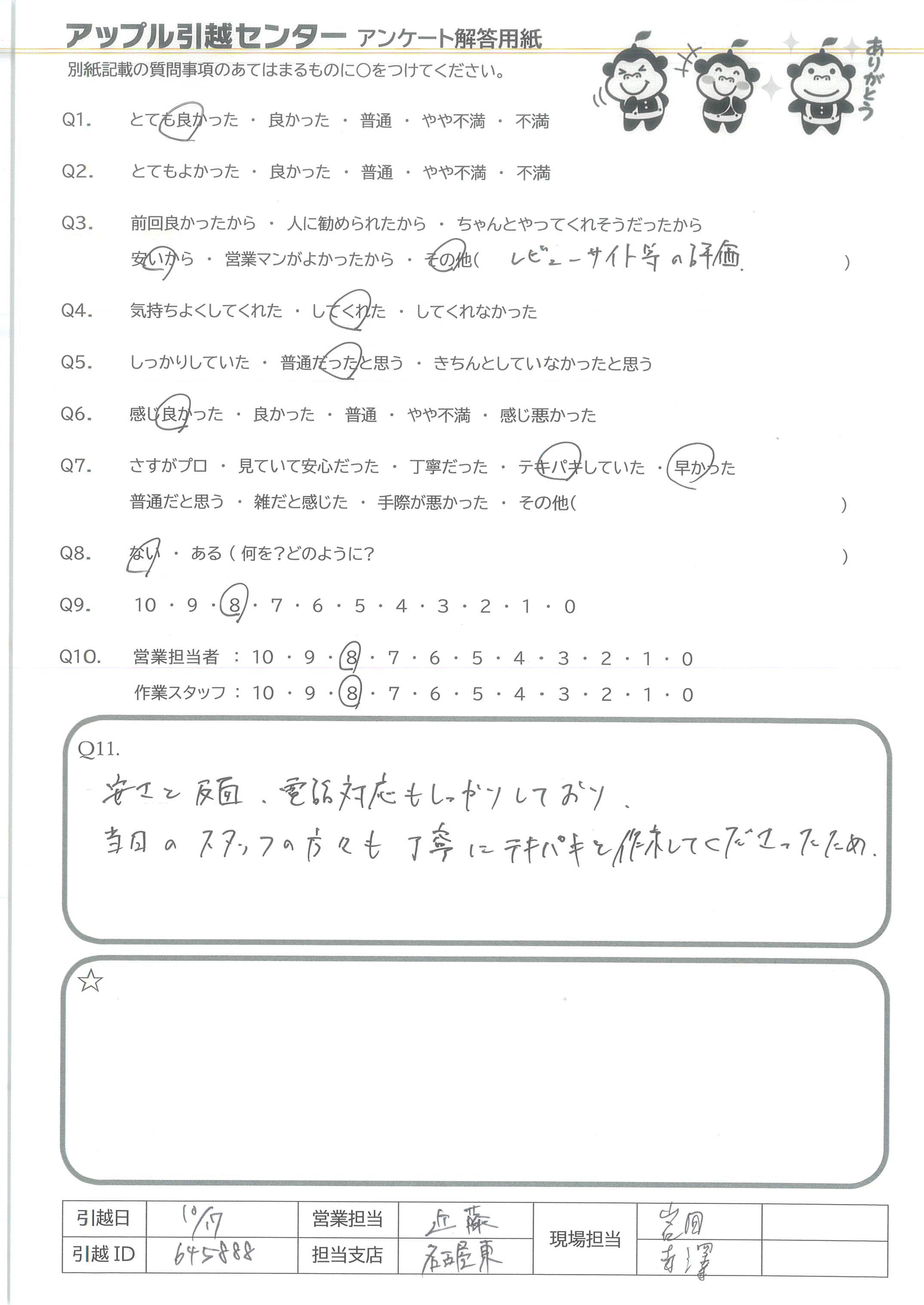 A.前回の引っ越しでもお世話になりました。丁寧で細々とした物品の運搬も快く受けてくださいました。また、直前の日程変更にも対応いただき、ありがたかったです。