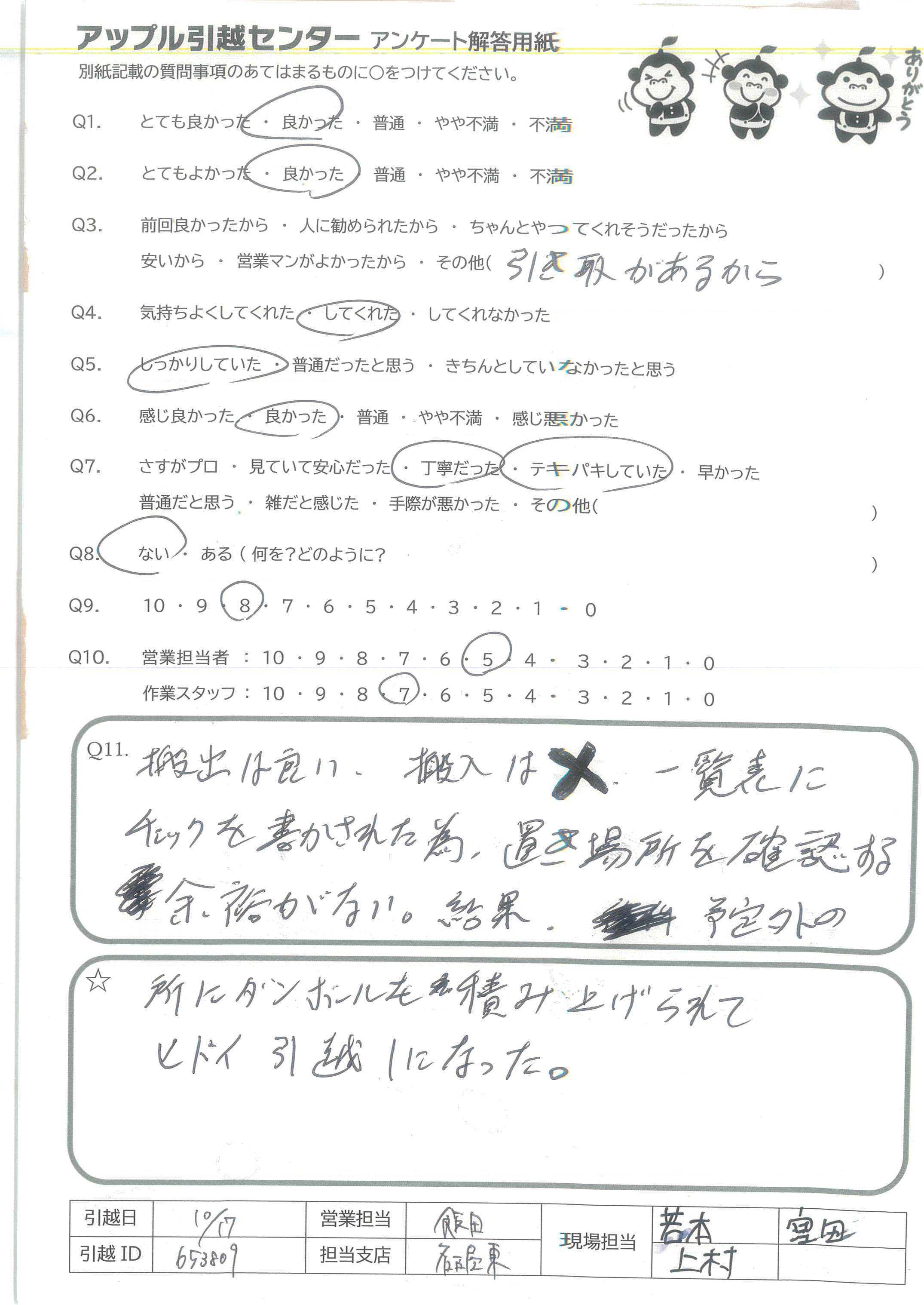 A.引越し当日の作業に関しては、過不足のないコミュニケーションで丁寧かつテキパキとご対応いただきました。 一方で、段ボールの届出が忘れていたり、回収の日程が希望日から5日遅れの提示など、周辺業務については、少し不満ありでした。