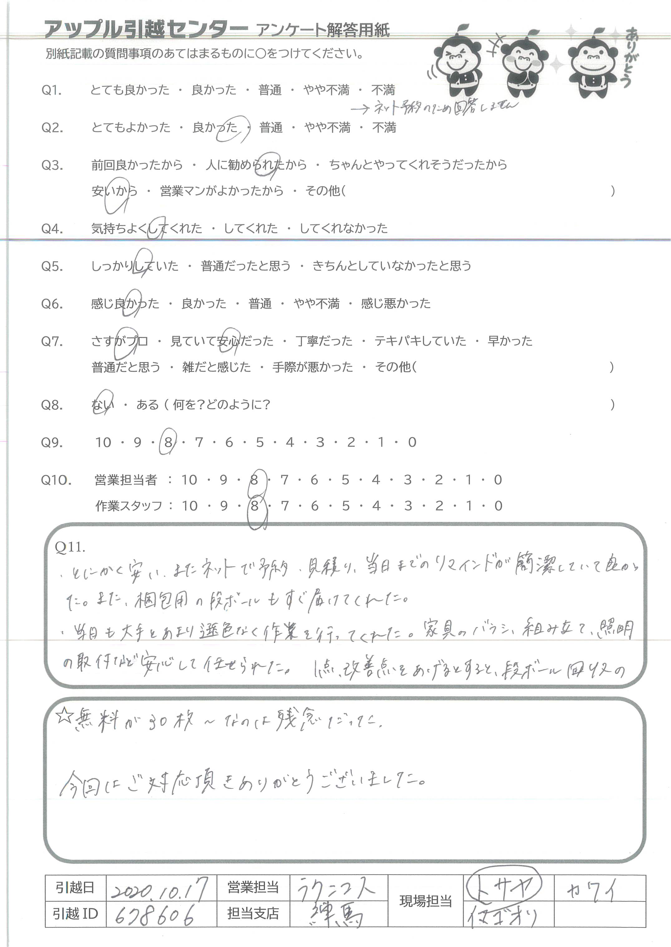 A.とにかく安い、またネットで予約見積り、当日までのリマインドが簡潔していて良かった。また、梱包用の段ボールもすぐ届けてくれた。 当日も大手とあまり遜色なく作業を行ってくれた。家具のバラシ、組み立て、照明の取付など安心して任せられた。1点、改善点をあげるとすると、段ボール回収の無料が30枚~なのは残念だった。