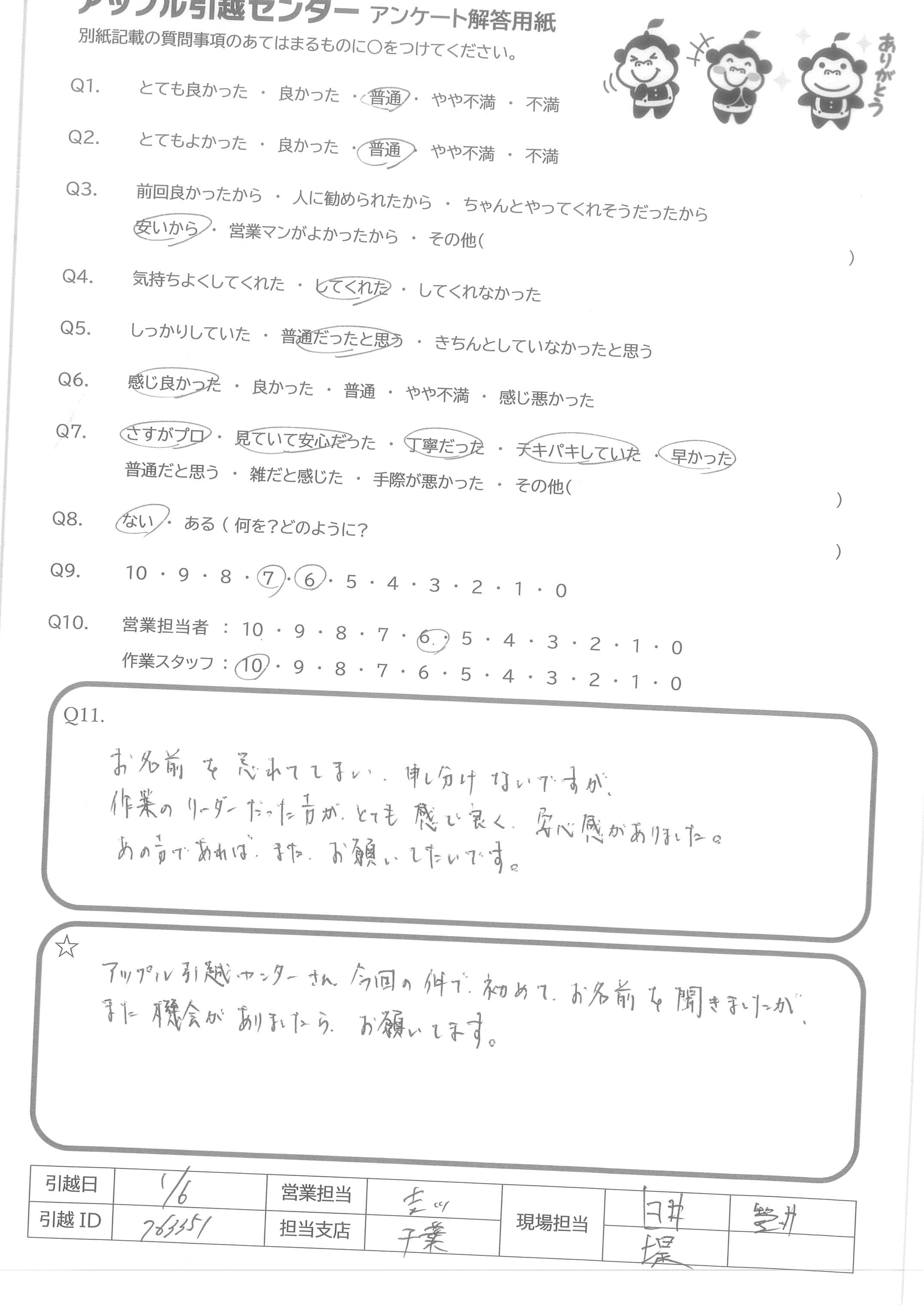 A.若本さん・片川さんの対応大変よかったです。 ・朝予定していた時間より速く来て頂けた分早く引越しができました。ありがとうございます。 一点あるとすれば、アップル引越センターで行っている買取りサービス等の内容把握が出来ていなかった所が残念でした。原いているからには、御社のサービス内容を把握して提供できるまでなっていたら、印象が変わっていたと思います。 これからも頑張ってください。