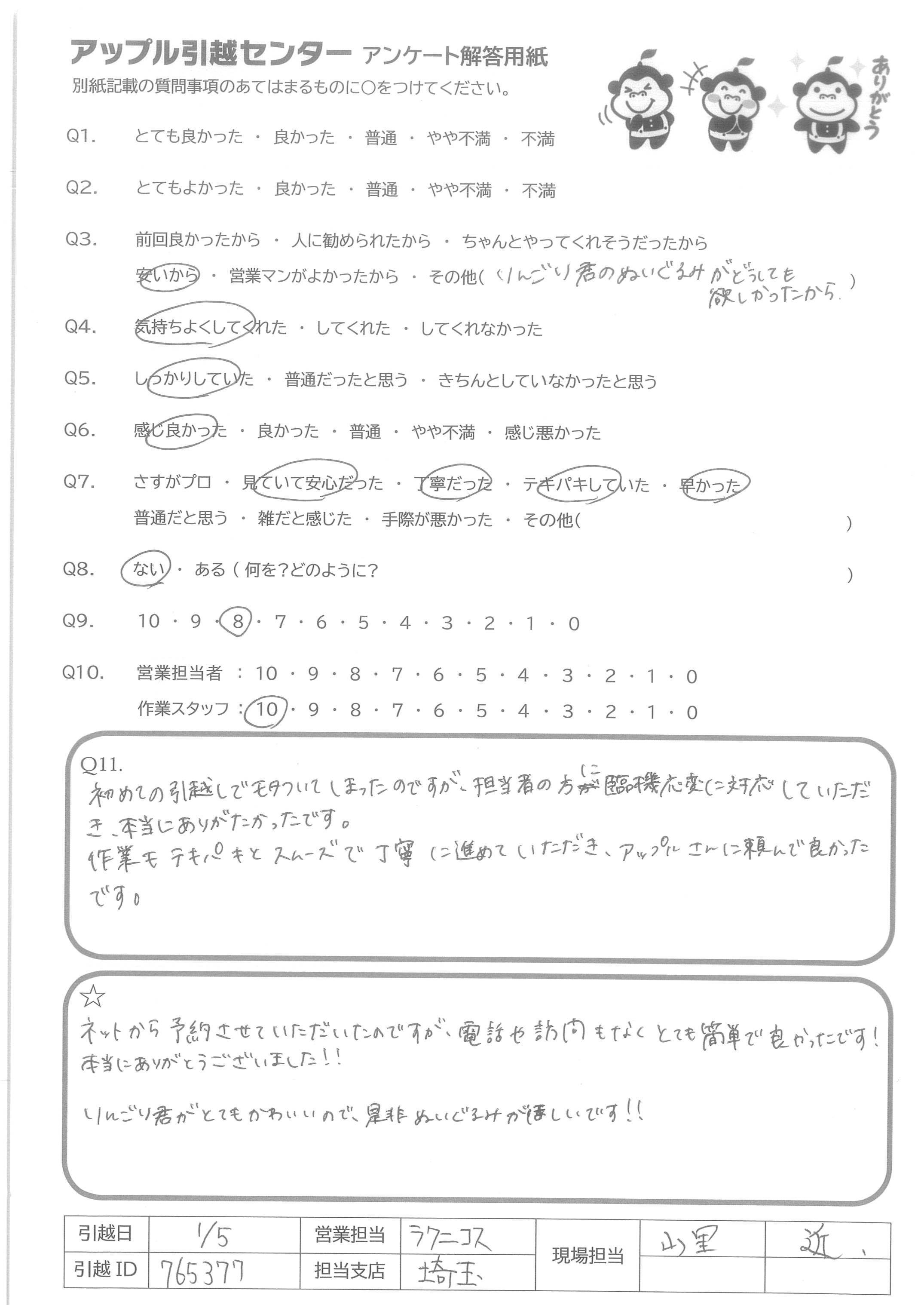 A.おかげさまでスムーズに引越しすることができました。 ご対応いただきありがとうございました!