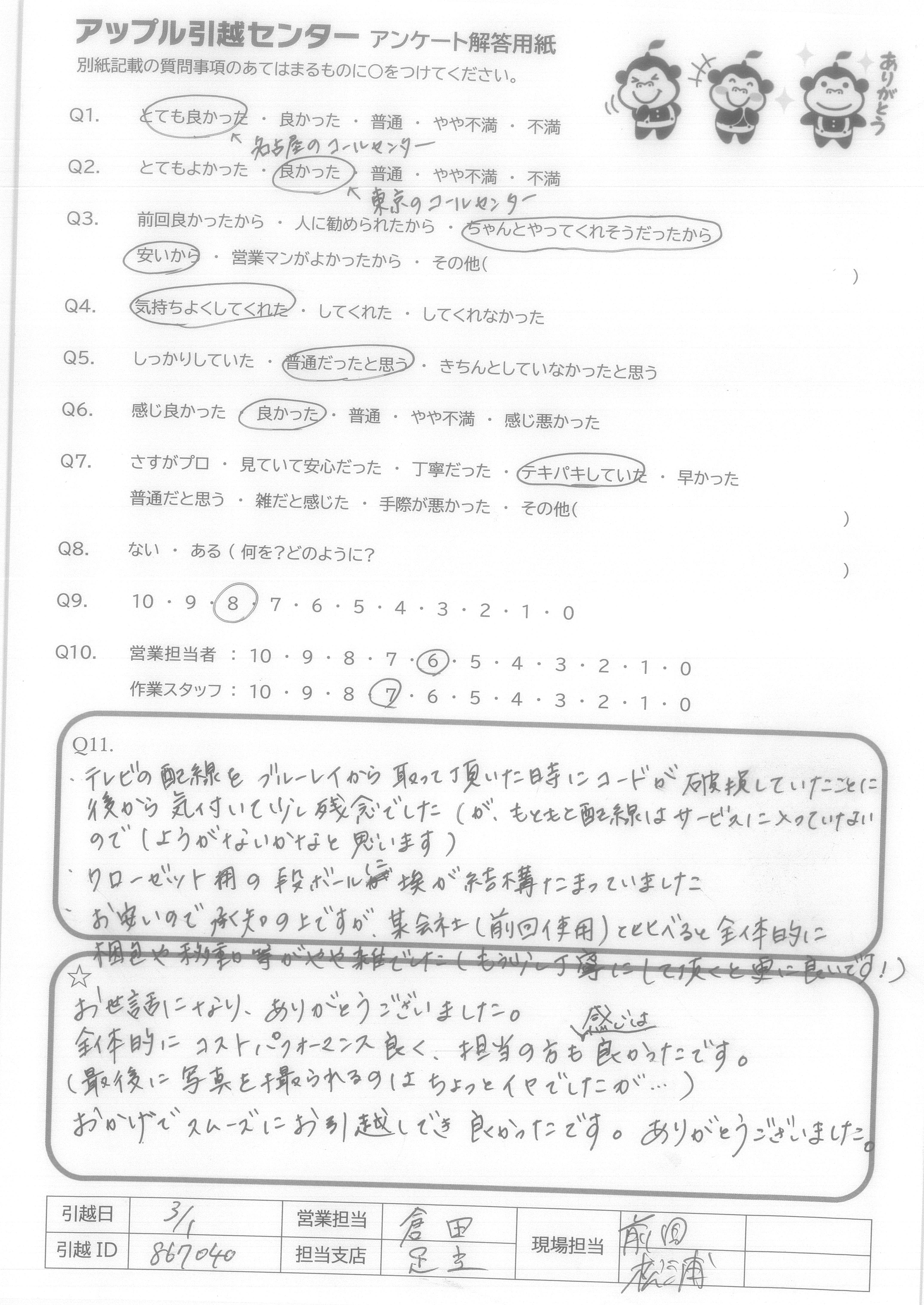 A.お世話になり、ありがとうございました! また引越しがあるときは、次もアップルさんにお願いすると思います。