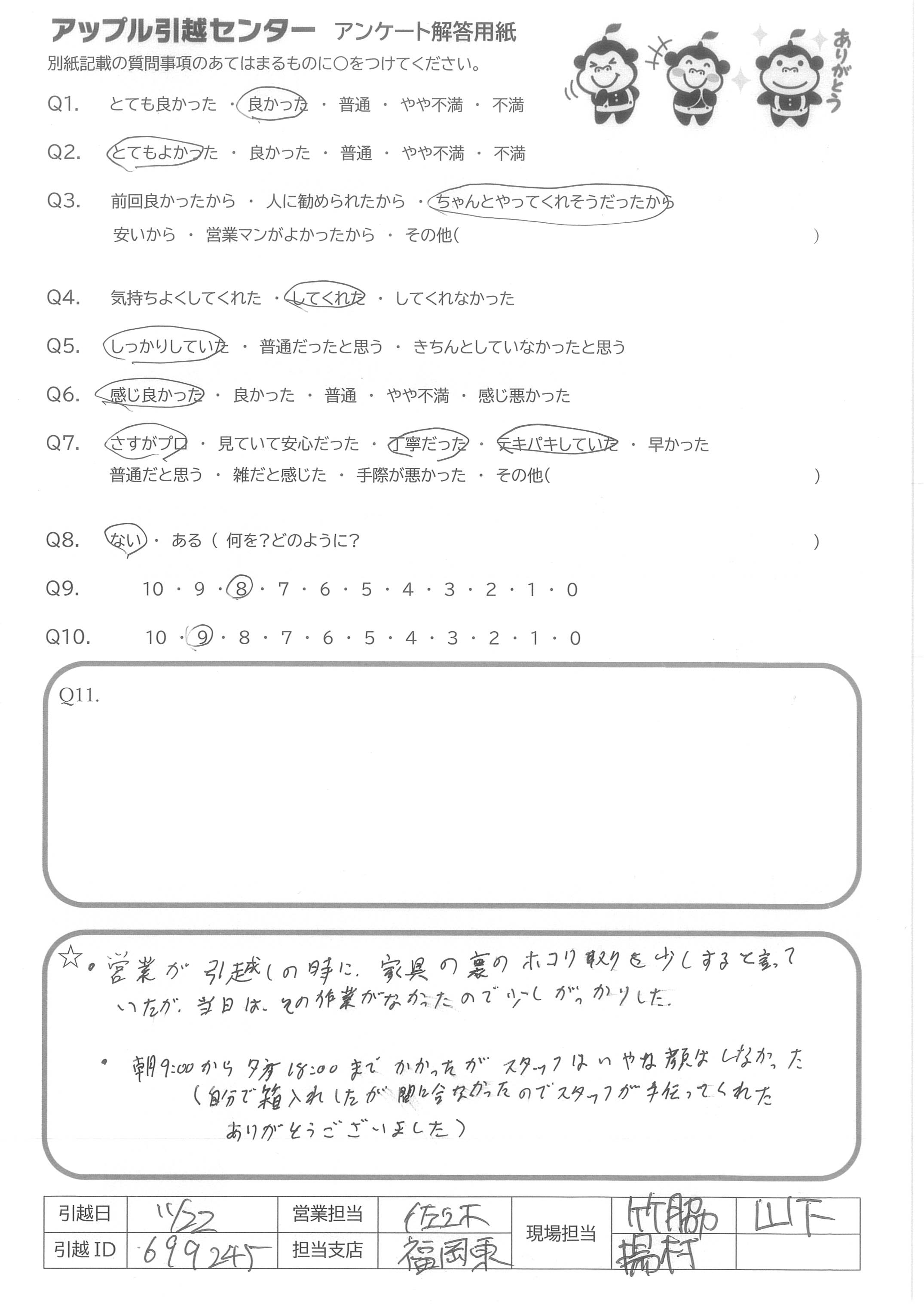 A.・営業が引越しの時に、家具の裏のホコリ取りを少しすると言って いたが、当日は、その作業がなかったので少しがっかりした。 ・朝9:00から夕方18:00までかかったがスタッフはいやな顔はしなかった (自分で箱入れしたが間に合わなかったのでスタッフが手伝ってくれた ありがとうございました)