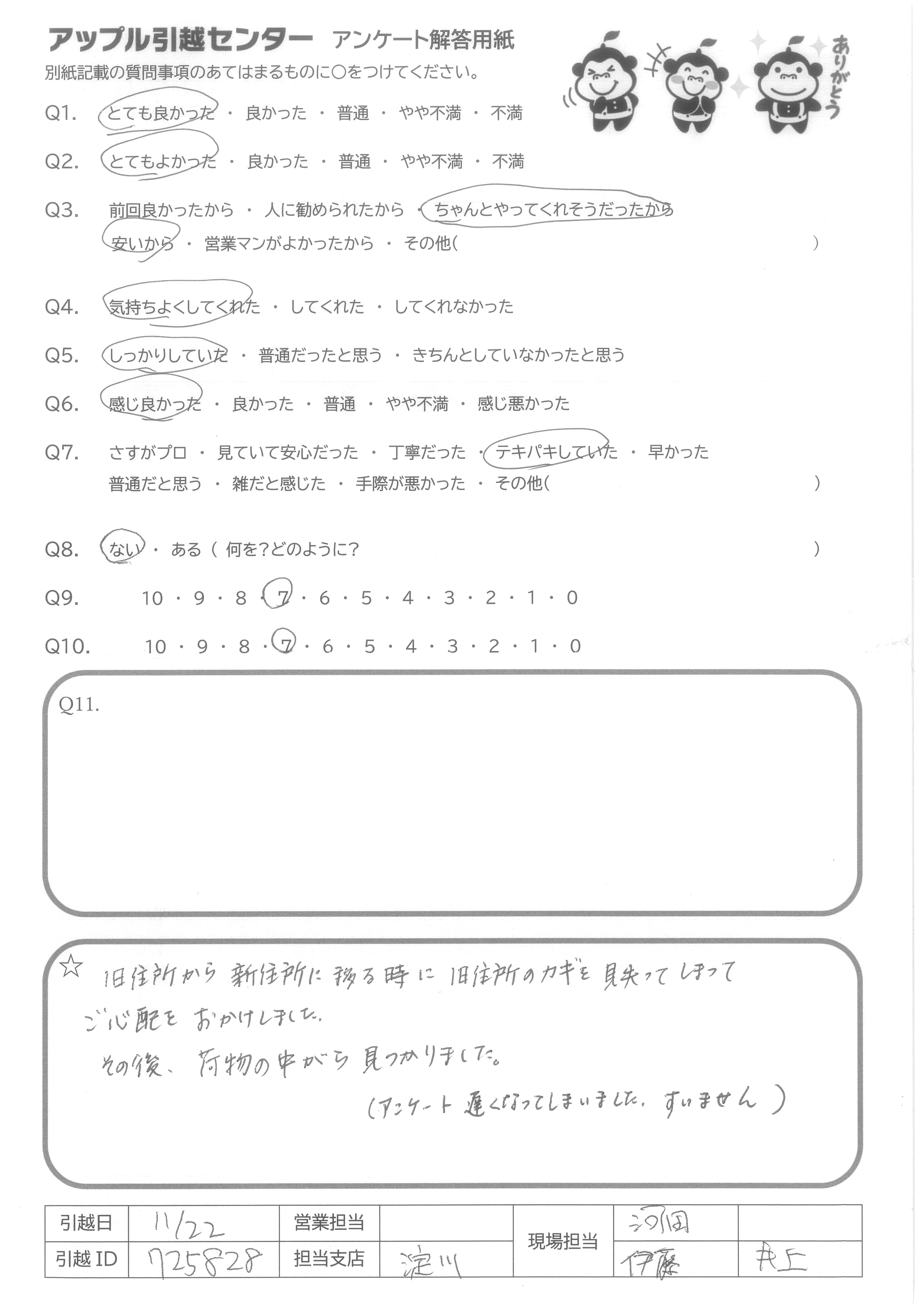 A.旧住所から新住所に移る時に旧住所のカギを見失ってしまって ご心配をおかけしました。 その後、荷物の中から見つかりました。 (アンケート遅くなってしまいました。すいません)