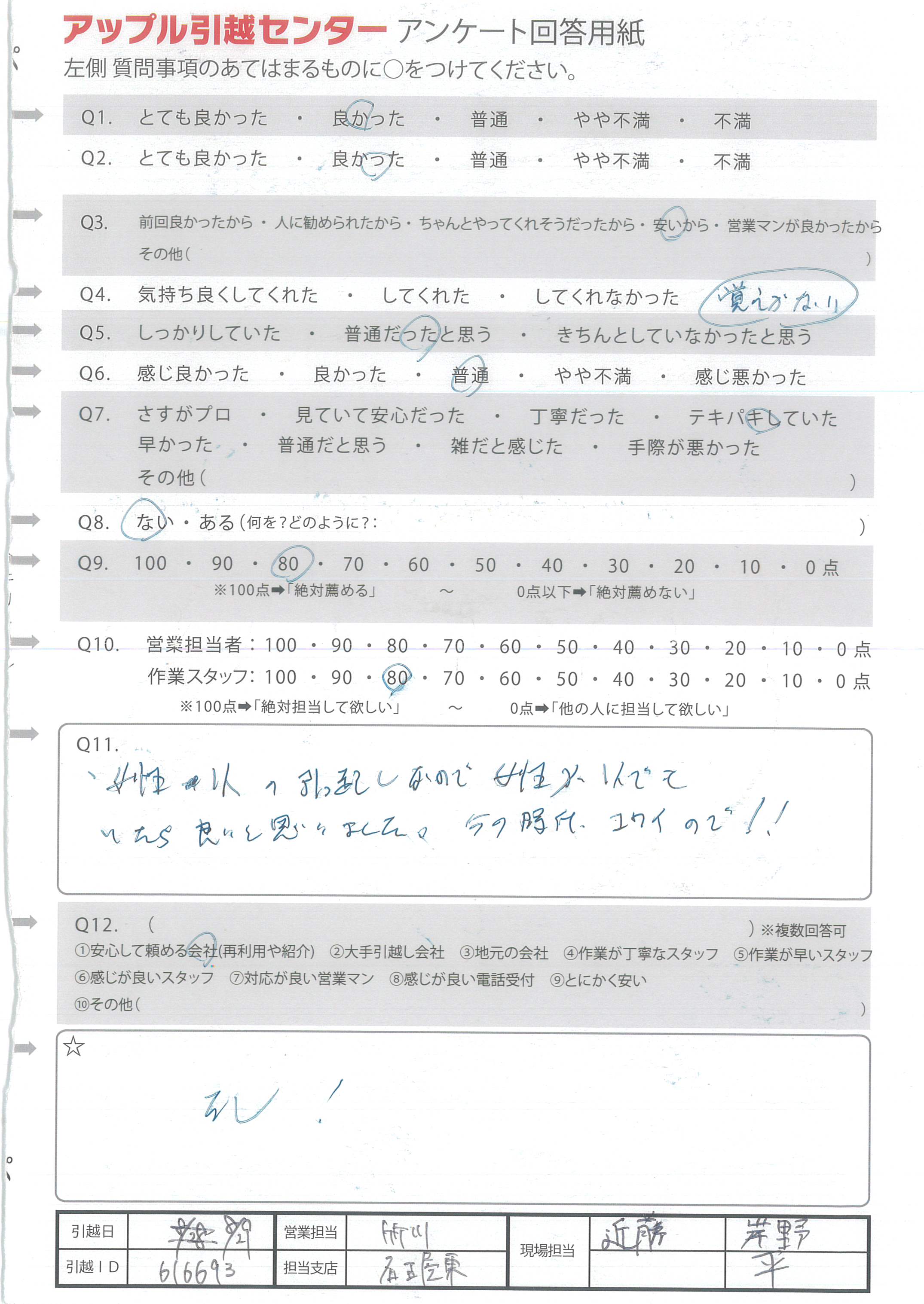 A.今回はお世話になりました。営業の方の対応の良さと2万円で依頼できるとの事でこちらでお願いをしました。2つ意見があります。洗濯機の取付ですが、脱水の時にもしかしたら水が漏れるかもしれないと言われました。「どうすればいいんですか?」と聞いたら「しょうがない」と言われました。しょうがないとは何だと思いましたが洗濯機から1メートルくらいの距離で確認したところ漏れは確認できなかったのでそこで話は終わりました。最後にトラックの荷物の確認で外に出たとき写真を撮りましたがあれ断れないんですか?内心嫌だったけど承諾はしましたがせめてスタッフさん笑顔になってください。棒読み感、させられてる感が否めなかったです。部屋に戻って洗濯機が動いたままだったので止めようと洗面所に行ったら床が水びたしでした。外に戻ってスタッフの方に声かけようと思いましたが何せ2万円で引越をお願いしたのでこれ以上のお願いはと思い呼び止めませんでした。結局私が務めている会社の人に見てもらったところホースが長すぎて余ってしまい排水する穴にちゃんとはまっていないみたいな感じでした。1分で直りました。洗濯機を設置していただいた方はプロの方でしょうけ?せめて「しょうがない」の一言で終わるのではなく原因を伝えたほうが客は納得すると思います。知人にお願いしたので料金は掛かりませんでしたが、電気屋?などにお願いしたら料金は発生していたわけで結局他の引越業者と料金が変わらないなら意味ないと思いました。今回のスタッフさんは少し残念でしたが、また引越する事があればお願いしたいと思いました。ありがとうございました。