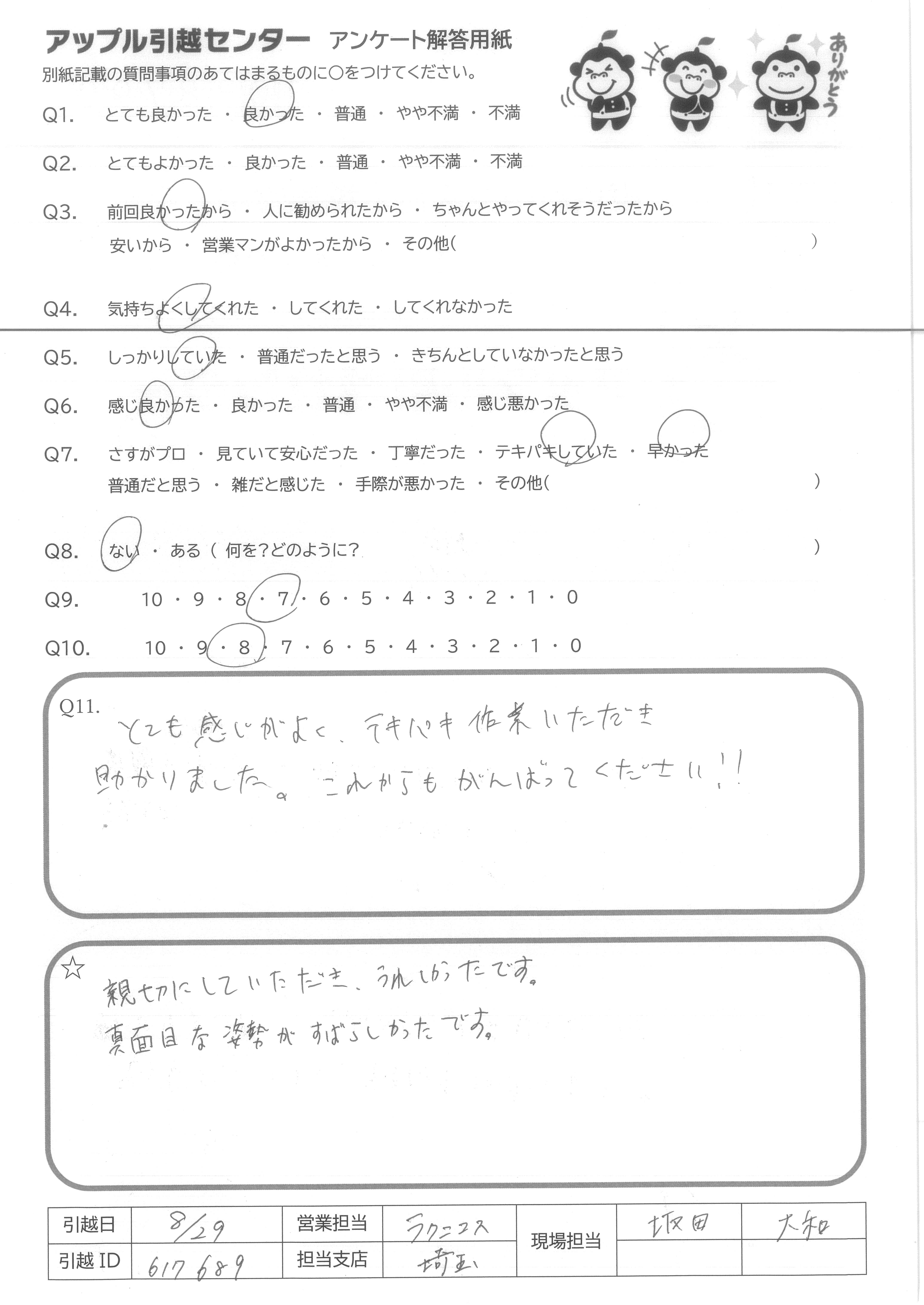 A.とても感じがよく、テキパキ作業いただき助かりました。これからもがんばってください!!