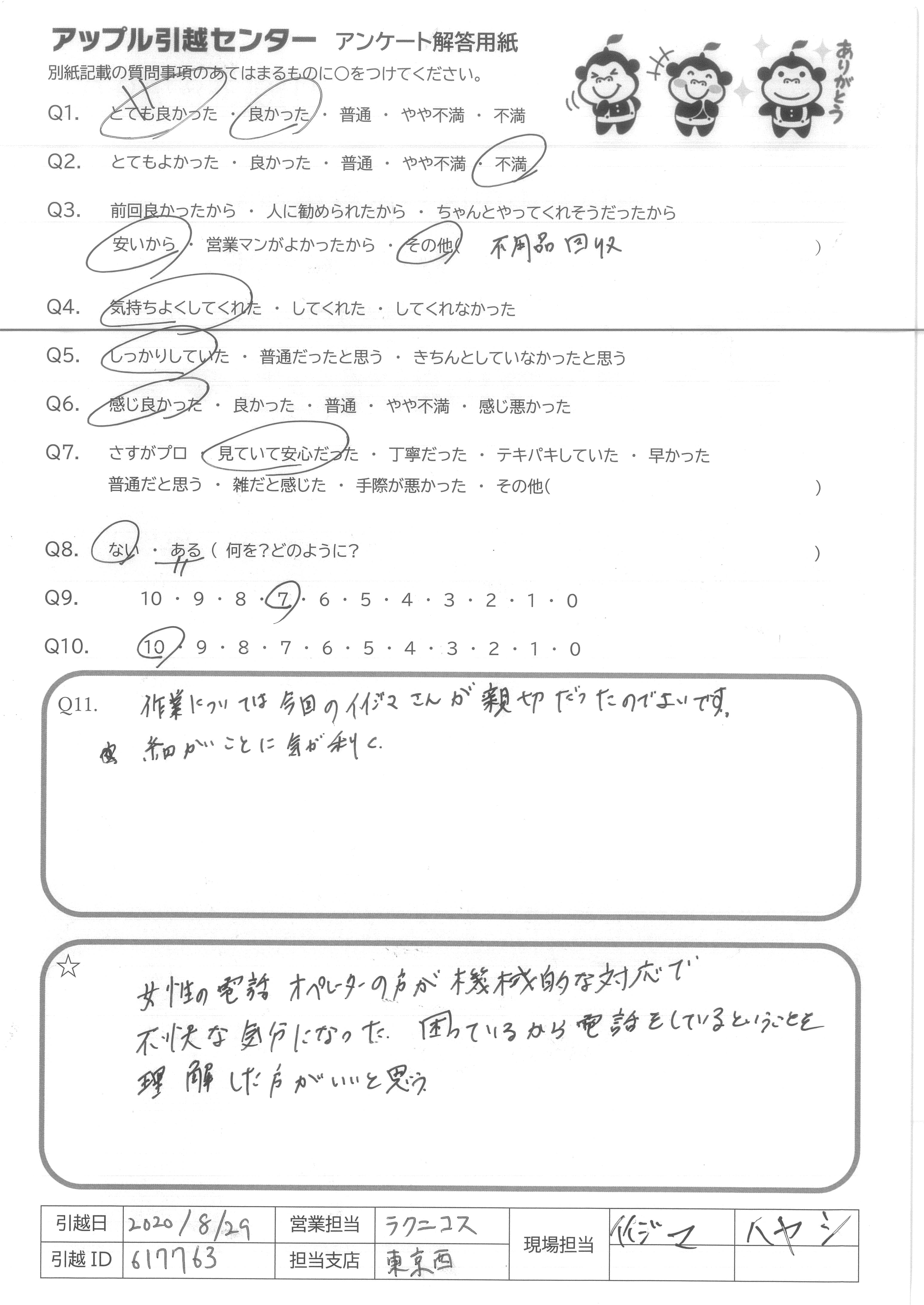 A.電話の対応がとてもよかったです。他の業者は長々と他社の話をするところもありましたし。話していて嫌な気はしなかったです。作業された方に関してはてきぱきと作業していただきました。暑い中ありがとうございました。