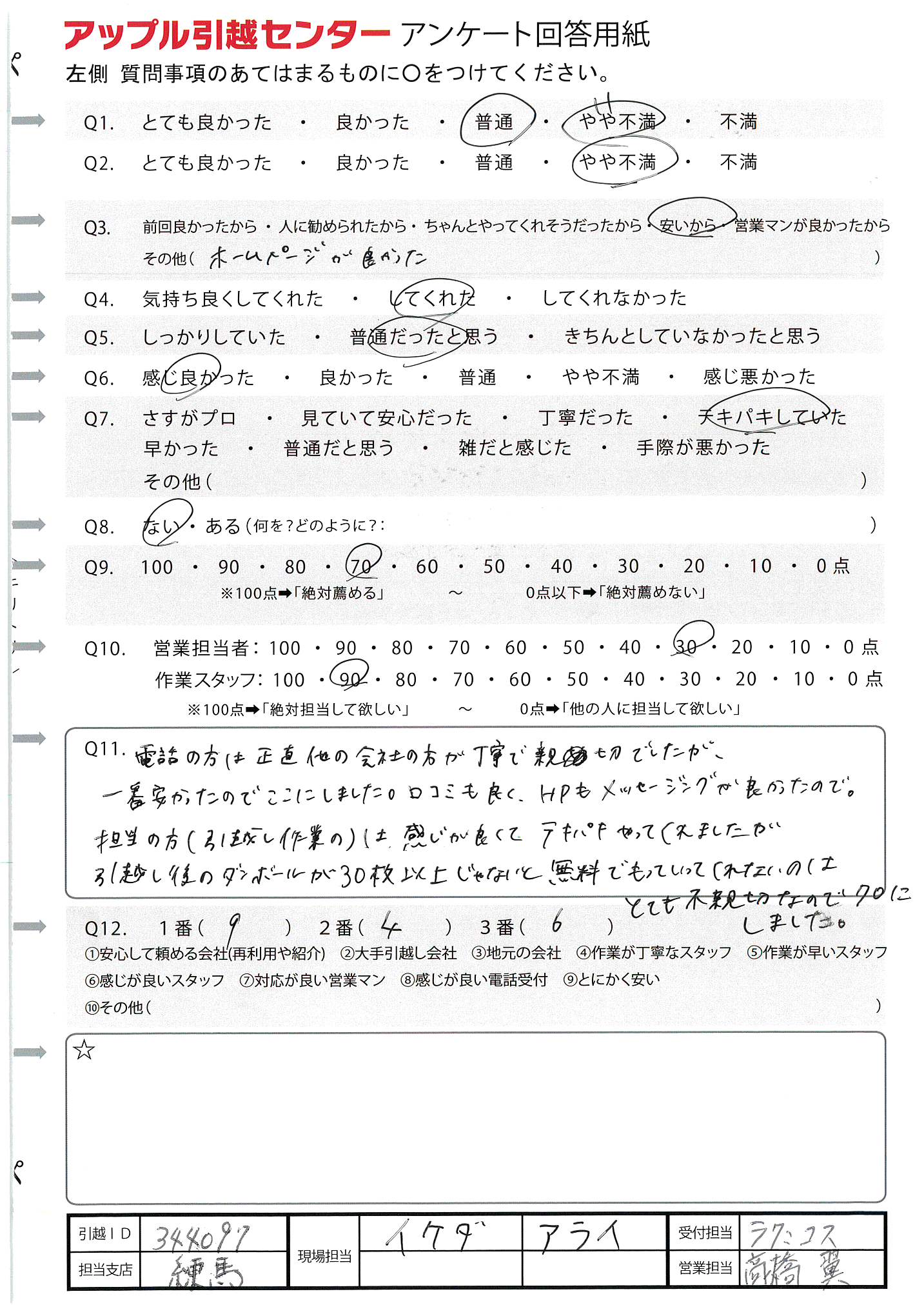 A.今回で3回目の利用になり、やっぱりアップルさんに頼んで良かったと感じた。引っ越しの度にライフスタイルが変化し荷物内容にも違いが出ているが、3回とも大満足の引っ越し内容でした。また今後引っ越しする際にもお願いしたいと感じている。