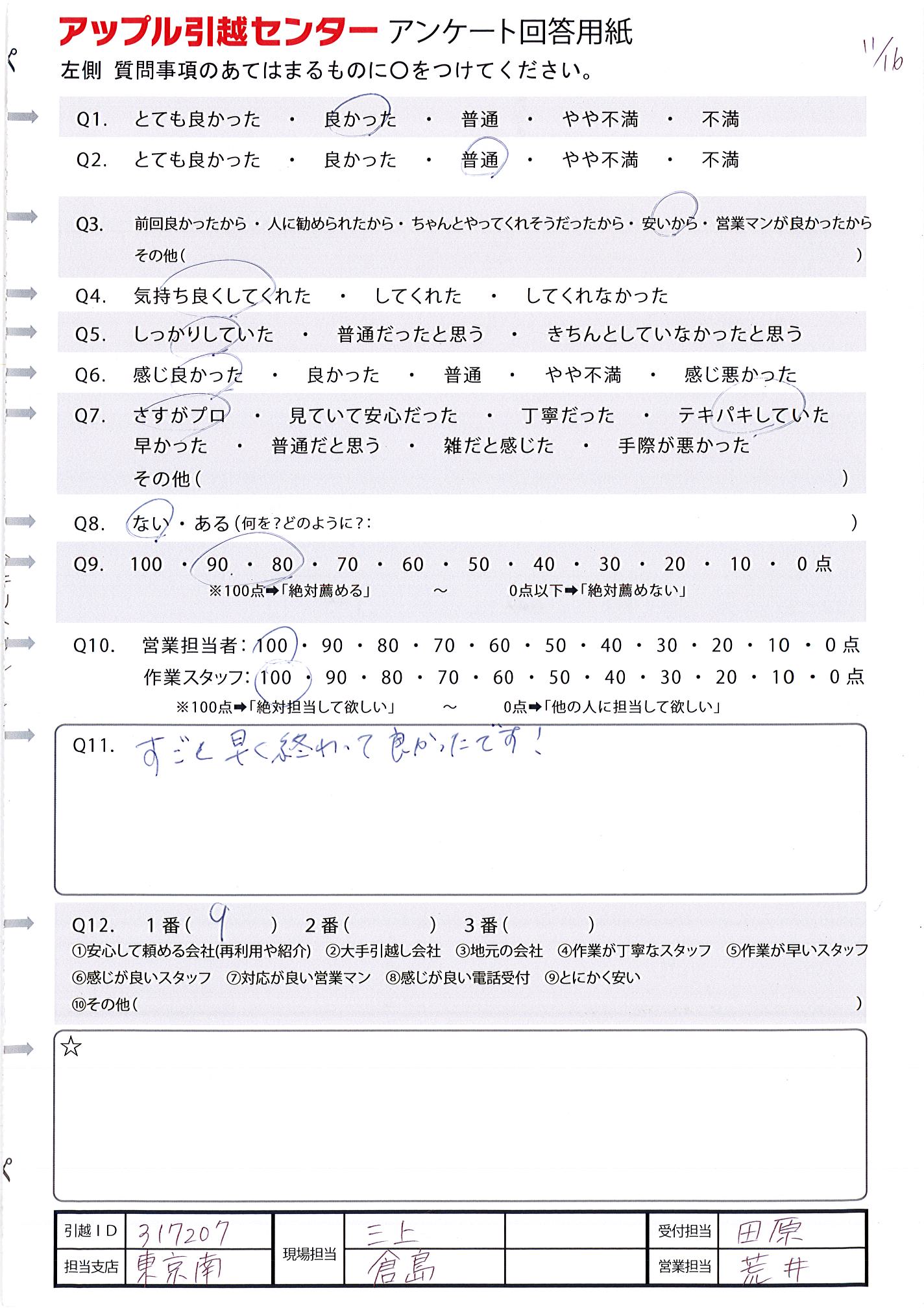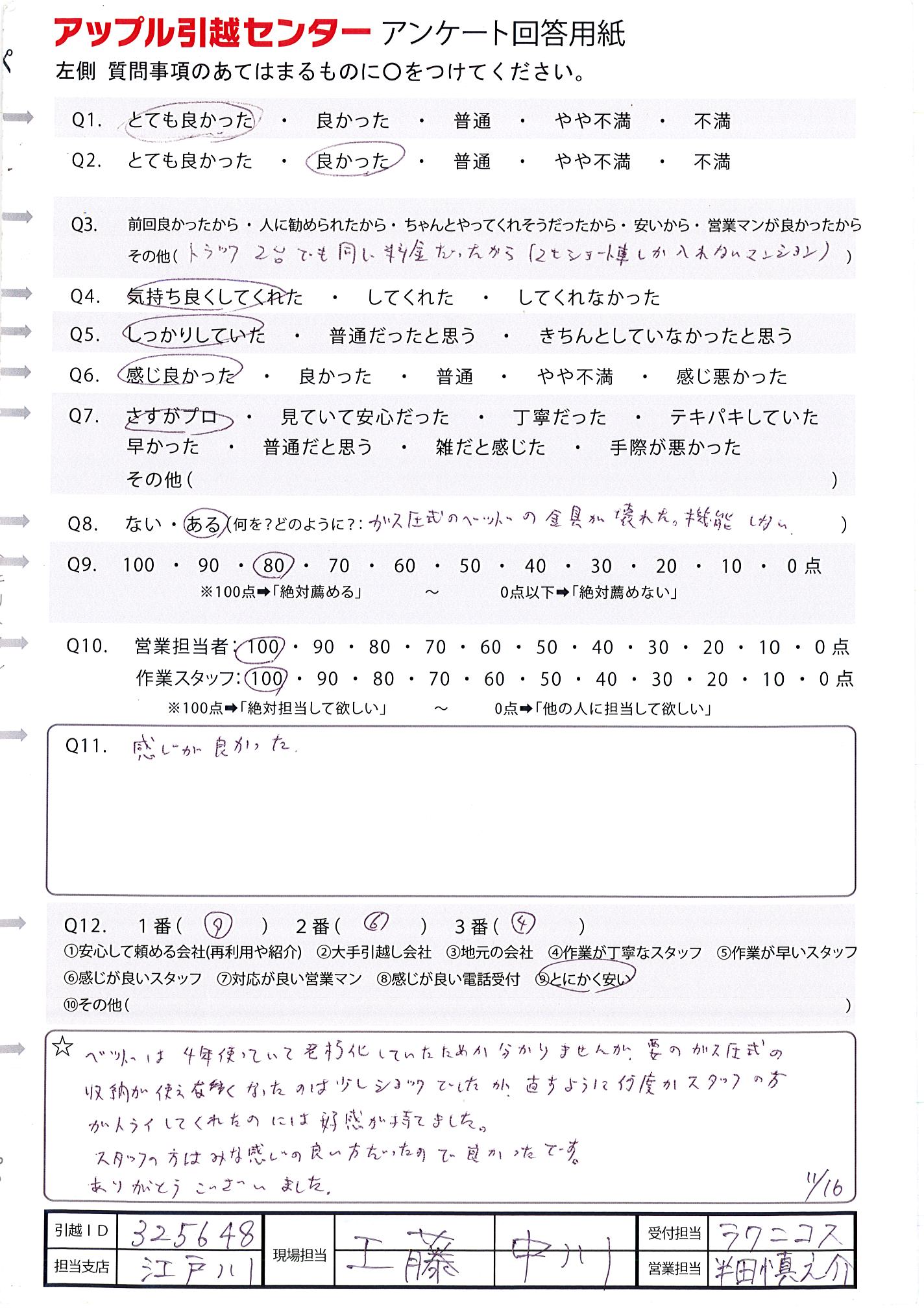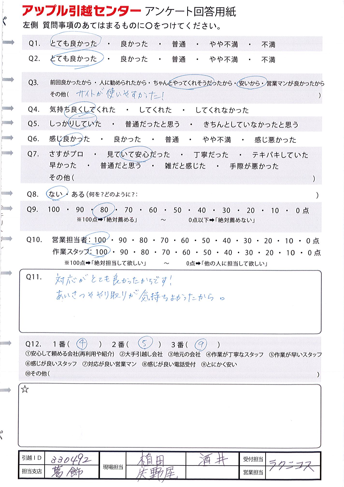 A.電話対応、作業の方、ともにしっかり対応して頂きました。 次の引越しの時もお願いしたいと思ったため。