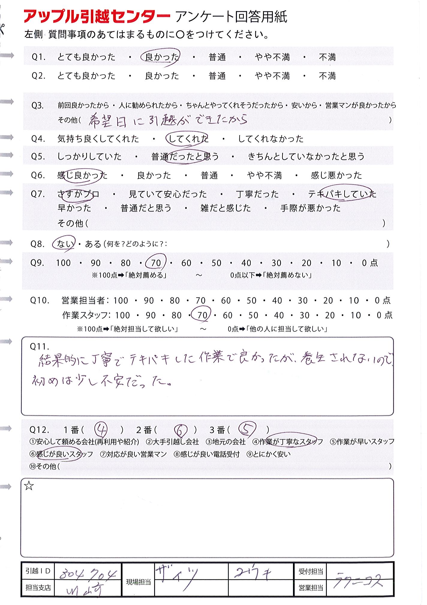 A.初めて業者さんにお願いしての引越しでしたが滞りなく終わって良かったです。 遠い所まで来ていただいてありがとうございました!