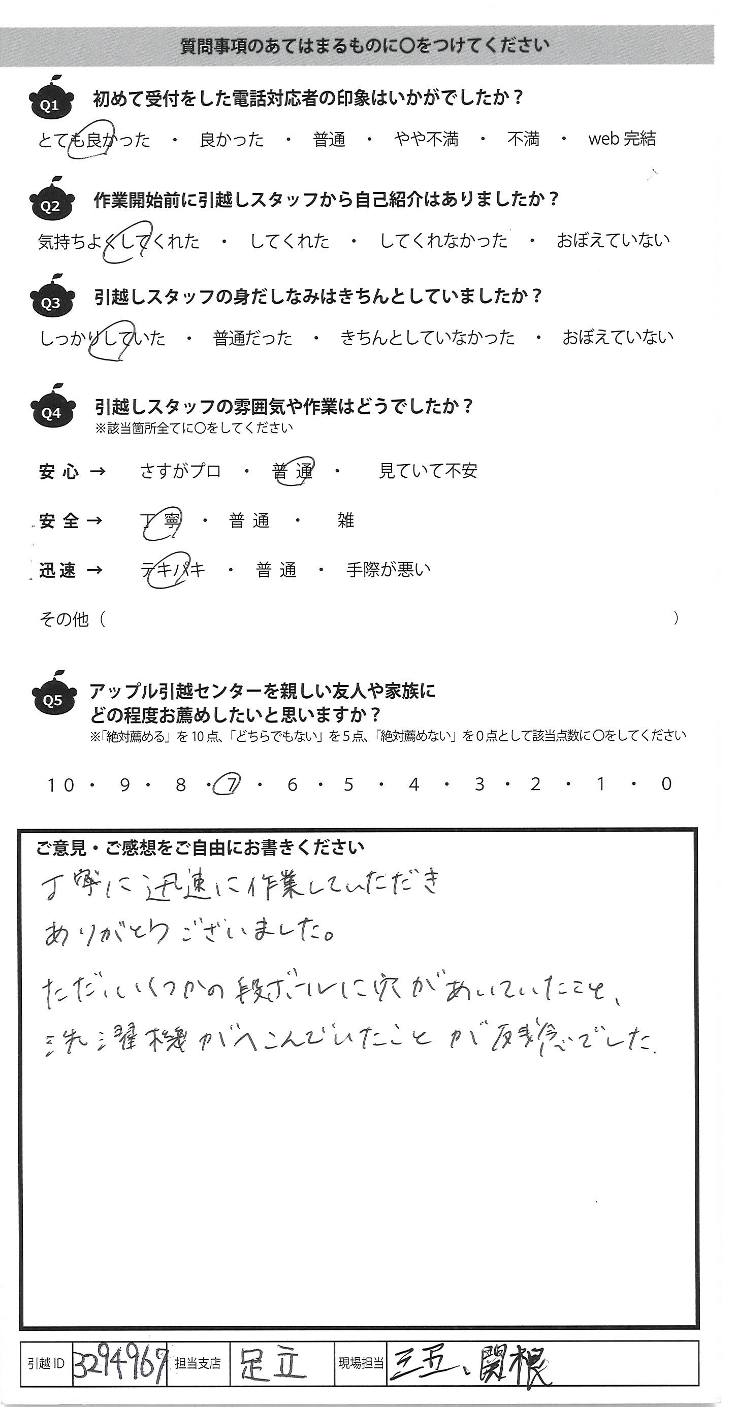 A.丁寧に迅速に作業していただき ありがとうございました。 ただいくつかの段ボールに穴があいていたこと、 洗濯機がへこんでいたことが残念でした。